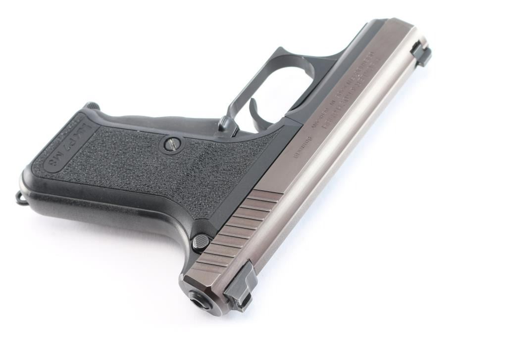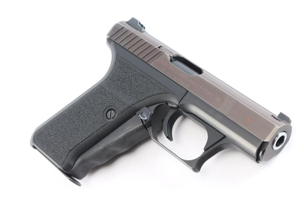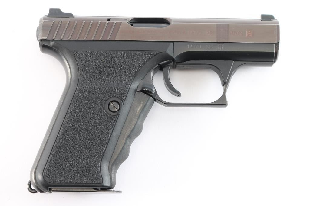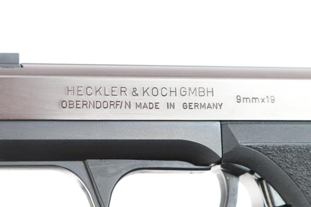 The German made 'Squeeze Cocker,' a striker fired semi-automatic pistol chambered in 9x19mm, manufactured circa 1994. This uniquely engineered pistol utilizes a gas-delayed-blowback system, and has a manual cocking/decocking lever integrated with the grip's front strap. Imported by HK Inc. of Sterling, V.A. with an import stamp on the right side on the slide. Pistol features a blued finish, 4.1" barrel with polygonal rifling & fluted chamber, dovetailed blade tritium front sight, dovetailed tritium rear sight, wide curved serrated trigger, large serrated trigger guard with polymer heat shield, ambidextrous paddle style magazine release on trigger guard, factory eight-round magazines, steel frame with lanyard loop, dual function manual cocking lever and slide release, lightly stippled grip straps, and two-piece stippled black polymer grips. The original blued finish retained is approximately 99% with very slight edge wear at the muzzle, and the finish is turning plum. Metal displays no rust or deformation. The action is smooth and crisp, and the grips are excellent. Bore is bright with strong polygonal rifling. The tritium night sights have dimmed. Pistol is in like-new condition, and includes the original black plastic factory box, manual, and two eight-round magazines total.