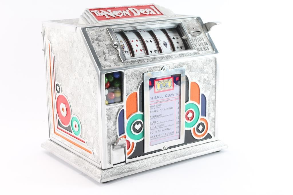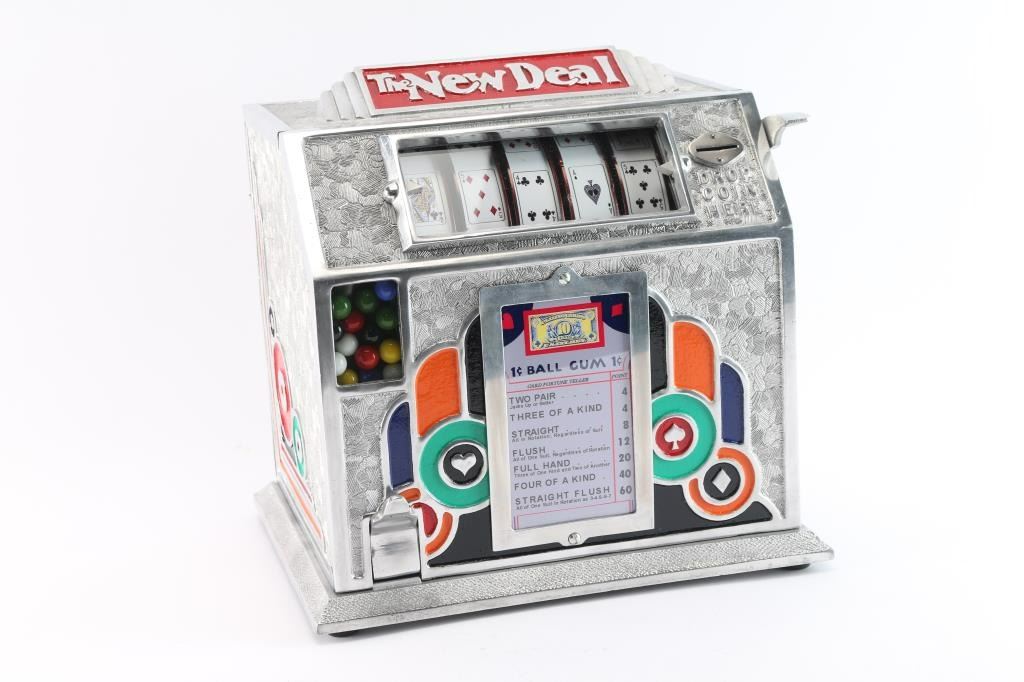 Freshly restored and fully serviced. Approximately 11" tall x 10 3/4" around. Countertop size with gum ball dispenser for prize. Used in bars and saloons for illegal gambling by pay out on the "sly" for different color gum balls. Deals poker hand when lever activated. A superb professional restoration.