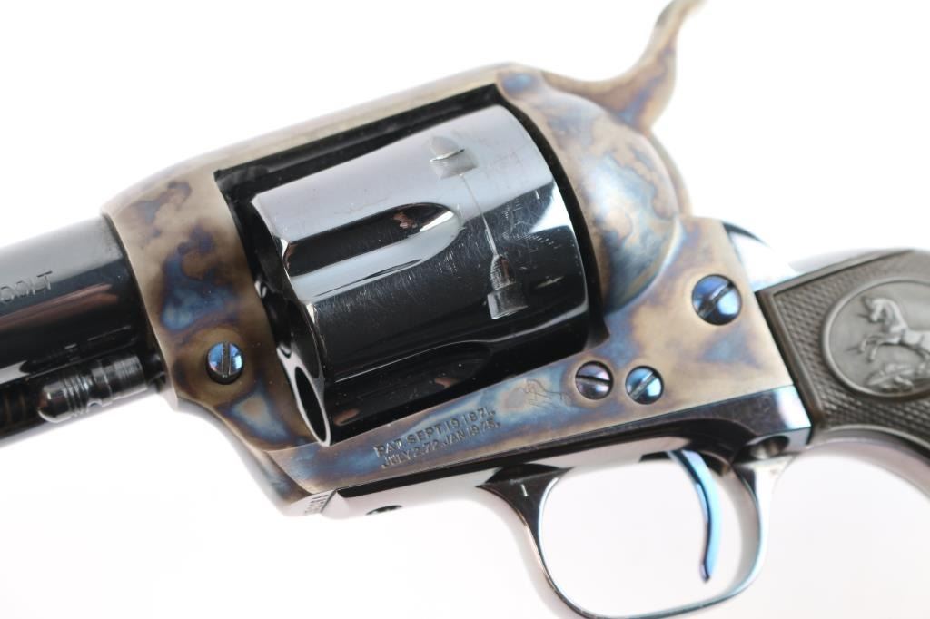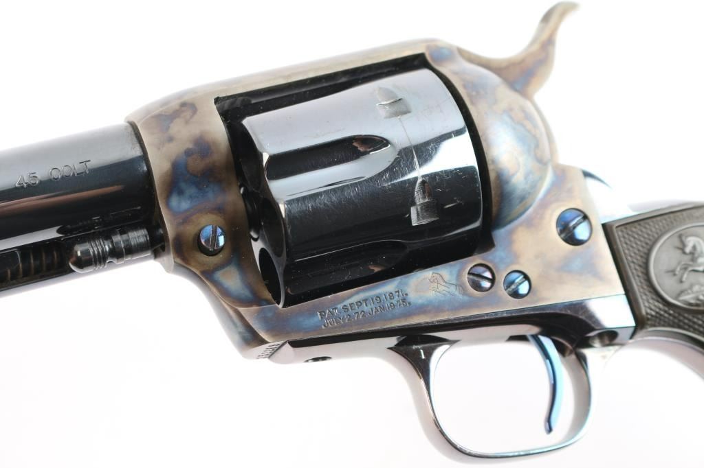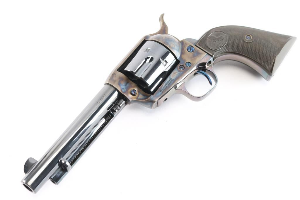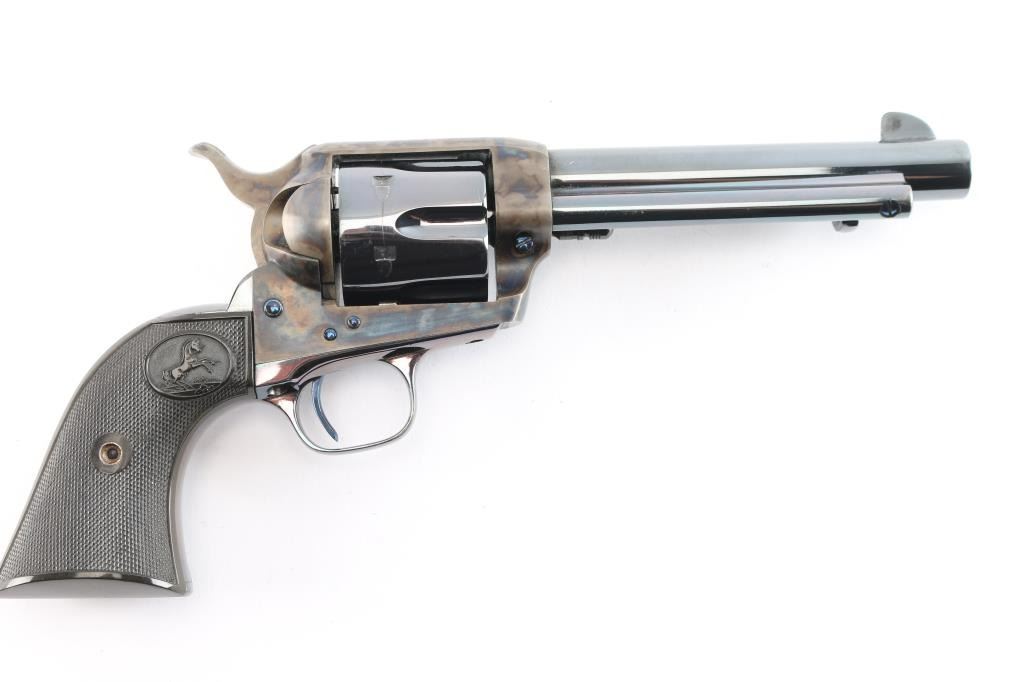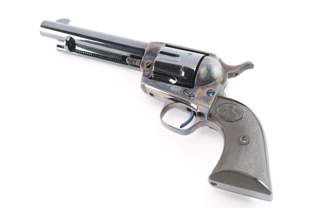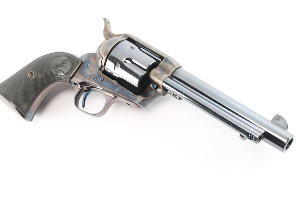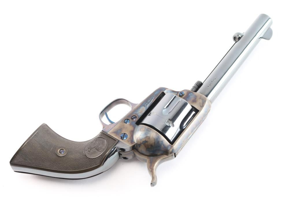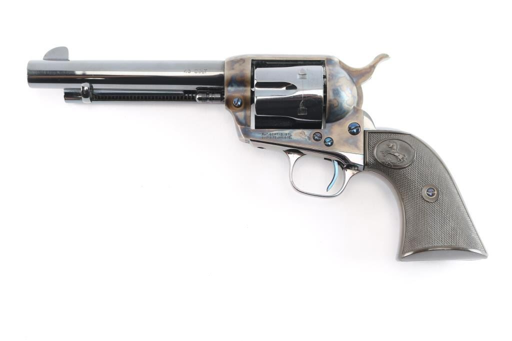American made, Colt 1st Generation Single-Action Army revolver chambered for .45 Long Colt, manufactured circa 1928 in Hartford, CT. Revolver features a high gloss blued refinish, a 5-1/2" round barrel, fixed blade front sight, notched frame rear sight, fluted six-round cylinder, collard cylinder pin head, niter blue thin smooth curved trigger, bird's head style ejector rod button, color-case hammer, firing pin on hammer nose, checkered hammer spur, smooth grip straps, and two-piece checkered black hard rubber grips with Colt insignias. Barrel stamped "COLT'S PT.F.A. MFG. CO HARTFORD CT. U.S.A." in one line on the top of the barrel, and the left side is stamped ".45 COLT". Two-line black powder patent dates are marked on the left side of the frame. The frame markings and serial numbers are sharp and legible. The frame and hammer are color-case hardened, and the screws and trigger are niter blue. A high gloss blued finish was applied to the remaining parts. The high gloss blued refinish retained is approximately 97% with very minor scattered nicks and scratches, and a light drag on the cylinder. The color-case finish is excellent with nothing remarkable. Metal displays no rust or deformation. Bore is bright with strong rifling, and the cylinder chambers are also excellent. Action is smooth and crisp with a tight lock-up. The hard rubber grips are excellent.