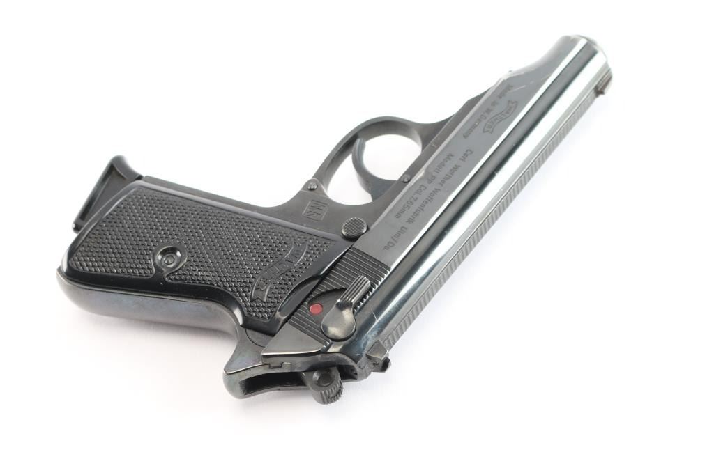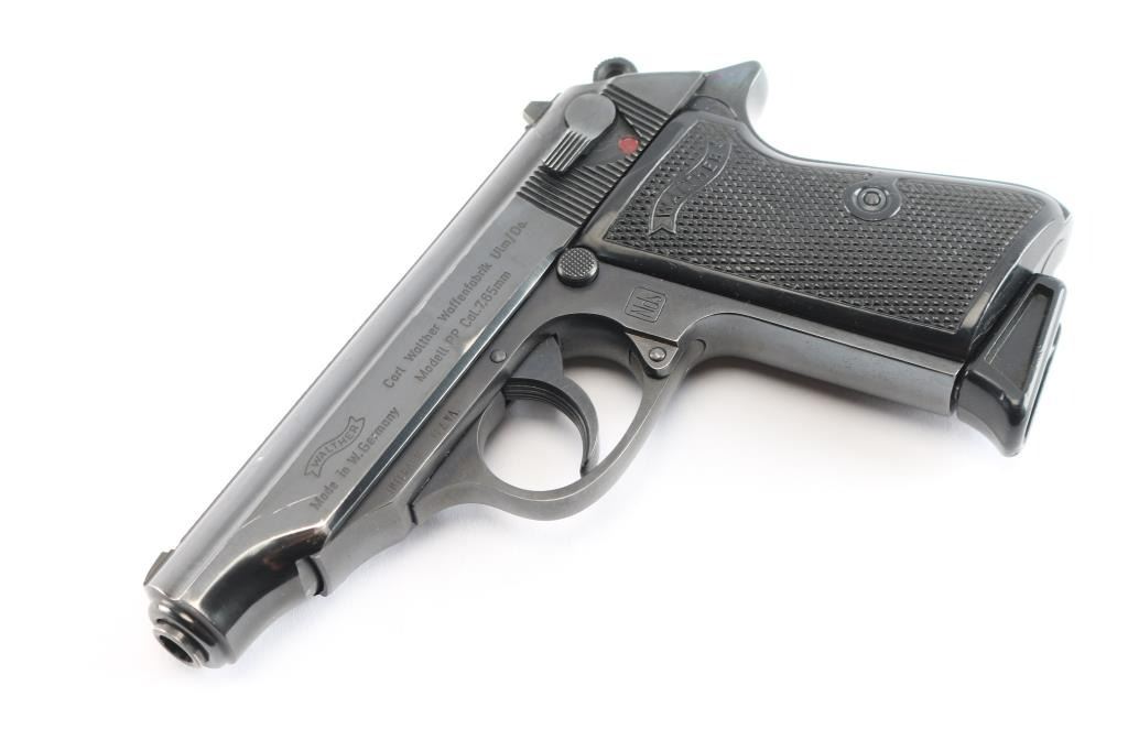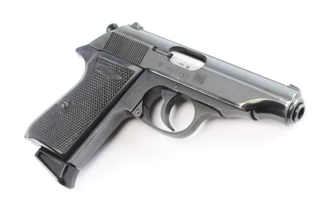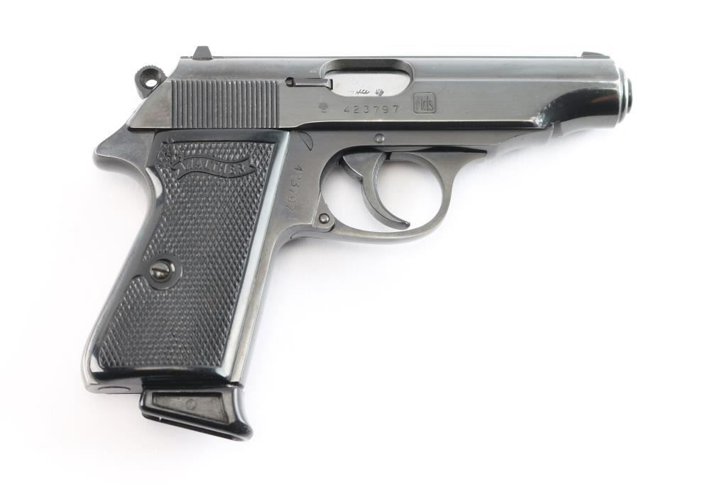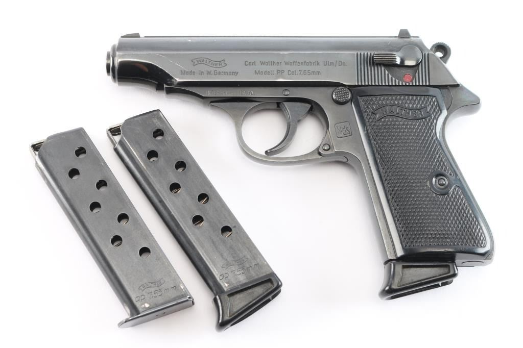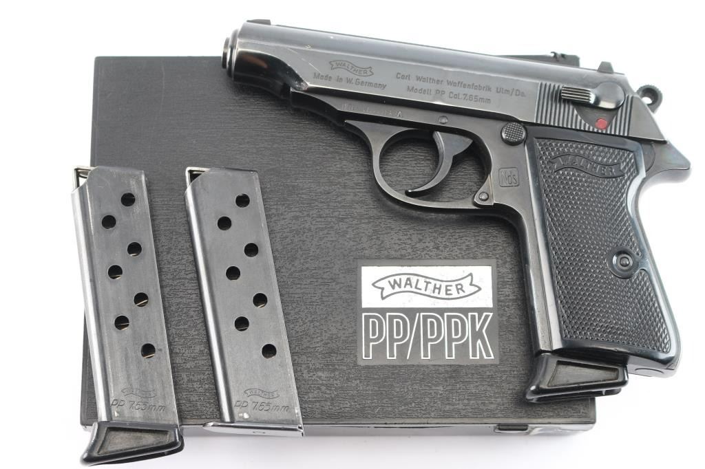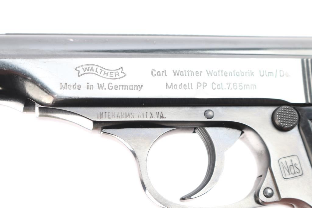 West German made semi-automatic DA/SA blow-back pistol chambered for .32 Automatic Colt Pistol, manufactured circa 1972 in Ulm, Germany. Imported by Interarms out of Alexandria, VA. This is a post-war commercial example of the Walther PP. Pistol features a gloss blued finish, 4" fixed barrel, fixed blade front sight with white dot, dovetailed notched rear sight, external skeletonized hammer with serrated spur, slide mounted manual safety/decocker, smooth grip straps, serrated curved trigger, checkered push-button magazine release, eight-round magazines, and two-piece black checkered hard rubber grips with the Walther banner. The slide's left side is marked with the Walther banner followed by "Carl Walther Waffenfabrik Ulm/Do. Model PP Cal. 7.65mm" in two lines, and "Made in W. Germany." The original blued finish retained is approximately 92% with edge wear, and some scattered scratches on the slide. Metal displays no rust or deformation. Bore is bright with strong rifling, and the grips are very good with a small gouge on the right grip panel. The action is smooth and crisp. Pistol includes the original black plastic factory hard box, manual, and three magazines total.