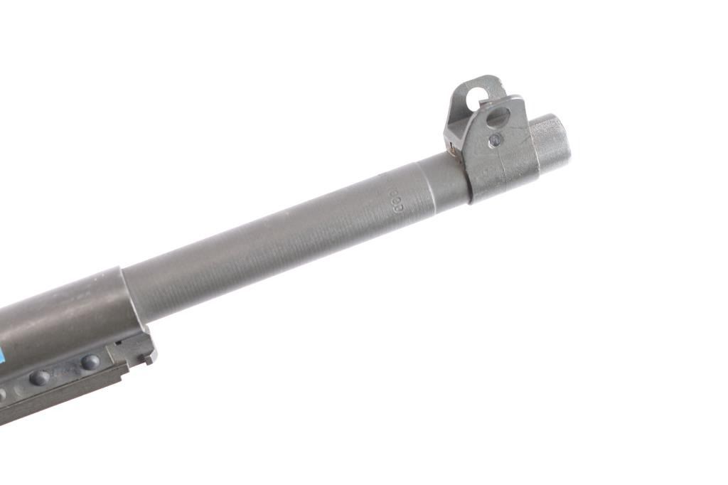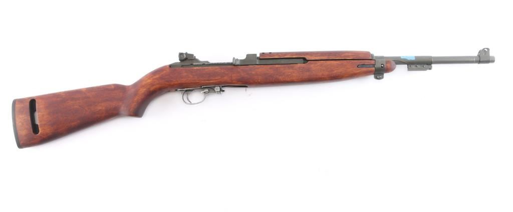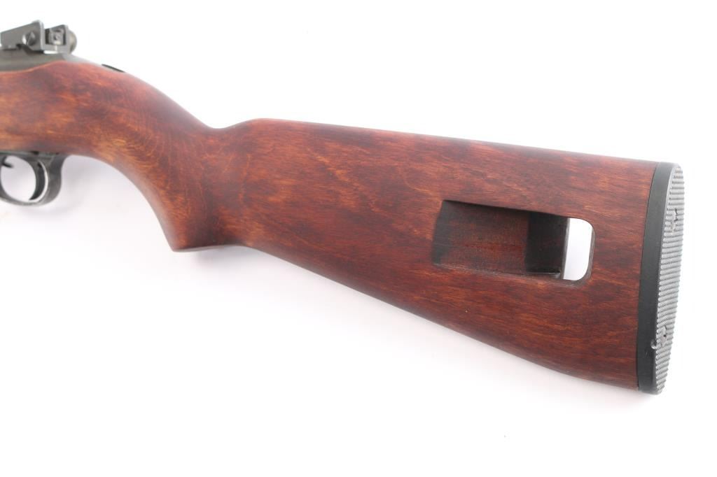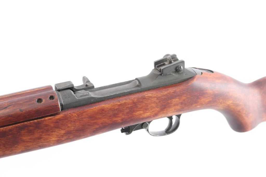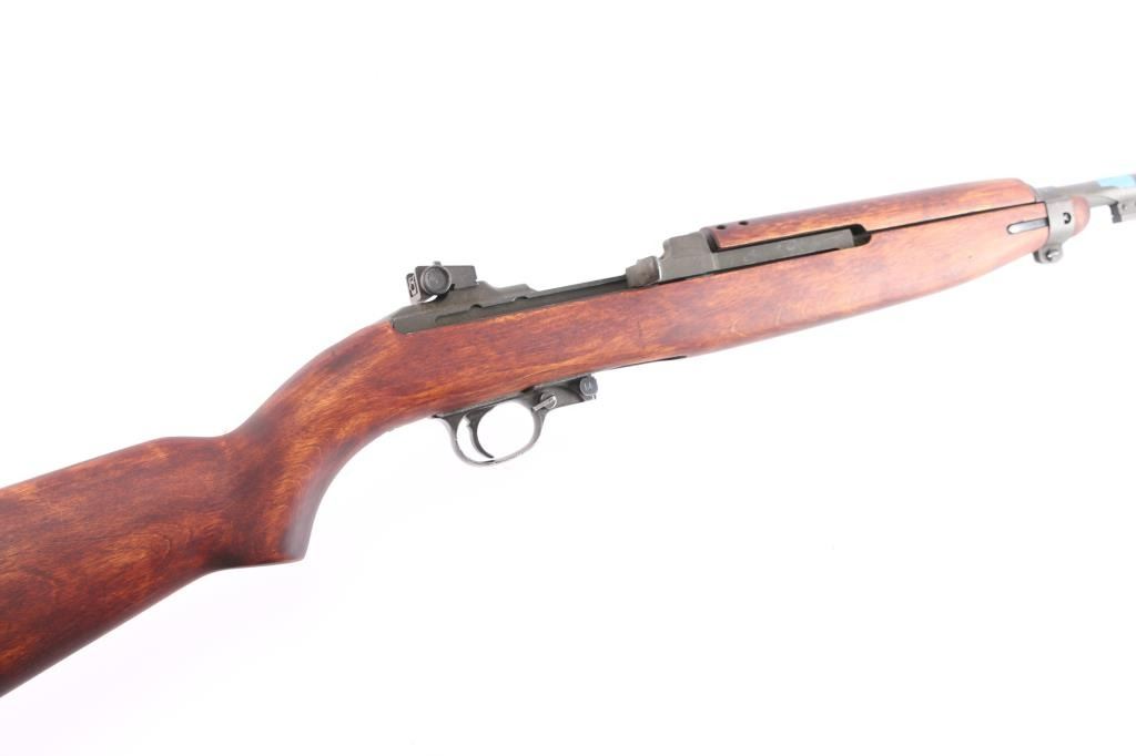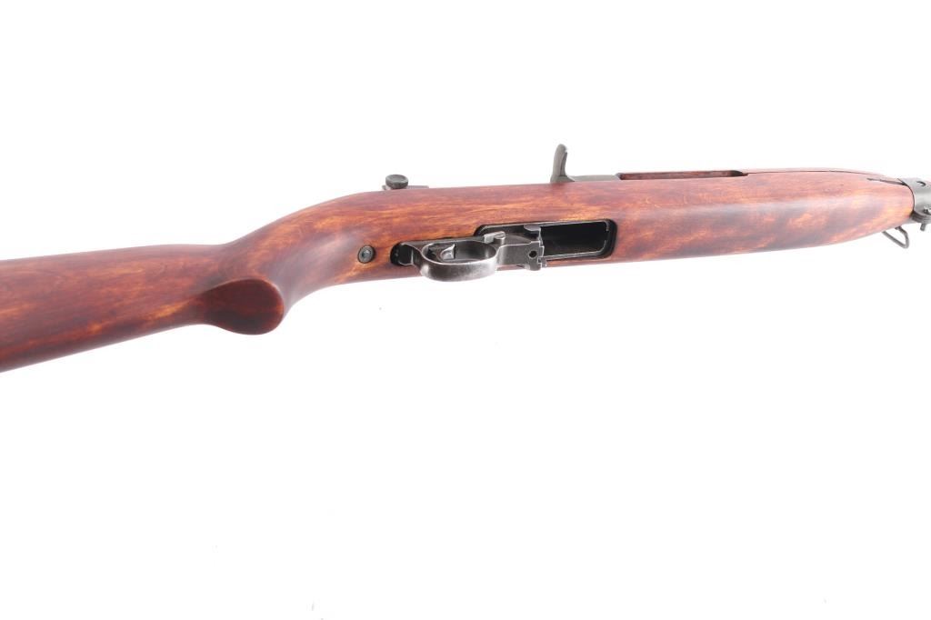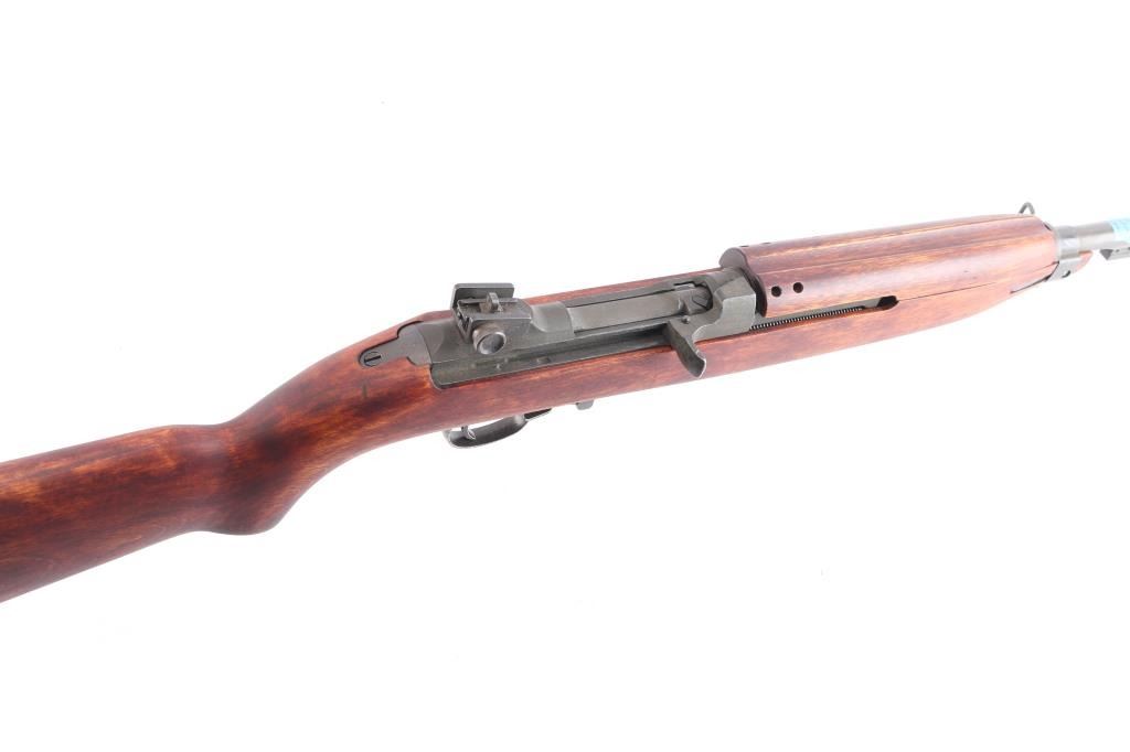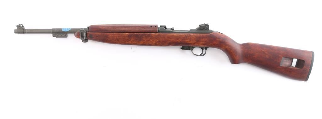 WW2 US military semiautomatic rifle manufactured circa 1944. Features parkerized finish, Type III low wood, oval cut "Pot Belly" stock 4 rivet handguard, protected blade front sight stamped "R.I.A." Type II milled adjustable rear sight, which was introduced around April 1944, marked with "H" in shield (Hemphill Co.) 18" barrel, rotary safety, magazine release marked with underlined "M", oval sling slot in butt, accepts detachable magazine. Correct Type III barrel band stamped "MMQ" (Mueller-Manz Company), flat top bolt, hammer stamped "HN" (National Postal Meter) and trigger housing stamped "Rock Ola". Bore appears excellent/bright. Retains about 92% finish with light edge/handling wear, colors and textures consistent with US production or US military arsenals. The stock and handguard appear to be newer replacements, no cartouches. Inland marked receiver. Barrel marked "Underwood 6-44" with flaming bomb. Serial number places it in production by Inland Nov, 1943. No importer marks observed. No Magazine.