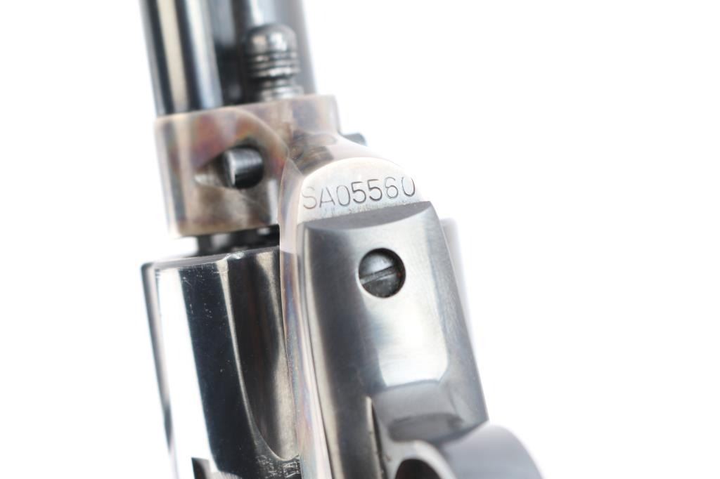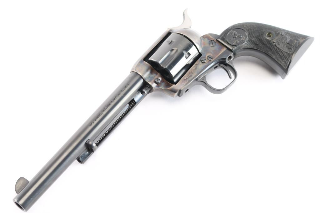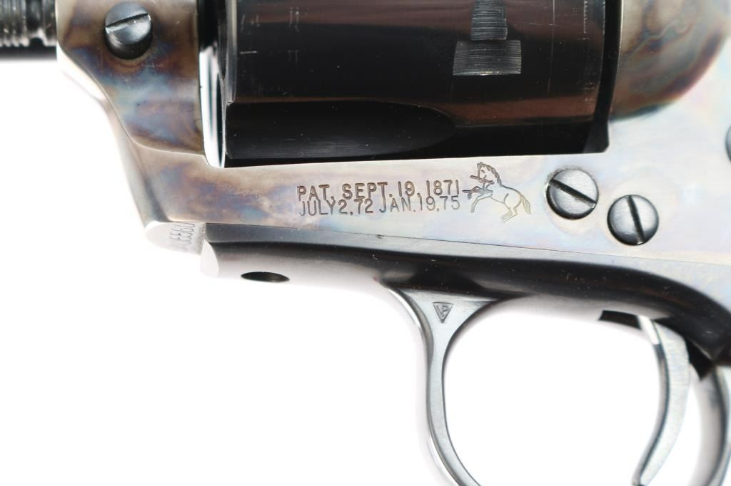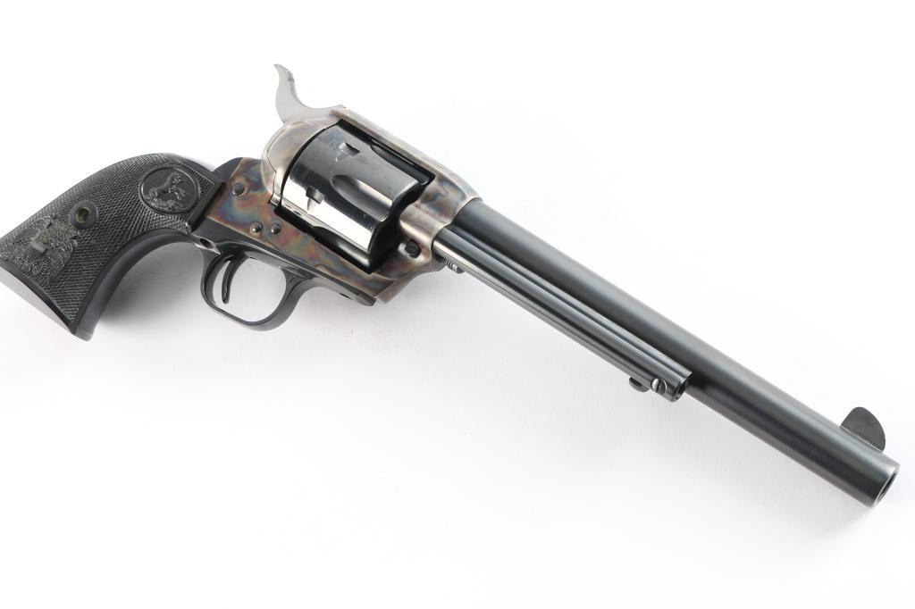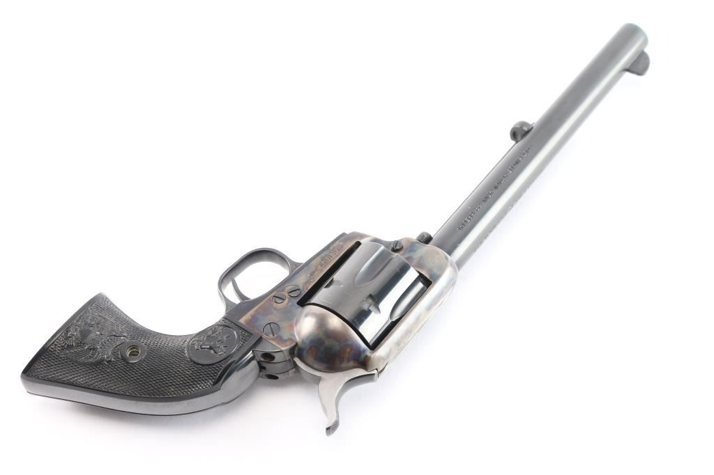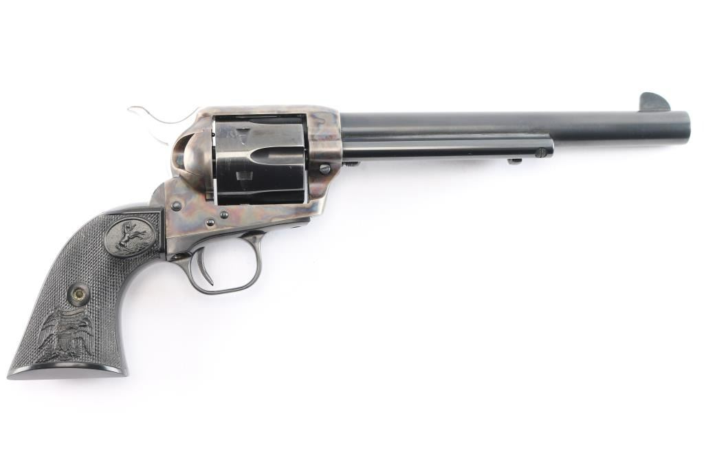 American made, Colt 3rd Generation Single-Action Army revolver chambered in .44 Special, manufactured in Hartford, CT. The third generation Colt single actions were produced from 1956-1974. Revolver features a color-case hardened frame, a blued 7-1/2" barrel, two-toned hammer with polished sides, fixed blade front sight, notched frame rear sight, thin smooth curved trigger, fluted six-round cylinder, collard cylinder pin head, birds head style ejector rod button, smooth grip straps, firing pin on hammer nose, checkered hammer spur, and checkered black hard rubber grips with 'American Eagle' and 'Rampant Colt' motifs. The frame is color-case hardened, the hammer is two-toned blued with polished sides, and the remaining components and have a blued finish. The original blued finish retained is approximately 96% with light scattered scratches, mostly on the bottom of the barrel and cylinder. The color-case finish is excellent and colorful. Metal displays no rust, but shows deformation on the cylinder pin head from removing it with a tool. The action functions soundly with a tight lock-up, and the grips are excellent. The bore is bright with strong rifling, and the cylinder chambers are also excellent. The cylinder pin is probably hard to remove and reinstall, with tool marks as a tell-tale sign.