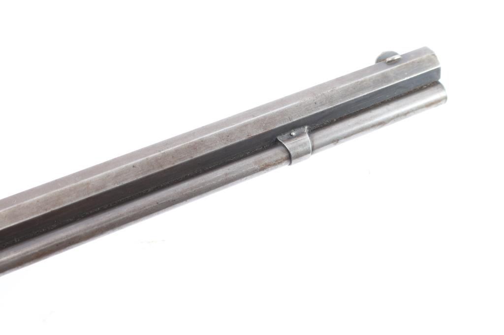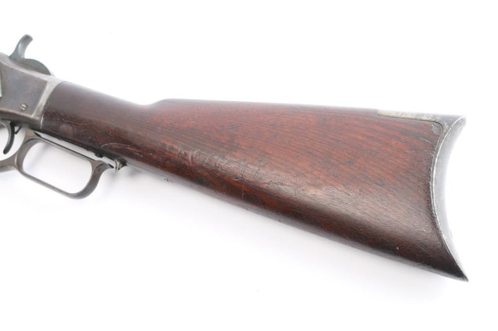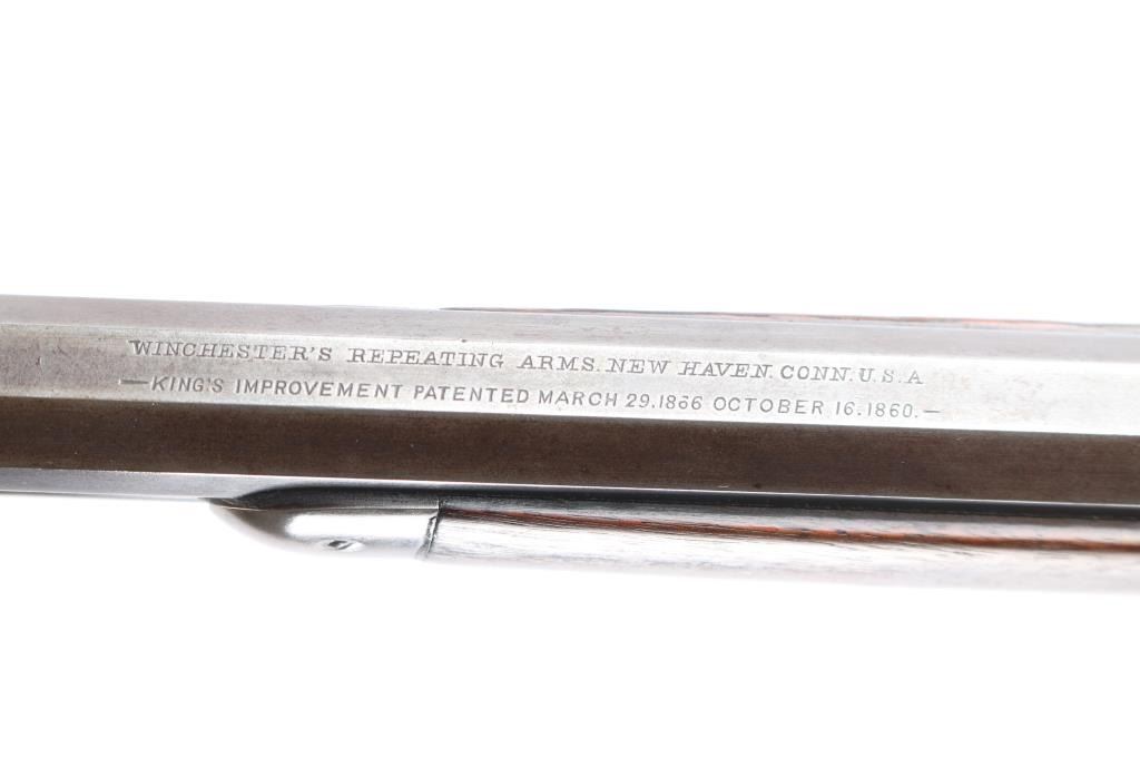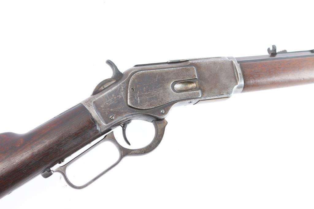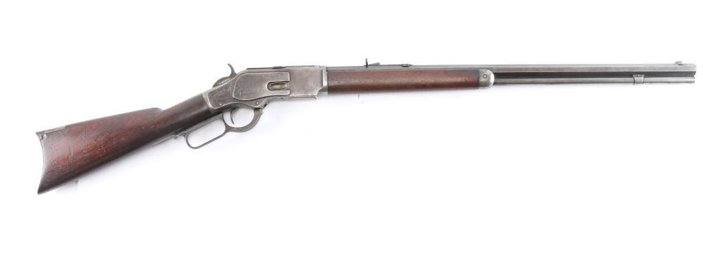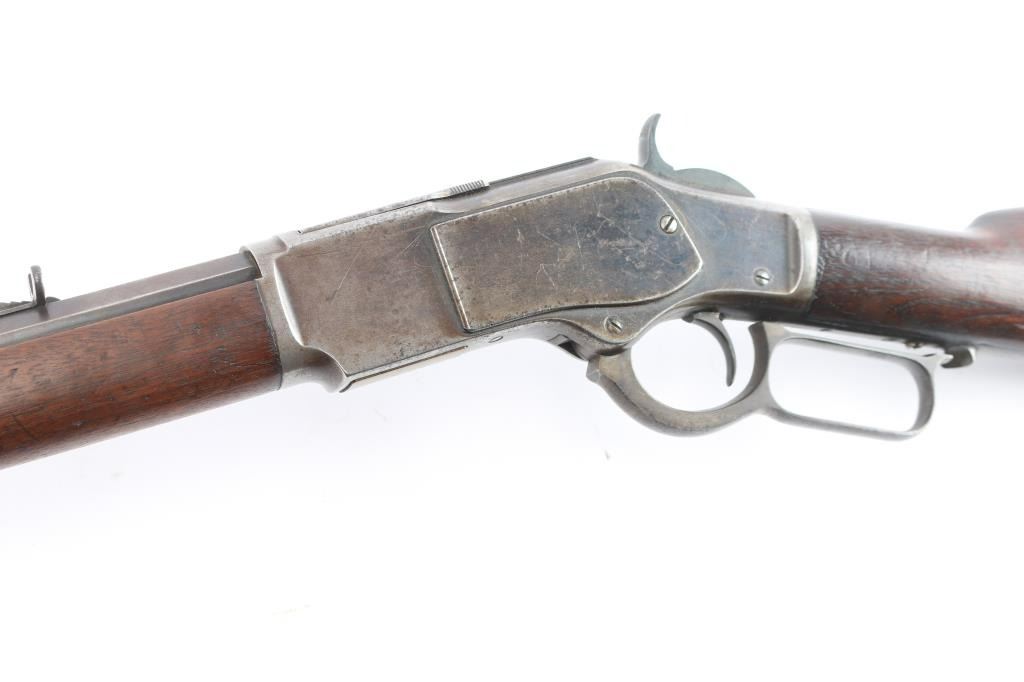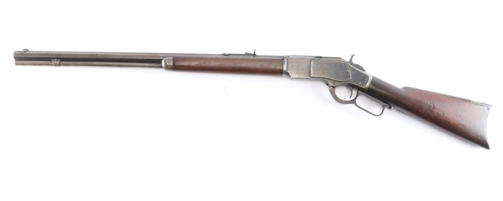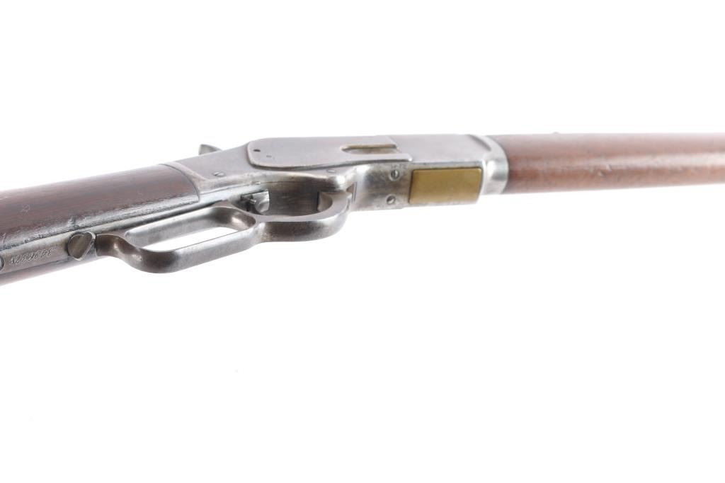 'Third Model' manufactured circa 1890. Features 24" octagonal barrel, full length magazine tube, German silver front sight, buckhorn rear sights, straight wrist, finger lever latch, correct sliding dust cover with integral center rail and prominent vertical serrations at the rear for grip, steel crescent buttplate. Bore is overall good/bright, good rifling, rough textured grooves. Blue is about 15%, mostly dull brown/gray color, receiver has some patches of very light pitting. Screw slots are generally good with some slight marring the small set trigger screw head is broken. Wood is overall very good/sound, with minor dents and scratches. Butt has good fit to tang. Winchester markings are clear, readable. Brass lifter is unmarked.