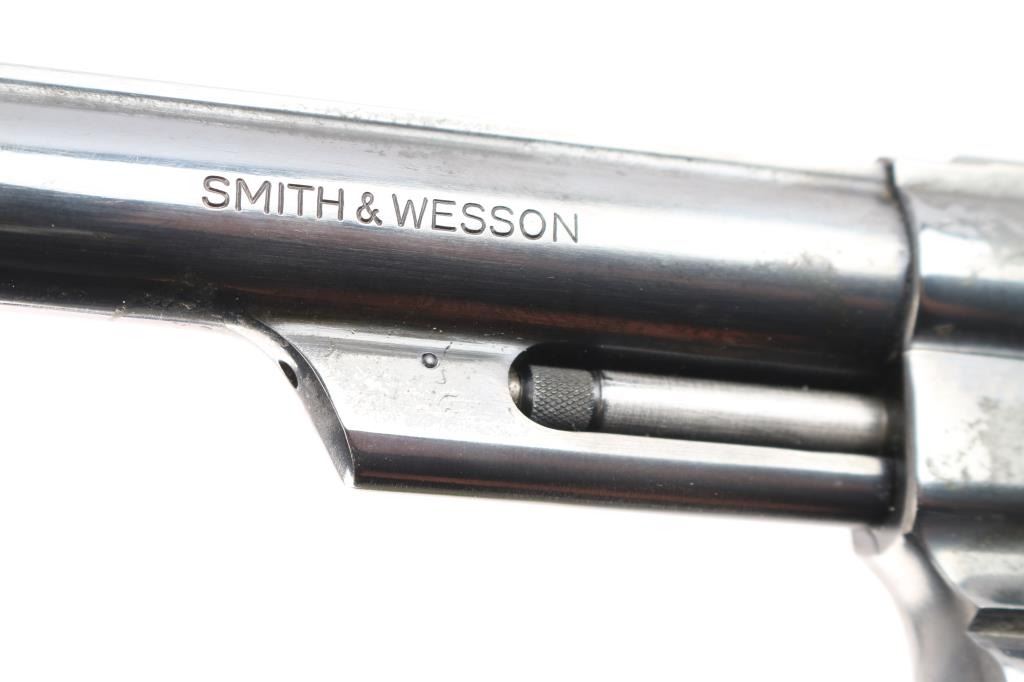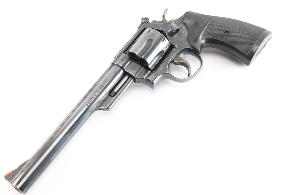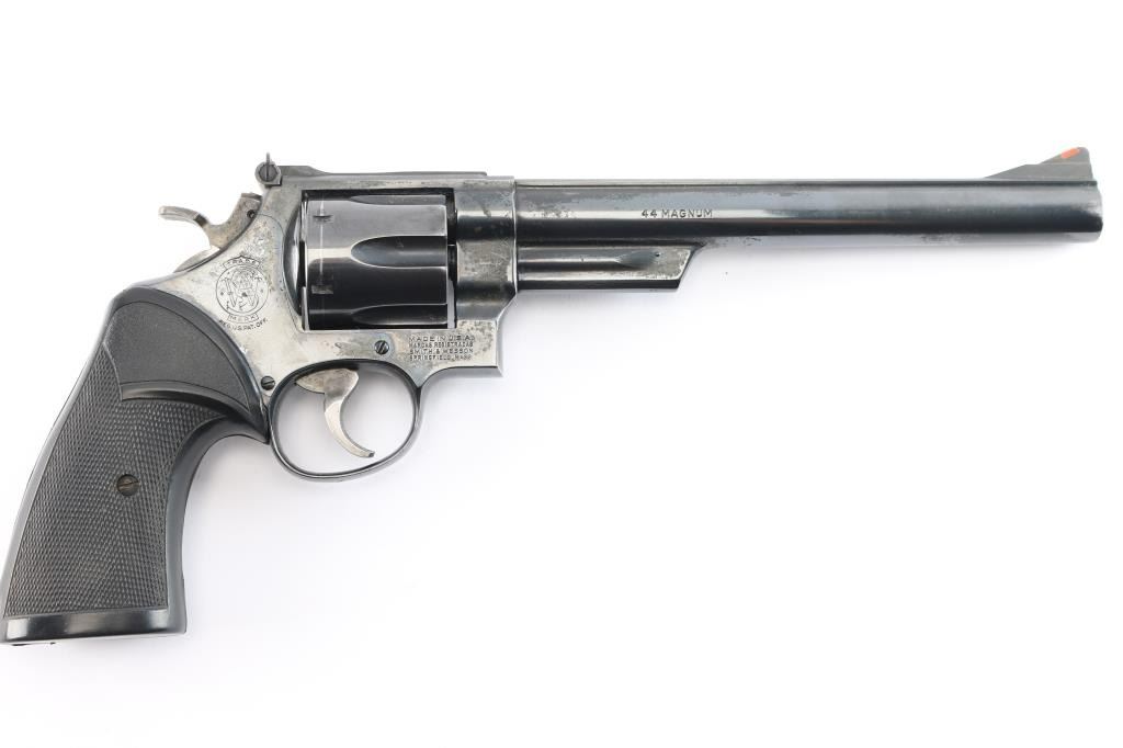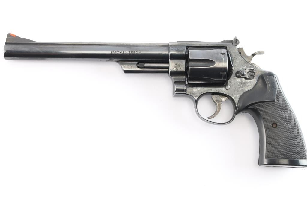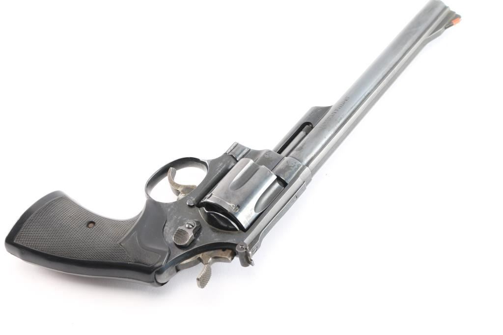 Large frame double-action 6 shot revolver chambered for .44 Magnum ammunition was manufactured between 1982 and 1986 in Springfield, MA. This is built on a large target 'N' frame with three screws, 1.69" length cylinder, and serrated straps. It features a blued finish, 8 3/8" barrel with a raised serrated red ramp front sight, a micrometer adjustable white square notch rear sight, shrouded ejector rod, a serrated barrel rib, case-colored wide serrated curved target trigger, case-colored target hammer with wide checkered spur, and checkered black rubber Pachmayr Presentation grips. The bore is very good with strong rifling, and the cylinder chambers also look very good. The action is smooth with tight lock-up. The metal retains approximately 94% of its original finish with edge wear, muzzle wear, and a noticeable cylinder drag line. The metal on the triggerguard has a small spot of rust on the bottom. Grips are excellent. One side plate screw shows deformation in its slot. This firearm is covered with dried oil, or CLP from storage.