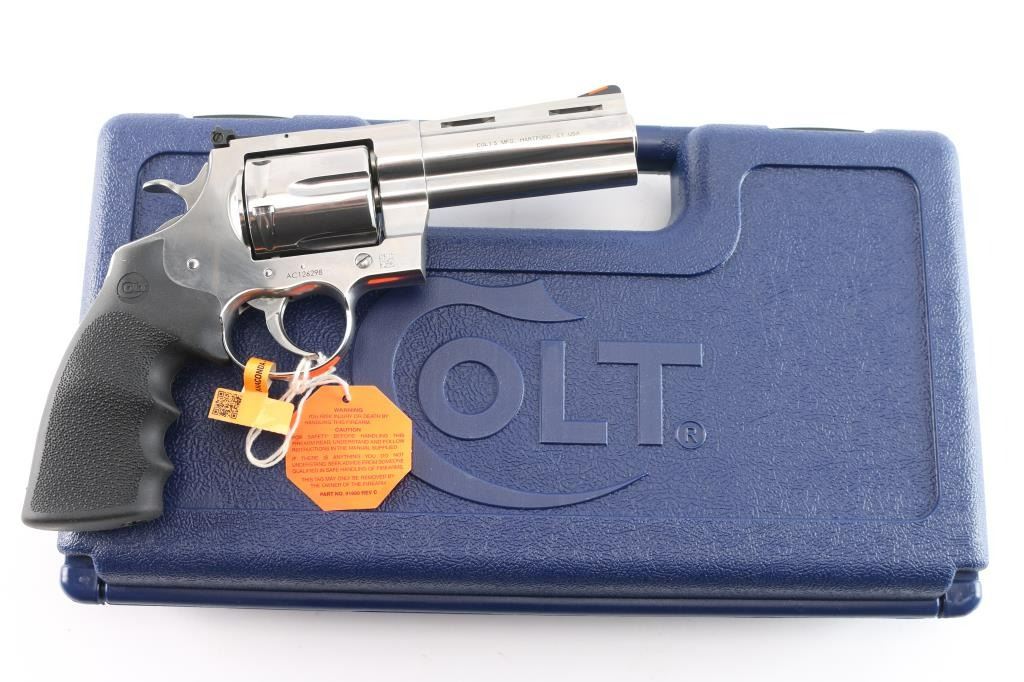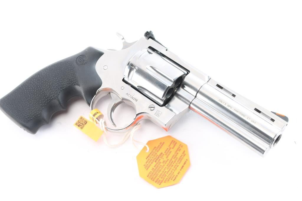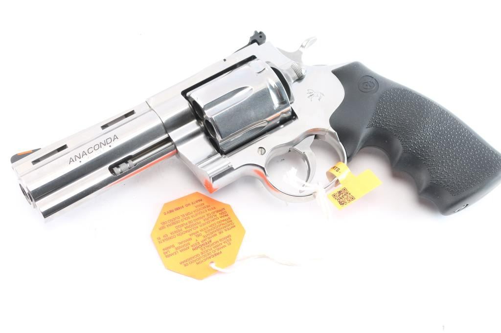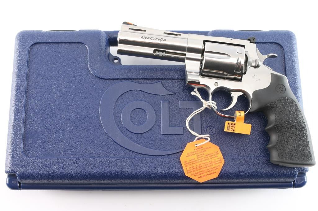 Premium quality stainless steel large frame double action revolver chambered in .45 Long Colt, manufactured in Hartford, CT. The original Anaconda was introduced in 1990 and discontinued around 2006, and it has since been reintroduced in 2021 ('AC' serial prefix). Pistol features a bright polished stainless steel finish, 4-1/4" ventilated ribbed barrel with a recessed crown, full underlug, raised serrated ramp front sight with orange insert, micrometer adjustable square notched rear sight, fluted six-shot cylinder, serrated cylinder release, knurled cylinder pin head, partially serrated wide curved trigger, external hammer, serrated wide hammer spur, transfer bar safety, flat top 'MM' frame, smooth backstrap, and Colt branded black single-piece pebble-textured rubber wrap-around finger grooved grip. The original high-polished stainless finish retained is approximately 99% with nothing remarkable. Metal displays no rust, but there is slight deformation in the grip screw slot. Action is smooth and crisp with a very tight lock-up, the bore is bright with strong rifling, and the cylinder chambers are also excellent. The rubber grips are excellent. Pistol includes the original factory foam lined blue hard case with end label, lock, documents, and owner's manual.