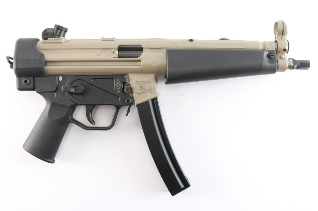American made roller-delayed blowback semi-automatic centerfire pistol chambered for 9x19mm, manufactured in Afton, VA. This is an American copy of HK's MP5/SP5 pistol. Pistol features an Flat Dark Earth (FDE) finish, a 8.9" cold-hammer forged 4150 CMV barrel, tri-lug and 1/2-28 threads for muzzle devices, knurled thread protector, fixed post hooded front sight, adjustable four-aperture rotary drum rear sight, smooth curved trigger, ambidextrous paddle magazine release, annular cut right side push-button safety, checkered cocking handle, black polymer trigger housing with smooth pistol grip, smooth wide tropical handguard, optic mounting lugs on the top of the receiver, sling loop on the left side of the front sight base, sling loop on left side of magazine well, and sling ring at the rear of the firearm. The original FDE finish retained is approximately 99% with minimal chipping around the magazine well. Metal displays no rust or deformation. Bore is bright with strong rifling, and the action is smooth and crisp. The black polymer parts are also excellent. Pistol includes tactical soft case, owner's manual, cleaning kit, extra parts, lock, and one magazine total.