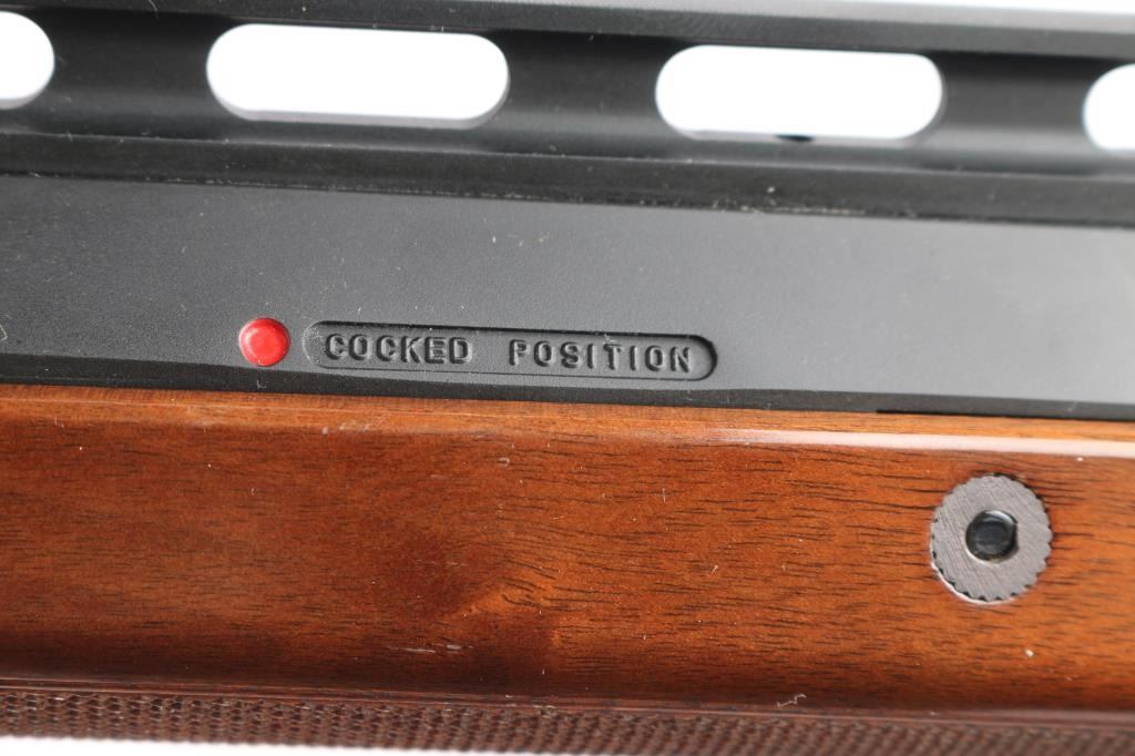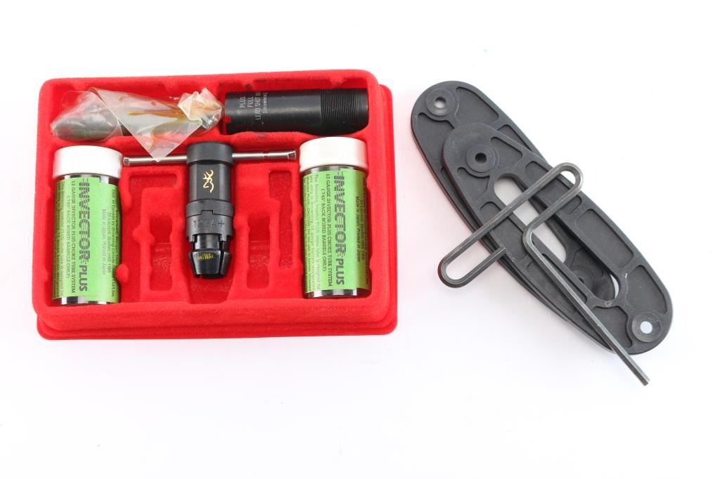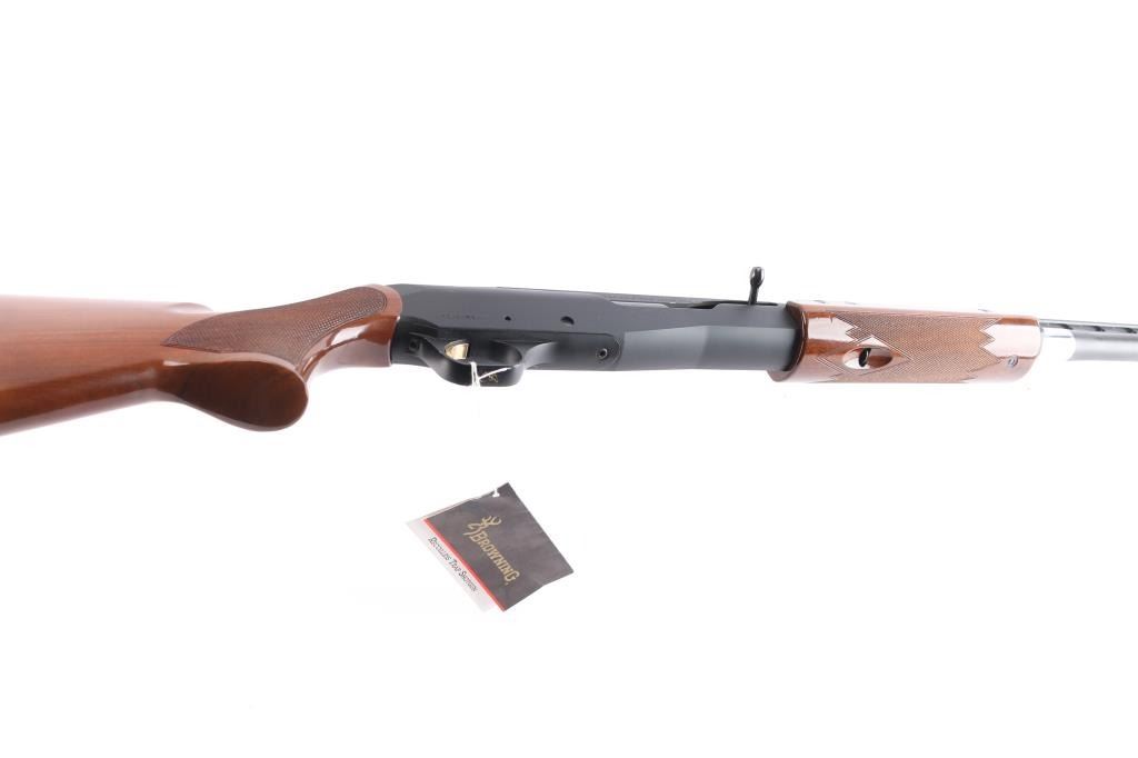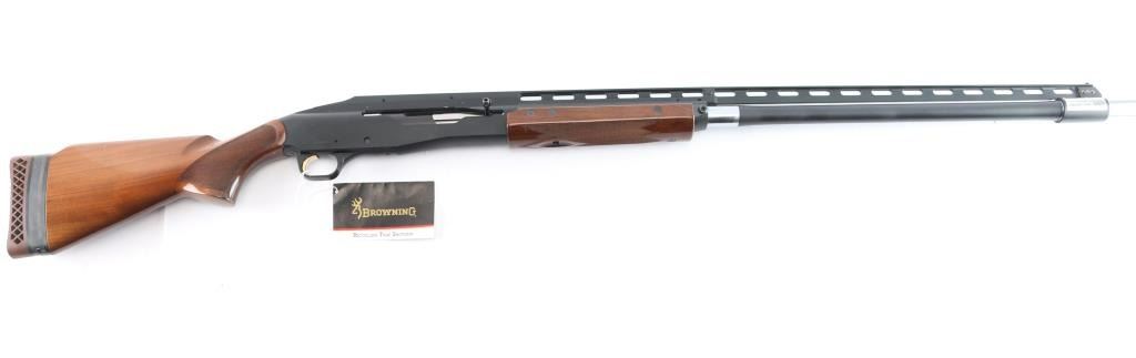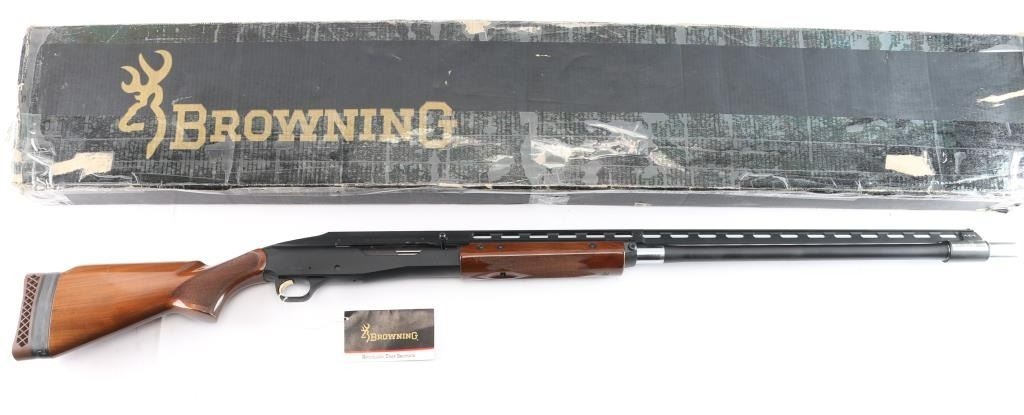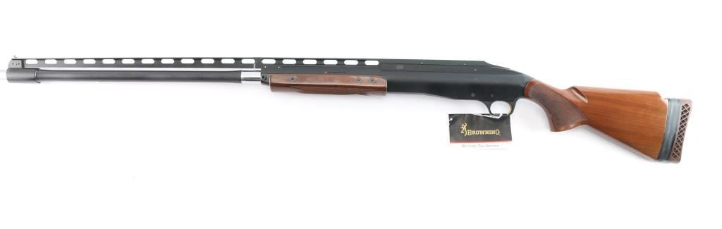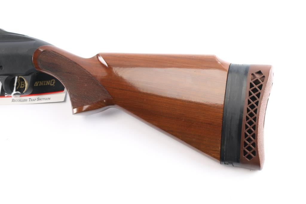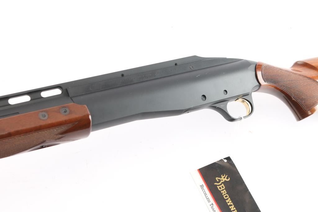 Manufactured in Japan by Miroku for Browning. Single shot trap shotgun chambered for 2 3/4" 12 ga trap loaded shells, circa 1995. Features a matte black finish, 30" barrel with Invector Plus choke (none installed), large adjustable raised ventilation rib, white beaded sights, proprietary recoilless action, alloy receiver, smooth wide gold trigger, high gloss checkered walnut forend and pistol grip shoulder stock with extension & factory recoil pad. Shotgun exhibits approximately 96% of it's original finish showing some rubs, buggered screw holes at the front of the rib and light scattered edge wear on the rib. Action is sound, bore is pristine and wood stocks are fine. Comes in factory box with matching label, manual, buttplate spacer, tool and factory set of Investor Plus chokes, with wrench. Includes full, improved modified, and modified.