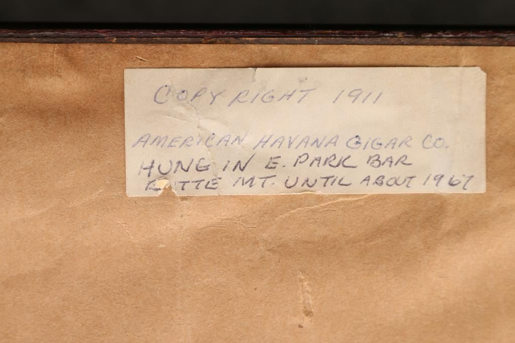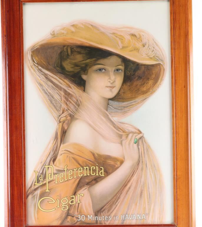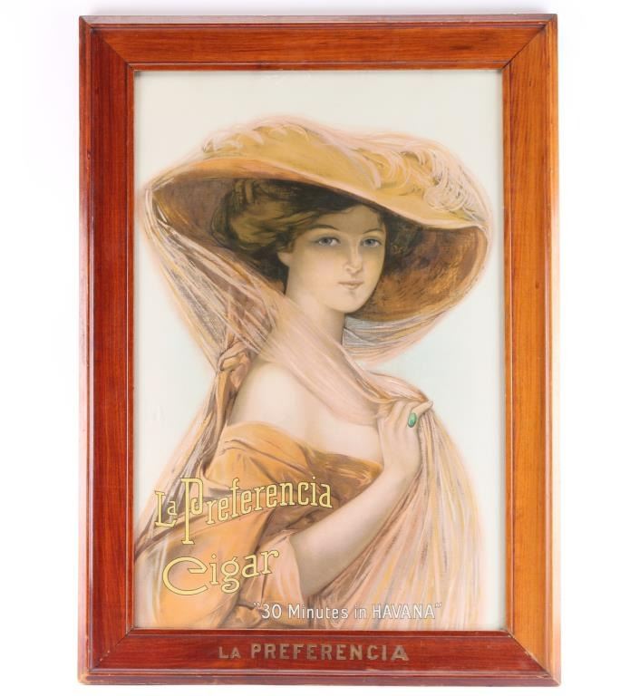 Reads "La Preferencia Cigar, 30 minutes of Havana" along with portrait. of beautiful Ziegfield Follies era lady and frame reads "La Preferencia" probably the original. 8.5-9 on a 1-10 grading scale for condition with minor marks and aging to frame and only very slight toning and age to the image. Measures approximately 35 1/4" by 25 1/4".