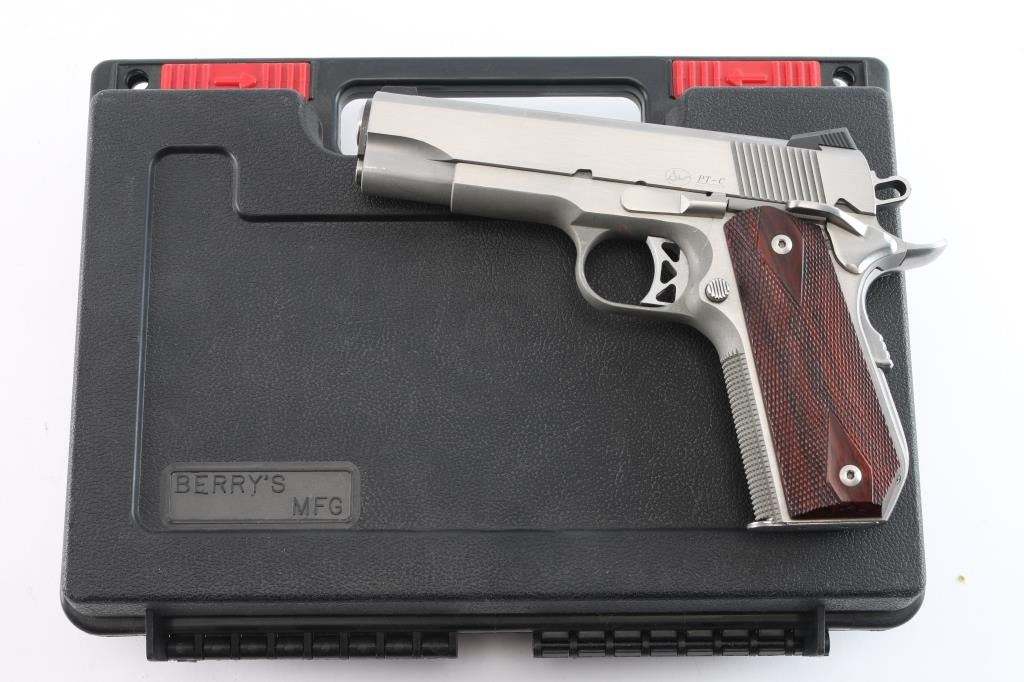 American made premium stainless steel 1911-A1 style semi-automatic pistol chambered in .45 Automatic Colt Pistol. Manufactured circa 2005 in Norwich, NY. Pistol features a stainless finish with brushed flats and matte contours, a 4-1/4" match grade barrel, dovetailed Trijicon three-dot night sights, adjustable curved serrated skeletonized 'K' trigger, two-toned skeletonized hammer with serrated spur, short metal guide rod, checkered recoil spring plug, serrated extended frame mounted thumb safety, serrated extended beavertail grip safety with memory bump, steel frame with bobbed backstrap, smooth mainspring housing, checkered front strap, serrated push-button magazine release, eight-round magazines, and double diamond checkered two-piece rosewood grips. The original stainless finish retained is approximately 94% with light scattered scratches. Metal displays no rust or deformation. Action is smooth and crisp, and the rosewood grips are very good to excellent with a low spot on the right grip panel, and some nicks on the bottom of the left grip panel. Bore is dirty, but bright with strong rifling. The tritium has dimmed in the sights. Pistol includes the original foam lined factory hard case, one magazine total, end label, and spent test cartridge.