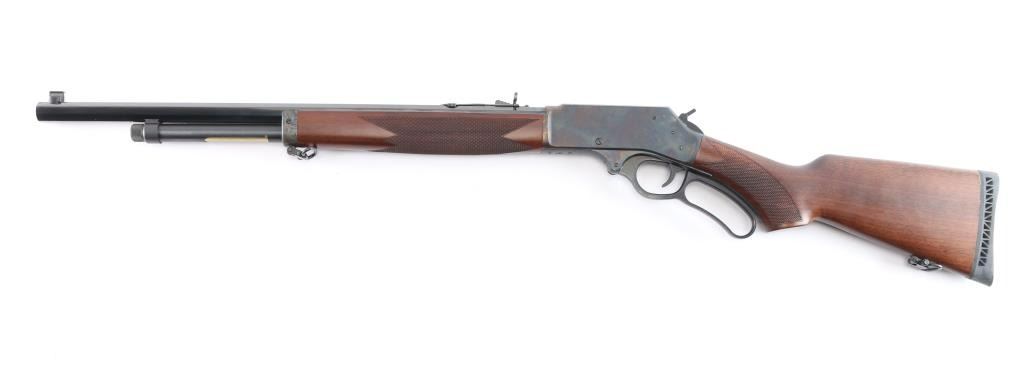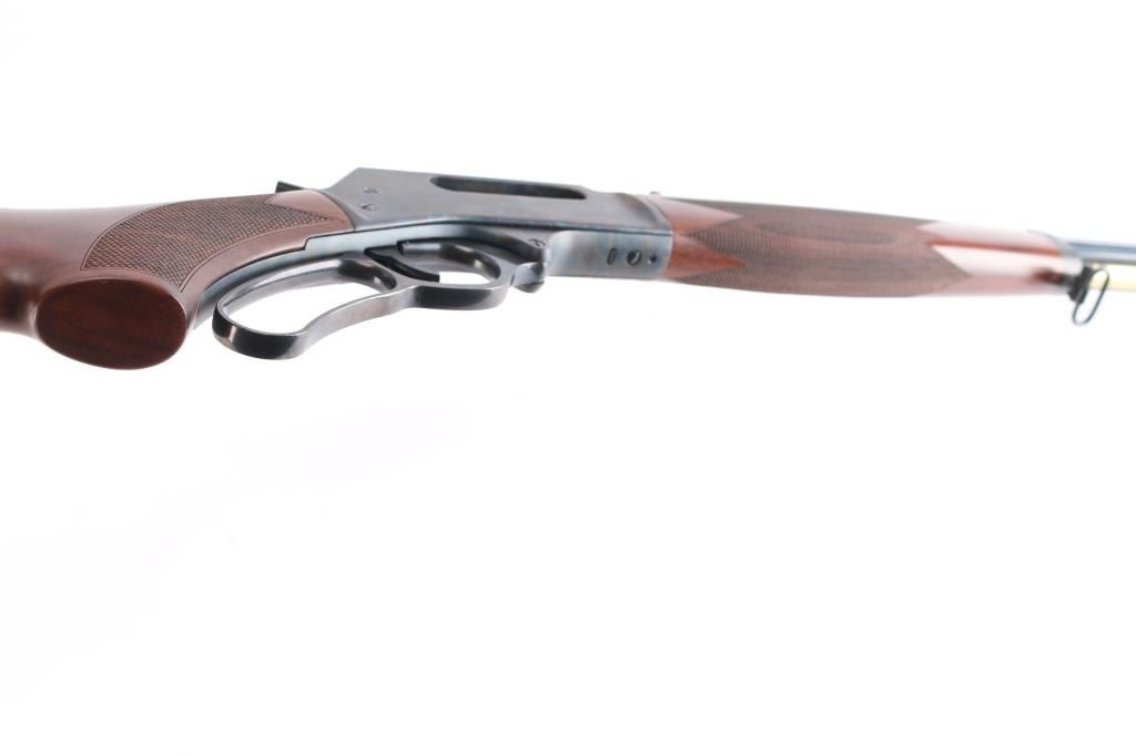 American made 'Old West' style side gate lever-action centerfire rifle chambered for .45-70 Government, and manufactured in Rice Lake, WI. Rifle has a color-case hardened receiver and tangs, with the remainder of the components having a blued finish. It features a 22" octagonal barrel, raised serrated blade front sight with a brass bead, fully adjustable buckhorn style rear sight, smooth curved trigger, external hammer with serrated spur, transfer bar safety, grip safety, and four-round 3/4 length magazine tube. The walnut furniture consists of a semi-pistol grip shoulder stock with checkering at the wrist, checkered forend with a sling swivel on the end cap, sling swivel on the bottom of the shoulder stock, and a factory black ventilated rubber recoil pad with black spacer. Rifle retains approximately 99% of its original color case finish with scattered superficial scratches. The blued finish is also excellent. Metal displays no rust or deformation. The action is smooth and crisp, and the bore is bright with strong rifling. The walnut furniture is also excellent.