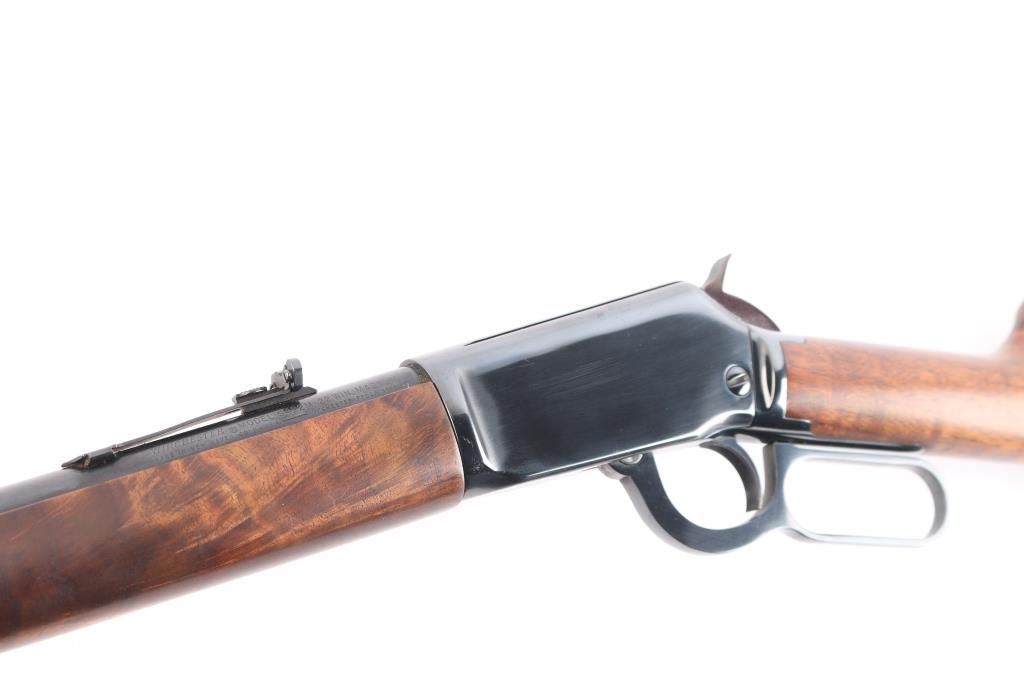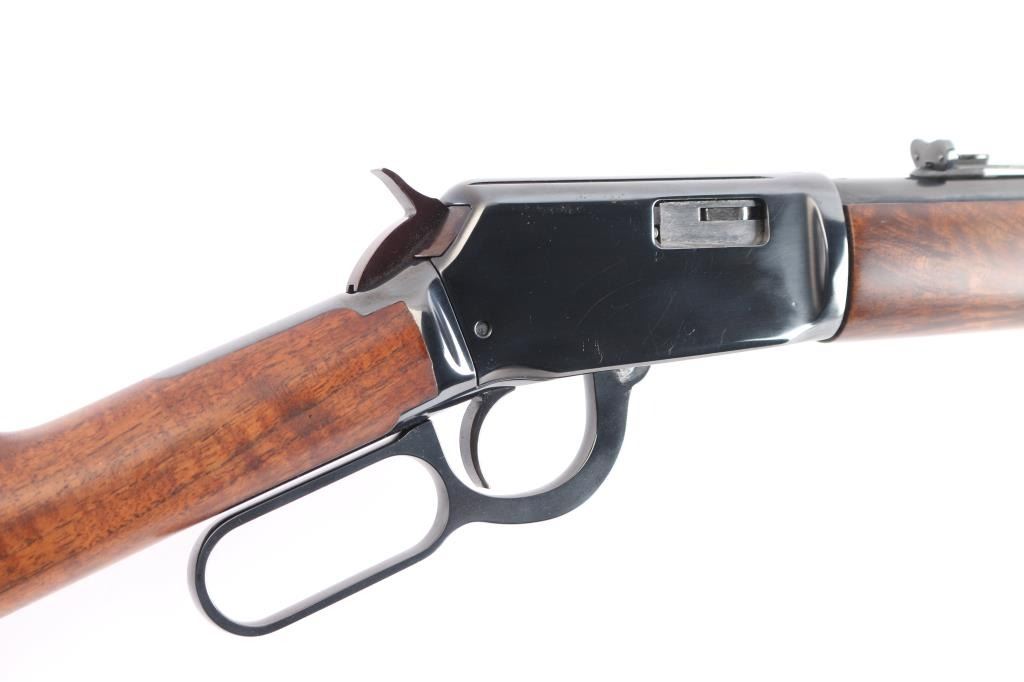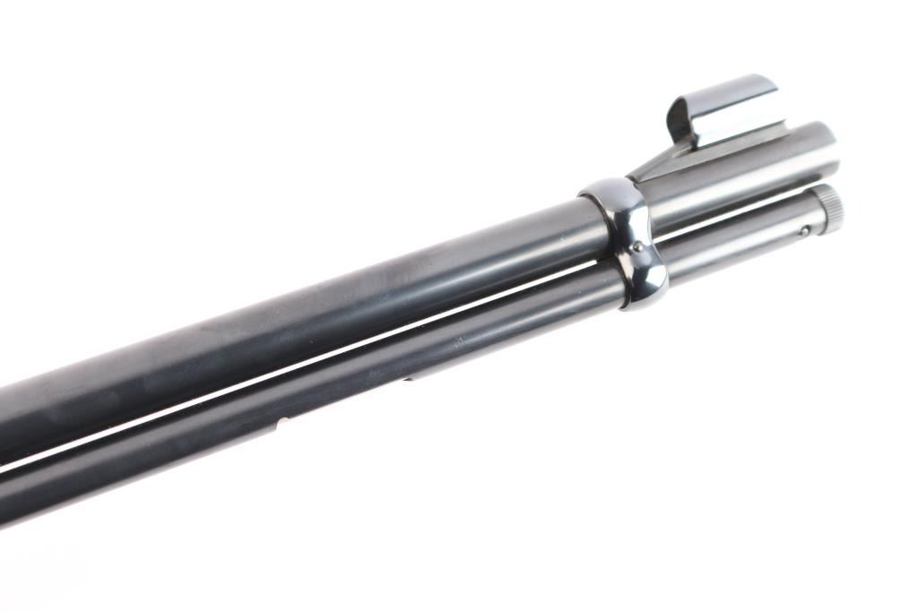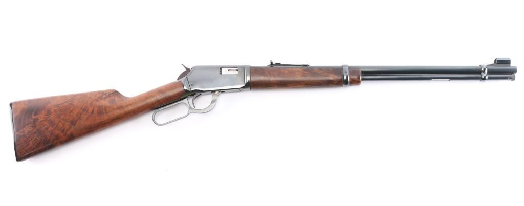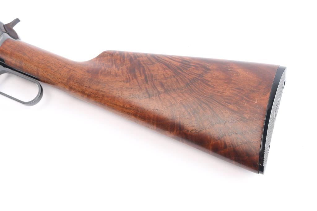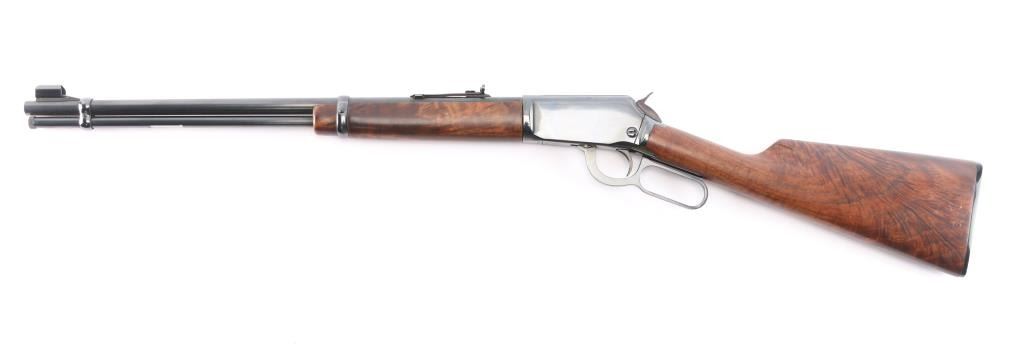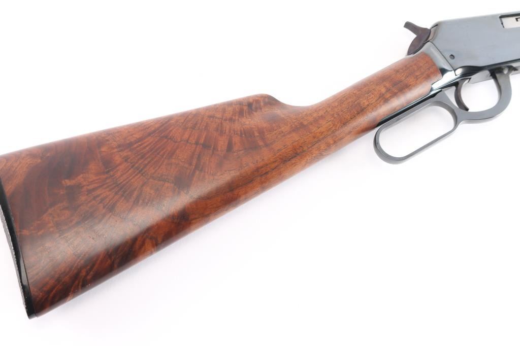 American made lever action rimfire rifle chambered for .22 Winchester Magnum, manufactured circa 1973 in New Haven, CT. It features a 20" blued barrel and receiver, full length magazine tube, two barrel bands, hooded blade front sight with brass bead, an adjustable sporting rear sight, exposed hammer with serrated spur, and curved serrated trigger. The highly figured walnut furniture consists of a smooth straight grip shoulder stock, smooth forend, 14" length-of-pull, and black checkered Winchester butt plate. The original blued finish remaining is approximately 98% with small superficial scratches. Furniture wood looks near excellent with a filled blemish on the right side of the forend, and superficial blemishes elsewhere. Bore is bright with strong rifling, and the action is smooth and crisp. The markings are sharp and clear.