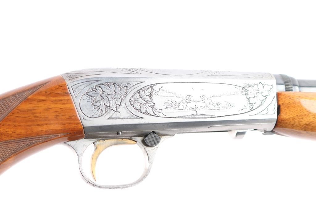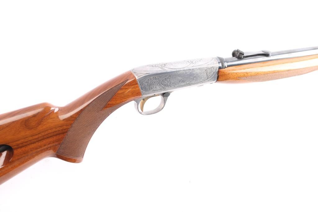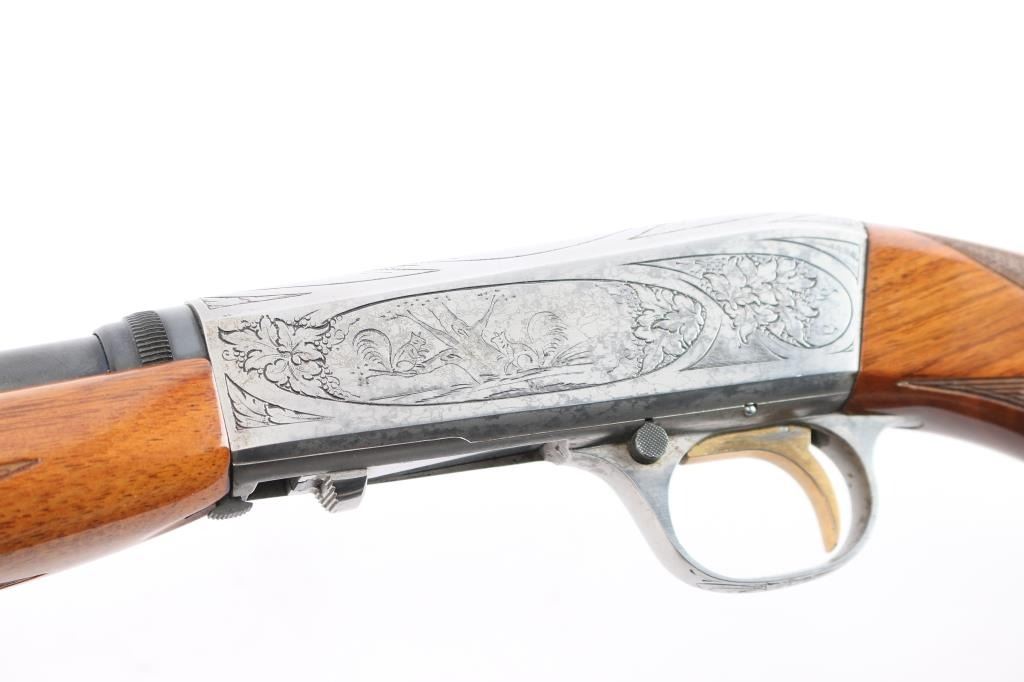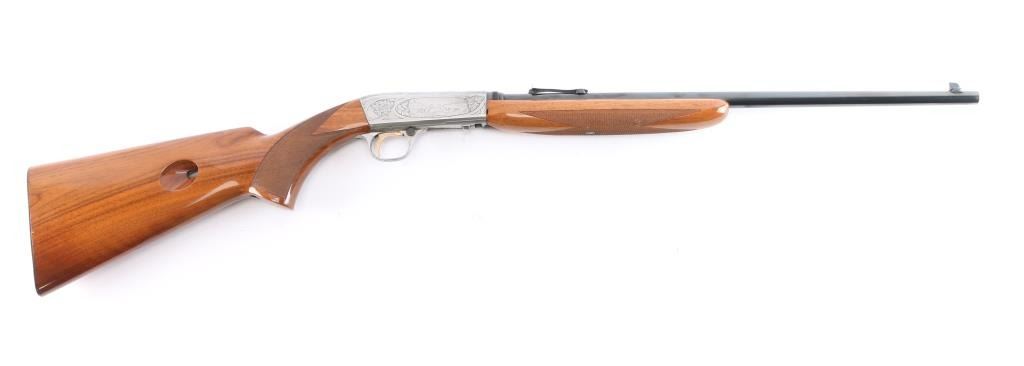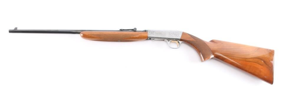 Belgian made 'Grade II' semi-automatic rimfire take-down rifle chambered for .22 Long Rifle, and manufactured between the late 1950's and the early 1960's. Rifle has a gloss blued finished barrel with a French gray steel receiver. It features an early 19-1/4" tapered barrel, dovetailed fixed blade front sight, early adjustable wheel style rear sight, smooth curved gold-toned trigger, checkered cross-bolt manual safety at the front of the trigger guard, and loading port in the shoulder stock. The deluxe hardwood furniture consists of a semi-pistol gripped stock with fine checkering at the wrist, a fine checkered semi-beavertail forend, and a quick/partial loading port on the right side of the shoulder stock. The receiver is hand engraved with coverage of oak scrolls with a water foul on top of the receiver, two squirrels on the left side of the receiver, and two prairie dogs on the right side of the receiver. The original blued finish retained is approximately 99% with superficial blemishes, and light edge wear. The receiver has lost some of the "French Gray" iodized finish, and is showing more patina. Metal displays no rust, or deformation. The hardwood furniture is in very good to excellent condition with minor scratches, storage blemishes, and a small mark on the forend checkering. The action is smooth and crisp, and the bore is bright with strong rifling.