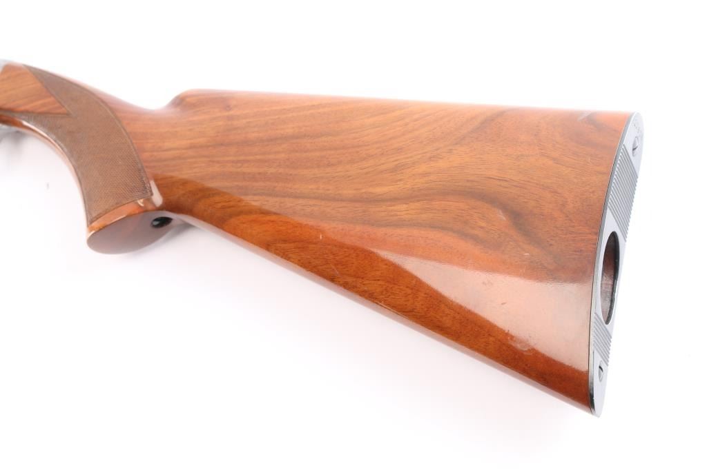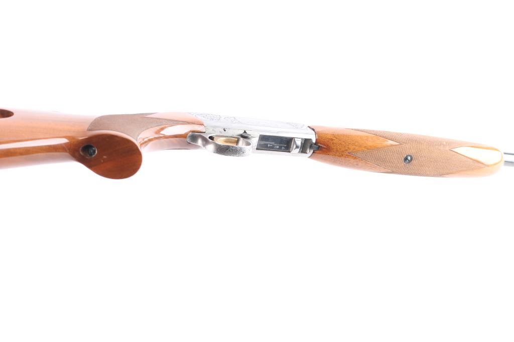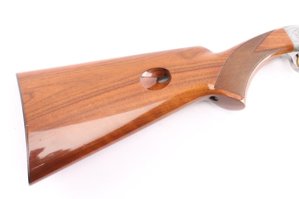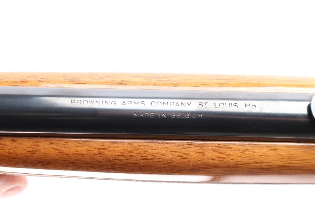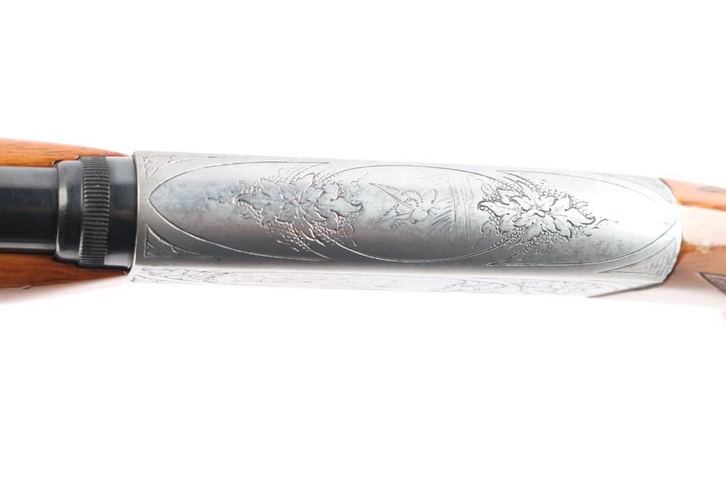 Belgian made 'Grade II' semi-automatic rimfire take-down rifle chambered for .22 Long Rifle, and manufactured between the late 1950's and the early 1960's. Rifle has a gloss blued finished barrel with a French gray steel receiver. It features an early 19-1/4" tapered barrel, dovetailed fixed blade front sight, early adjustable wheel style rear sight, smooth curved gold-toned trigger, checkered cross-bolt manual safety at the front of the trigger guard, and loading port in the shoulder stock. The deluxe hardwood furniture consists of a semi-pistol gripped stock with fine checkering at the wrist, a fine checkered semi-beavertail forend, and a quick/partial loading port on the right side of the shoulder stock. The receiver is hand engraved with coverage of oak scrolls with a water foul on top of the receiver, two squirrels on the left side of the receiver, and two prairie dogs on the right side of the receiver. The original blued finish retained is approximately 99% with superficial blemishes, and light edge wear. The receiver has lost some of the "French Gray" iodized finish, and is showing more patina. Metal displays no rust, or deformation. The hardwood furniture is in very good to excellent condition with minor scratches, storage blemishes, and a small mark on the forend checkering. The action is smooth and crisp, and the bore is bright with strong rifling.