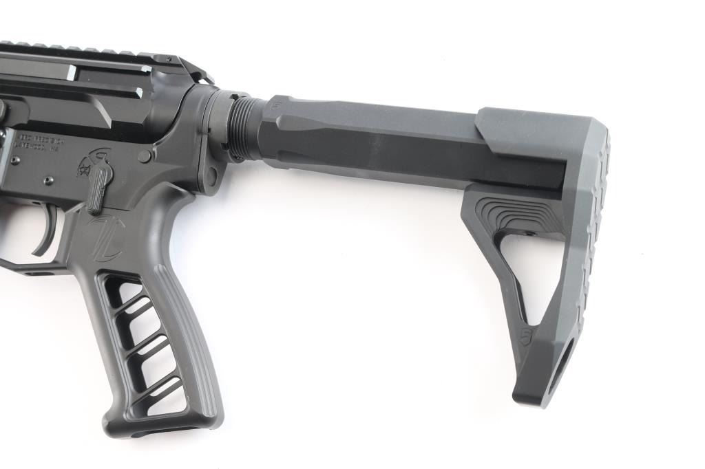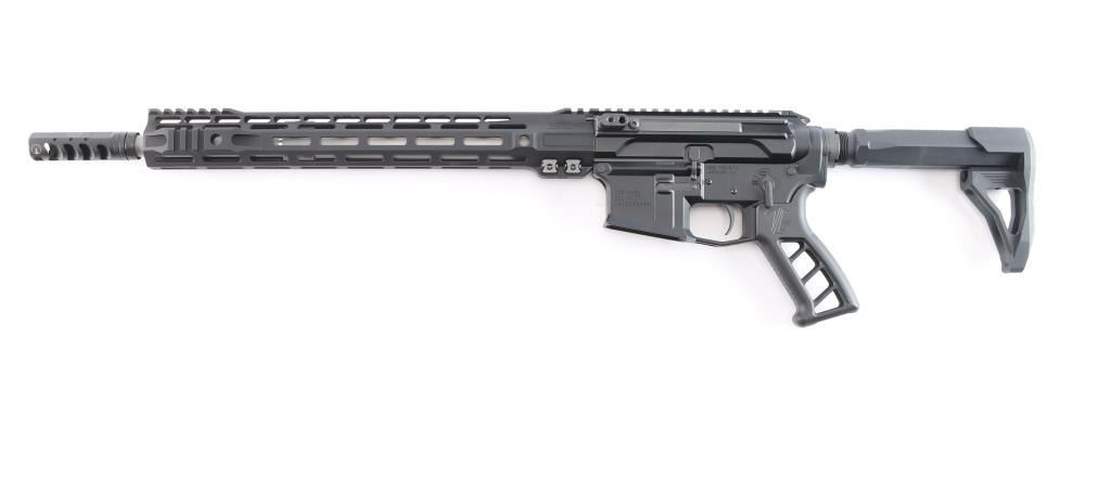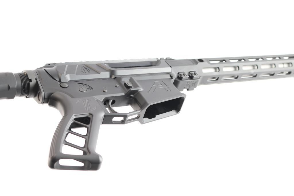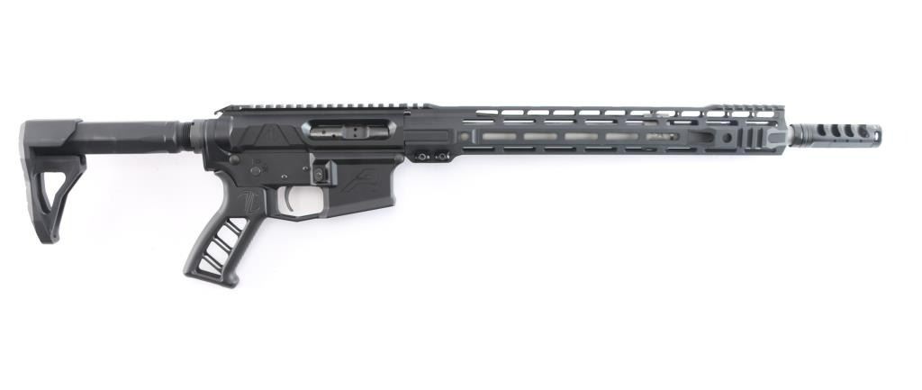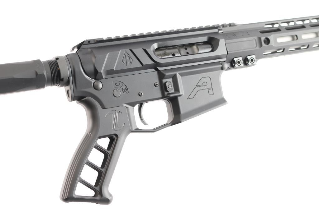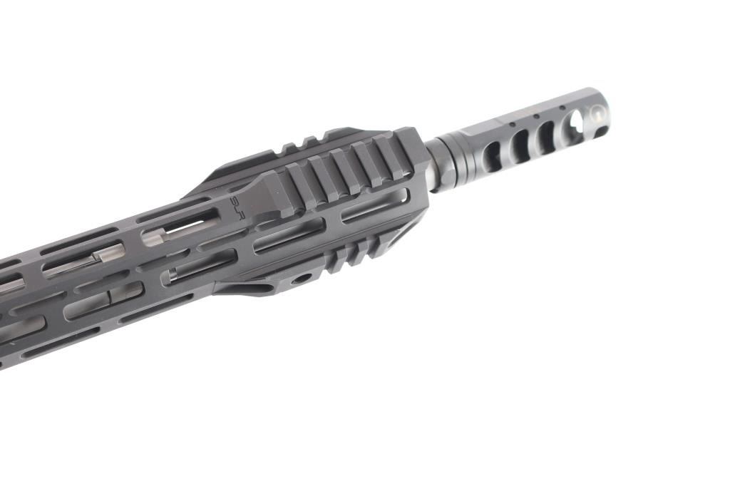 American made semi-automatic centerfire direct gas impingement driven rifle chambered for 6.5 Grendel, and Lakewood, WA. Rifle features a matte black anodized finish, 16" Mos-Tek matte stainless steel barrel with a 1/7" twist rate, Ultradyne Apollo Max compensator, flat top upper receiver, annular cut push-button magazine release, drop-in single-stage smooth curved trigger with anti-drift pins, oversized integral trigger guard, left side charging handle, SLR free-float handguard with integral picatinney accessory rail segments and M-Lok slots, serrated bolt release, aluminum black anodized skeletonized pistol grip with grooves and serrations on the straps, standard buffer and spring, serrated receiver mounted serrated manual safety, superlative Arms adjustable gas block, beveled magazine well, Phase 5 Hex2 receiver extension, and black Phase 5 Universal Mini Stock with hex cut rear. Rifle retains approximately 99% of its original anodized black finish with superficial scratches. Metal displays no rust or deformation. The action is smooth and crisp, and the bore is bright with strong rifling.