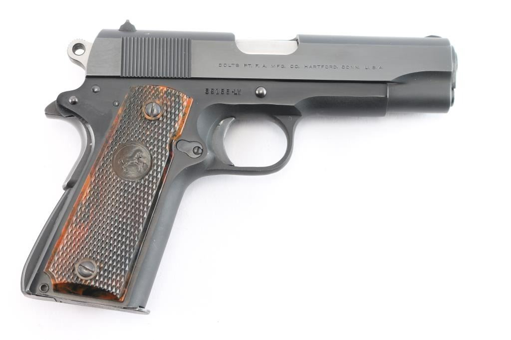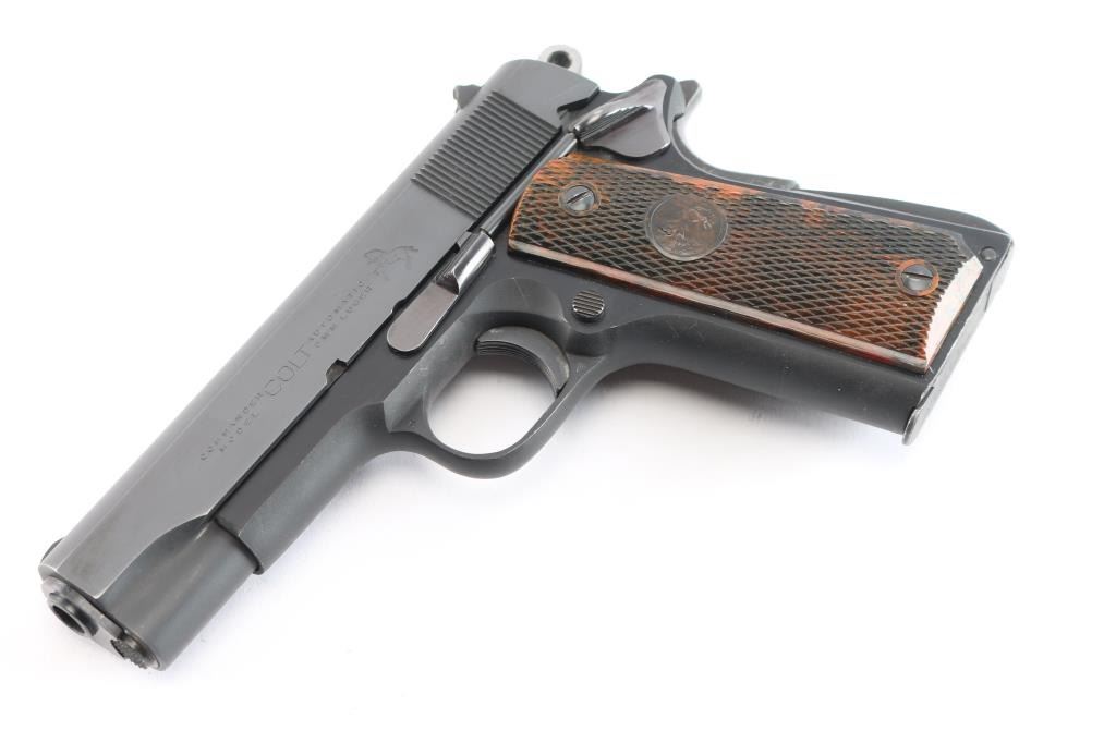 Lightweight 1911A1 pattern single action semi-automatic compact pistol, manufactured in Hartford, CT circa 1968. Matte blued slide with polished flats, 4.25" barrel, low-profile blade front sight, dovetailed rear sight with square notch, serrated ‘long’ trigger, serrated round hammer spur, manual safety on the left side of the frame, grip safety, push button magazine release, factory 9 round magazine, alloy frame with serrated arched mainspring housing and 'Coltwood" grips. Pistol retains approximately 96% of its finish showing light scratches on the slide and frame. Action is sound, the bore is excellent/bright and Coltwood grips are excellent.