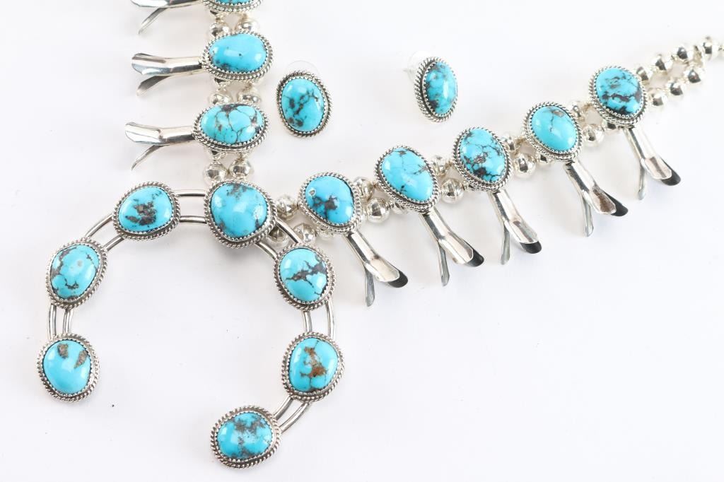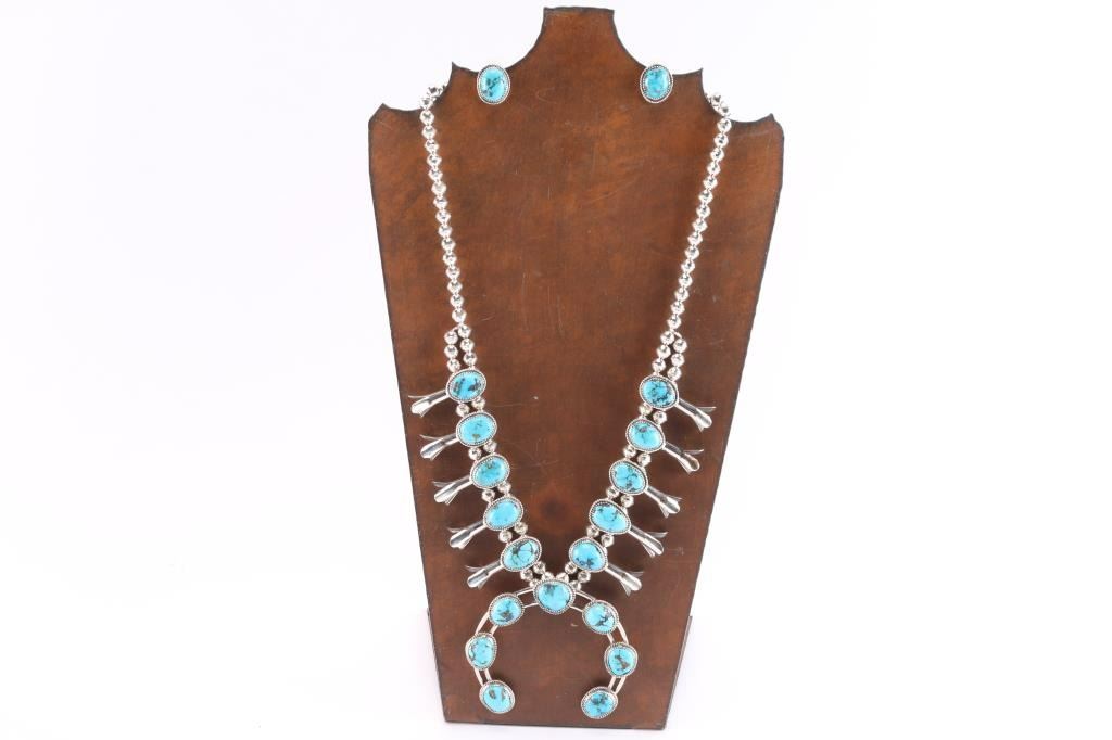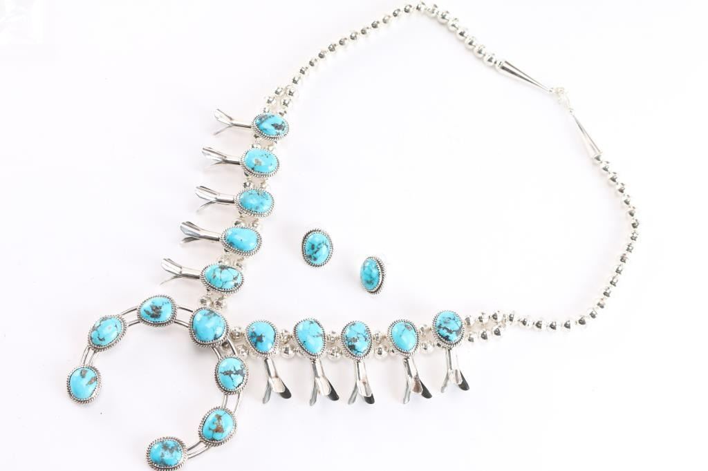 Featuring Ithaca Peak turquoise in an abundance of beautifully matrixed stones, a complete traditional ensemble with matching post earrings. Bezel set and wrapped in sterling twist wire, this classic design lets the beautiful blue-greens and brown matrix take center stage. The naja is 3-3/4" wide and 3-1/8" tall and is accented with 10 three petal stations which are strung on 8mm seamed desert pearl strands. Including the hook/eye clasp, it's 27" long. Post backed matching earrings are about 1" long. Stamped sterling and hallmarked.