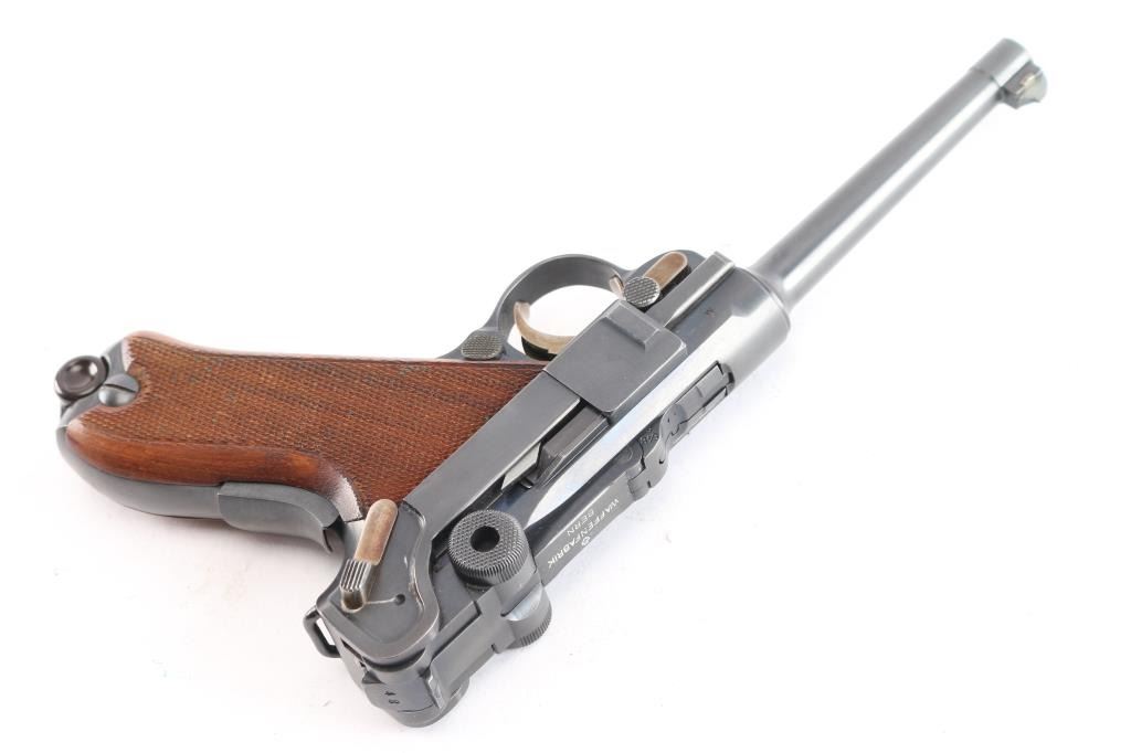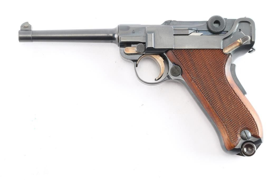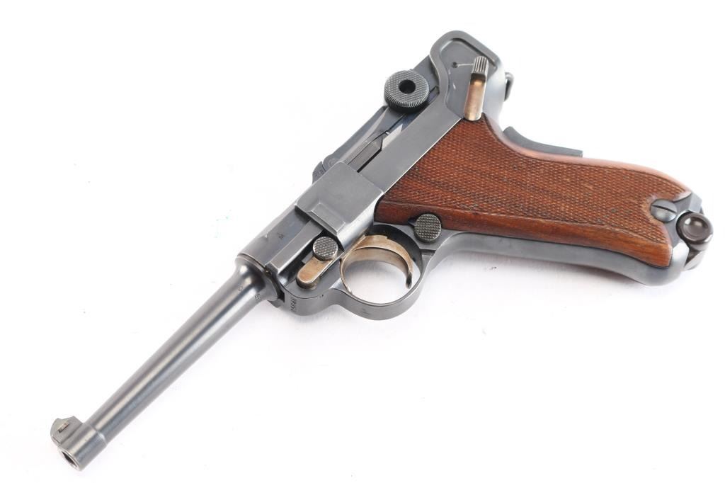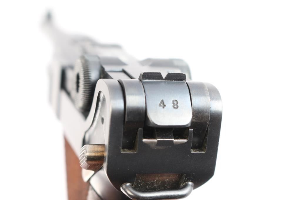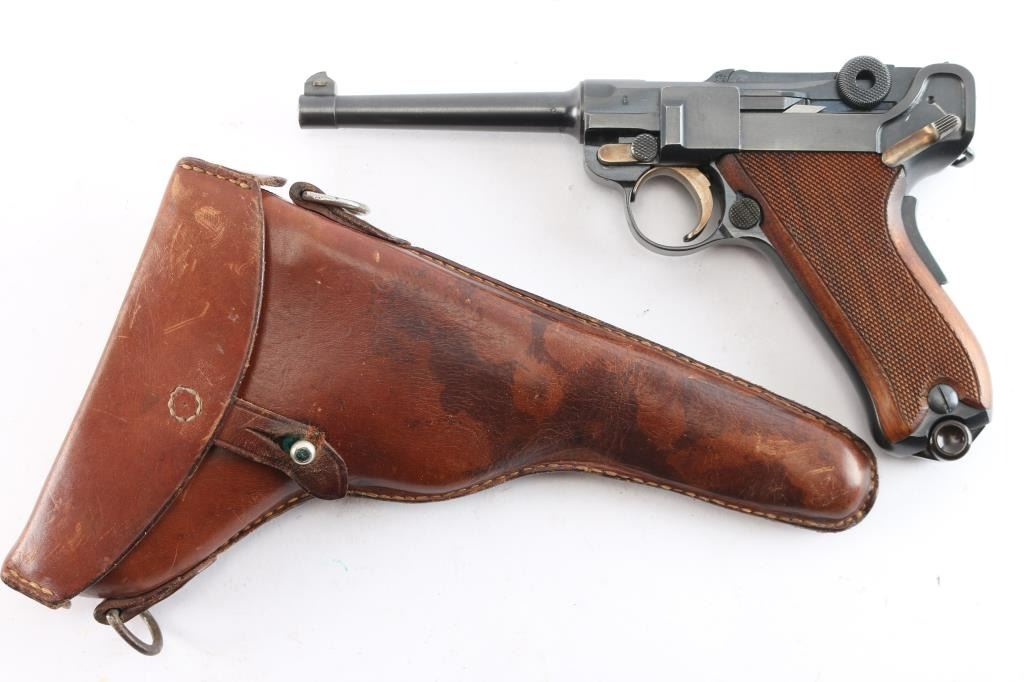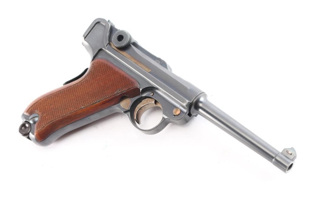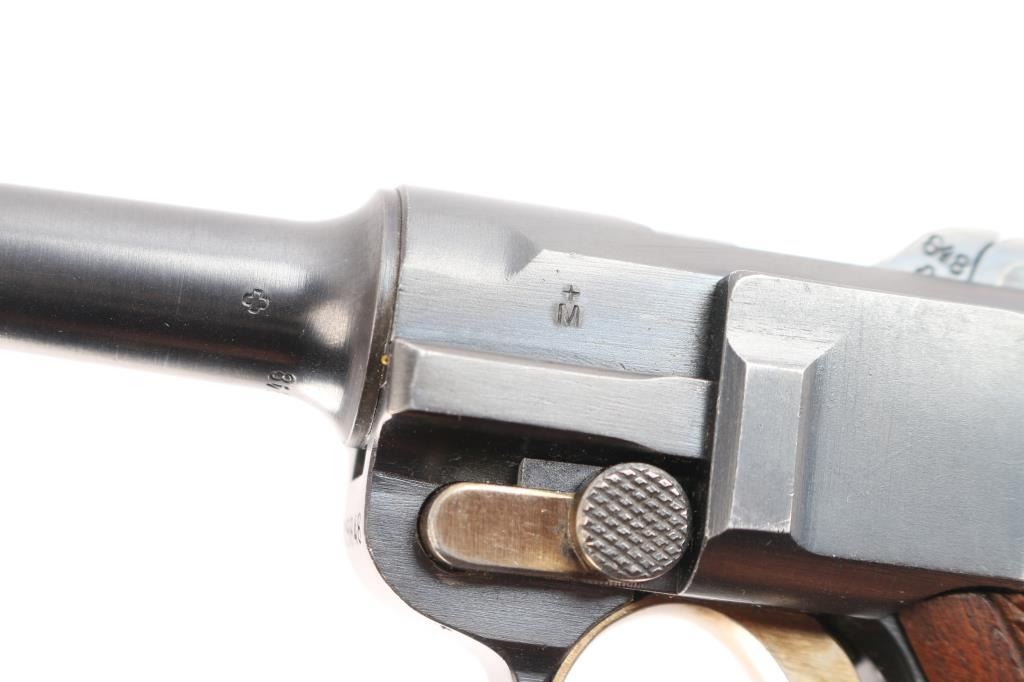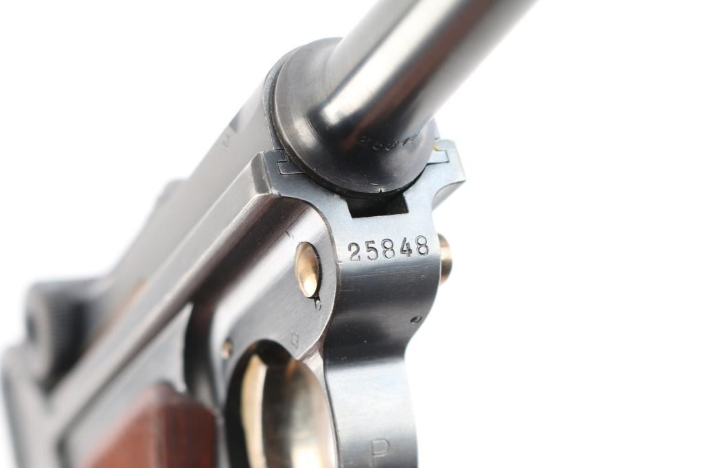Swiss Model 1906, chambered in the correct 7.65×21 Parabellum.(.30 Luger). This is a classic Swiss Luger-pattern service pistol, renowned for its precision machining, exceptional fit and finish, and outstanding accuracy. Semiautomatic toggle-link pistol made in Switzerland. Features blued finish, checkered wood grips, 4.7" barrel, fixed sights, manual safety, grip safety, lanyard bar. Bore is excellent/bright. Retains about 97% blue with minor edge losses and scuff on the lower back strap. Retains 90% straw color on take down latch, safety lever and trigger. Grips are very good condition. Observed numbers match, no importer marks observed, Swiss cross emblem proofs on slide & receiver. "Waffenfabrik Bern" marked toggle highlighted in white. Manufactured from approximately 1918 to 1933,Includes correct magazine with bakelite plug, marked with a stylized "P" for Rudolf Pfanninger. and correct period brown leather holster, no carrying strap, overall good condition, stitching intact but the closure loop is broken.