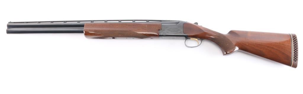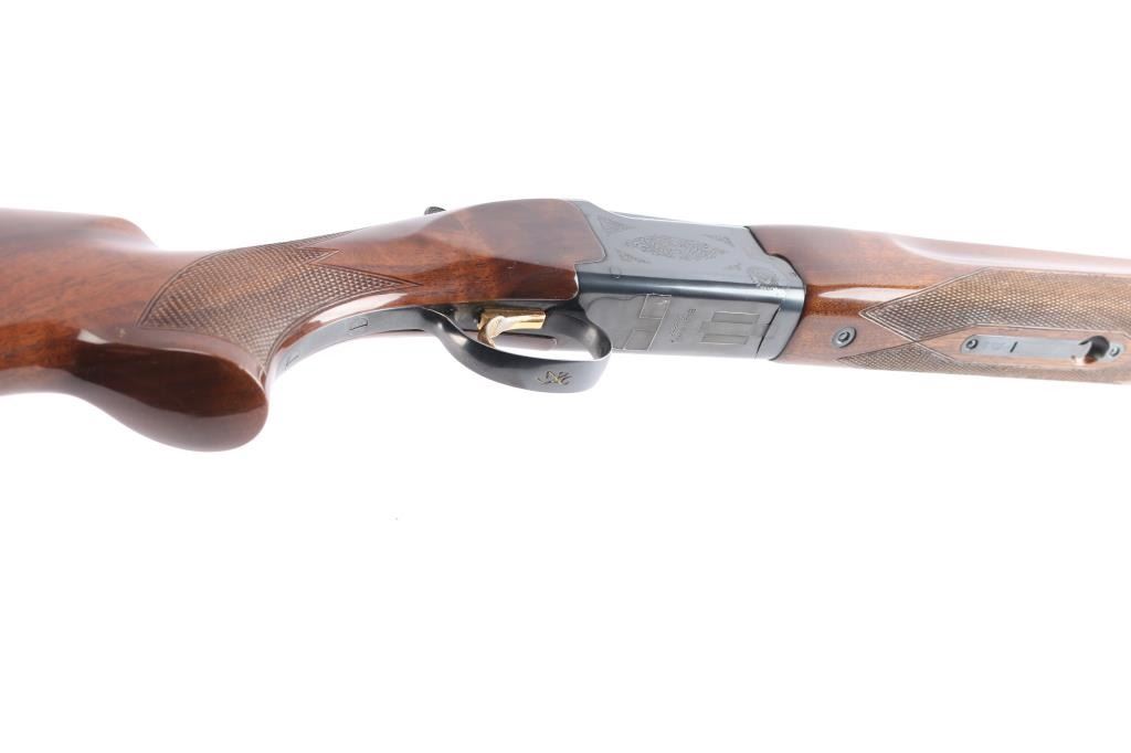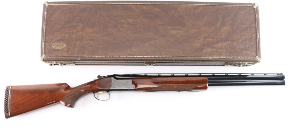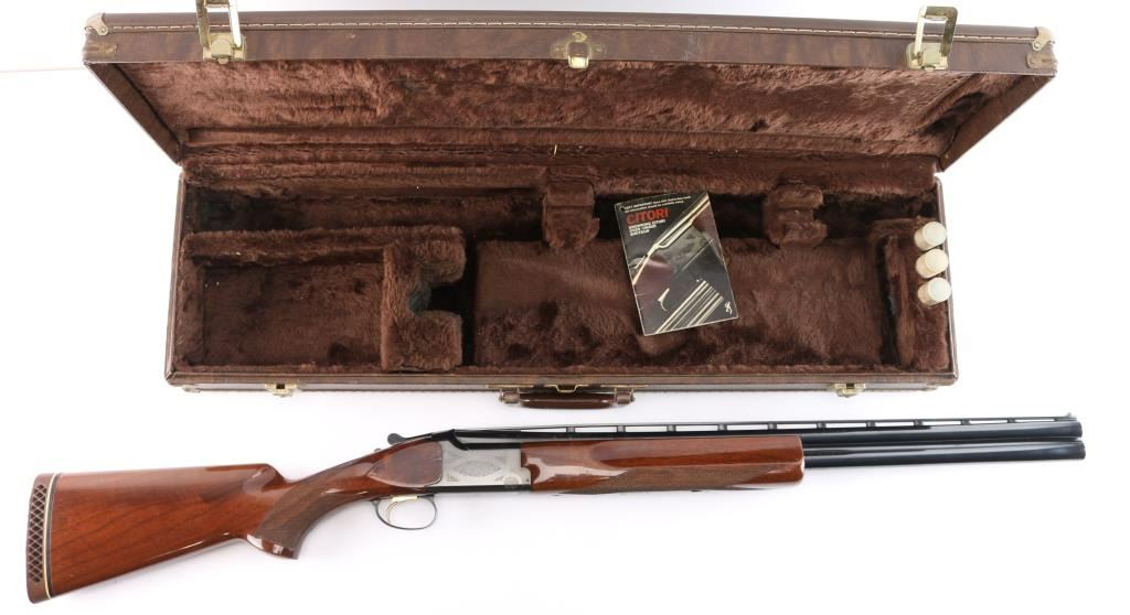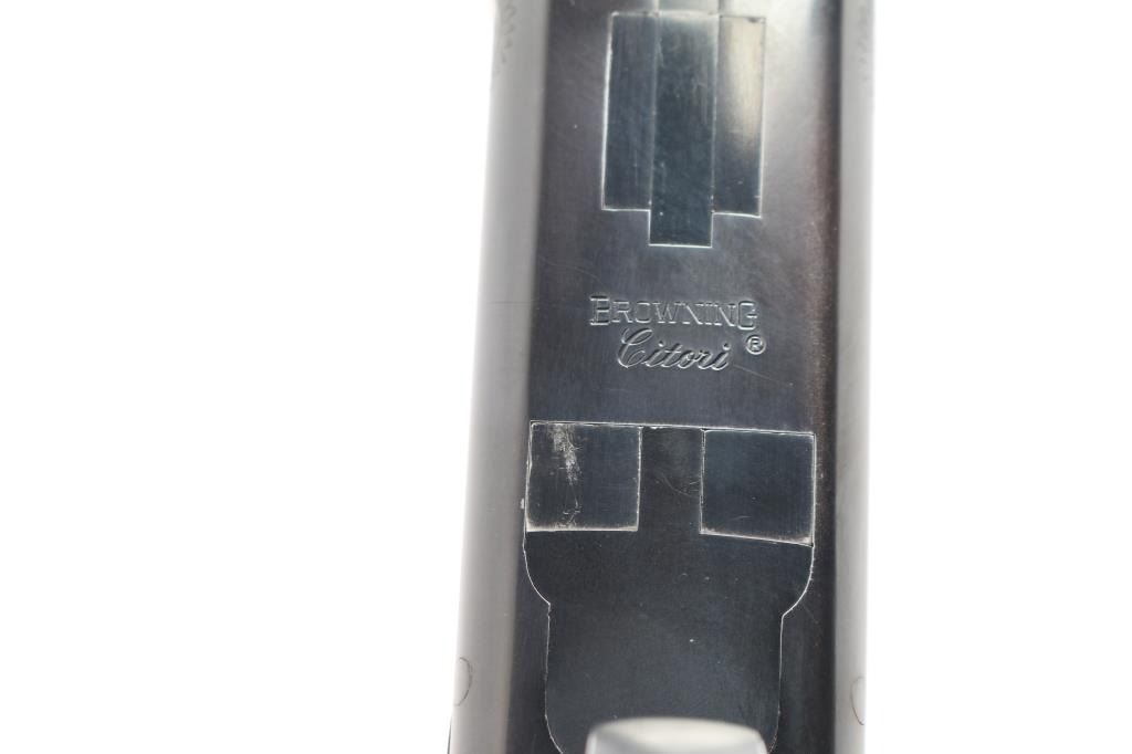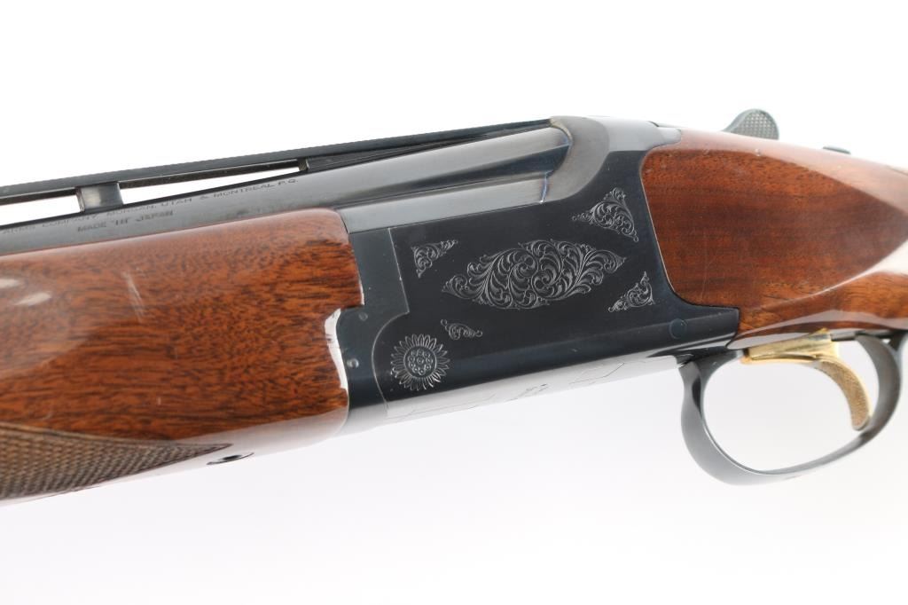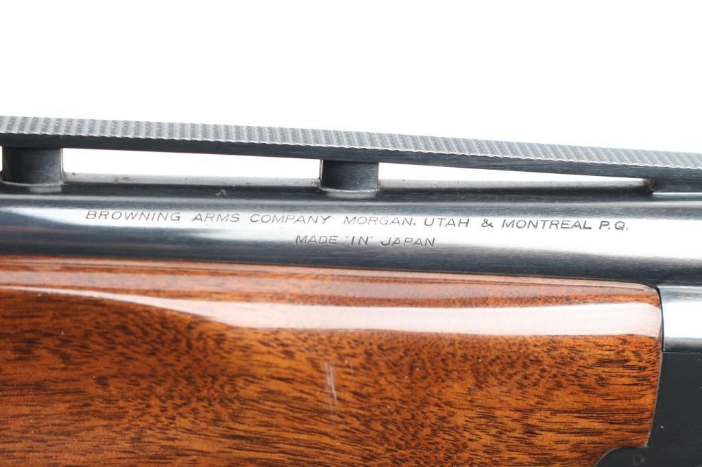 Japanese made over and under box-lock shotgun chambered for 2 3/4" 12 Gauge shells, manufactured circa 1996. Grade 1 'Skeet' shotgun imported by Browning Arms Company out of Morgan, UT. Featuring a blued finish, 26" raised ventilated ribbed barrels, accepts Invector chokes with Skeet / Skeet tubes installed, Bradley front sight with white insert, white mid-bead, selective ejectors, single wide checkered gold-toned inertia trigger, and serrated sliding tang safety and barrel selector. The walnut furniture consists of a semi-pistol grip shoulder stock with checkering at the wrist, grooved and checkered forend with deeley latch release, long lower tang, 14 1/4" length-of-pull, 1-3/8" drop at comb, 1-7/8" drop at heel, and a brown rubber ventilated factory recoil pad. The receiver displays limited coverage of floral scrolls on the left and right sides, and the deeley release is also engraved. Receiver, forend, and barrels all have matching serial numbers, '06234.' The original blued finish remaining is approximately 94% with slight edge wear, contact wear, small scattered scratches, and carry wear. Bores are bright, but need a cleaning. The action is opens easily with tight lock-up & the top lever resting right of center. Furniture wood is Very Good with scattered scratches, and small dings. The metal shows a small patch of light surface rust on the left side of the vent rib about 3 3/4" from the muzzle. Shotgun includes luggage style brown faux leather factory hard case, manuals, and three Invector choke tubes. This shotgun would be Very Good without the observed rust.
