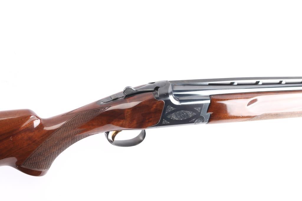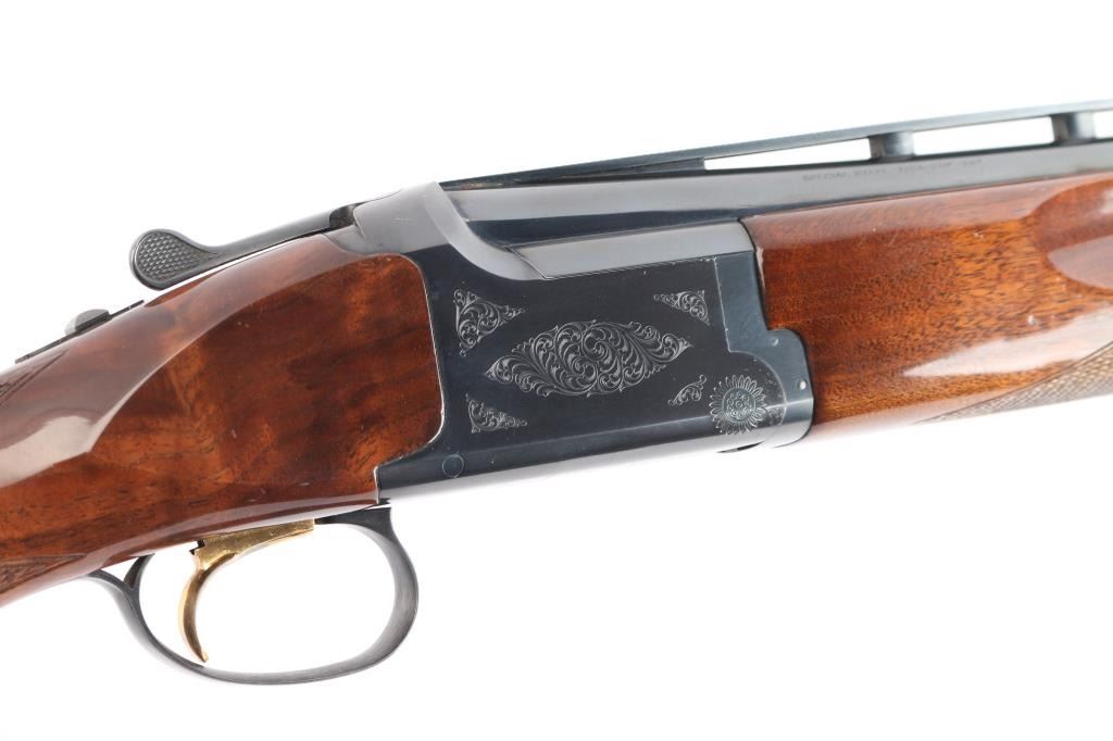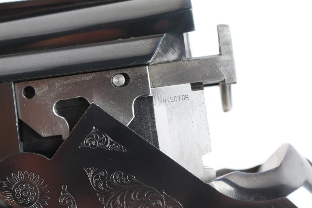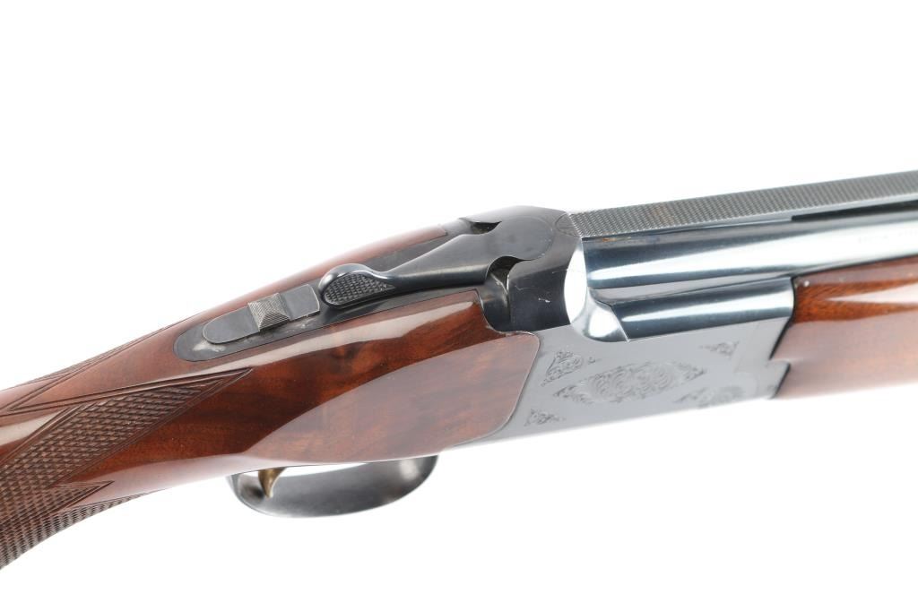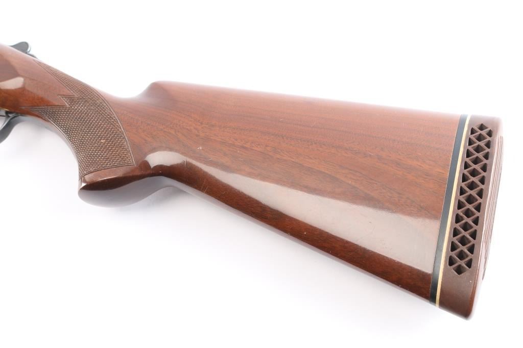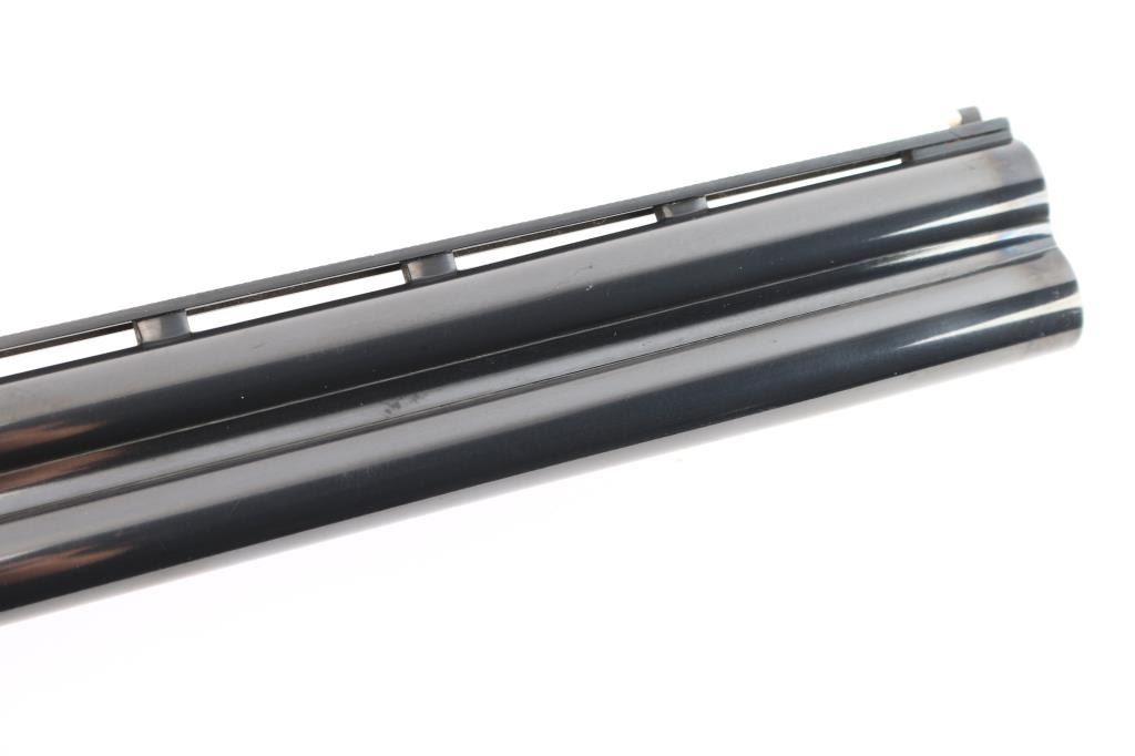 Japanese made over and under box-lock shotgun chambered for 2 3/4" 12 Gauge shells, manufactured circa 1996. Grade 1 'Skeet' shotgun imported by Browning Arms Company out of Morgan, UT. Featuring a blued finish, 26" raised ventilated ribbed barrels, accepts Invector chokes with Skeet / Skeet tubes installed, Bradley front sight with white insert, white mid-bead, selective ejectors, single wide checkered gold-toned inertia trigger, and serrated sliding tang safety and barrel selector. The walnut furniture consists of a semi-pistol grip shoulder stock with checkering at the wrist, grooved and checkered forend with deeley latch release, long lower tang, 14 1/4" length-of-pull, 1-3/8" drop at comb, 1-7/8" drop at heel, and a brown rubber ventilated factory recoil pad. The receiver displays limited coverage of floral scrolls on the left and right sides, and the deeley release is also engraved. Receiver, forend, and barrels all have matching serial numbers, '06234.' The original blued finish remaining is approximately 94% with slight edge wear, contact wear, small scattered scratches, and carry wear. Bores are bright, but need a cleaning. The action is opens easily with tight lock-up & the top lever resting right of center. Furniture wood is Very Good with scattered scratches, and small dings. The metal shows a small patch of light surface rust on the left side of the vent rib about 3 3/4" from the muzzle. Shotgun includes luggage style brown faux leather factory hard case, manuals, and three Invector choke tubes. This shotgun would be Very Good without the observed rust.