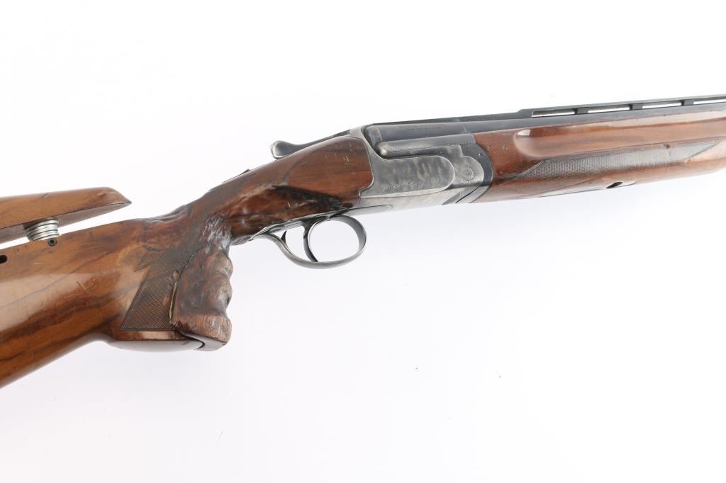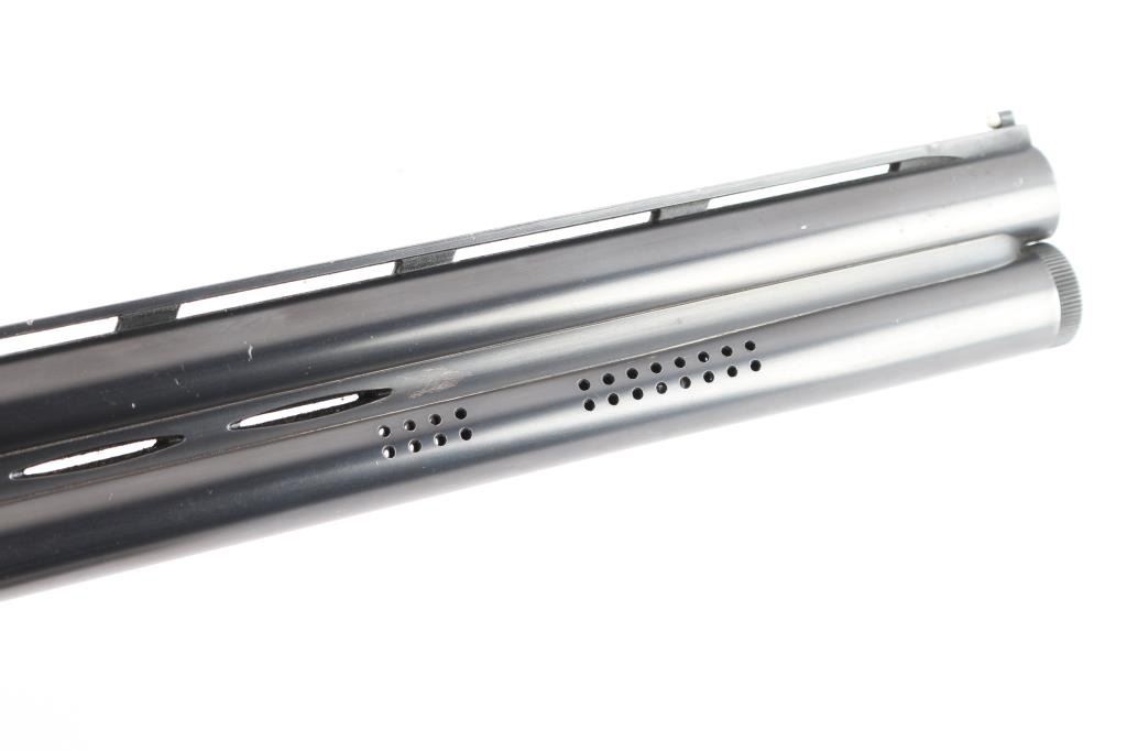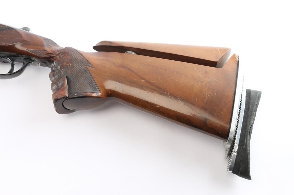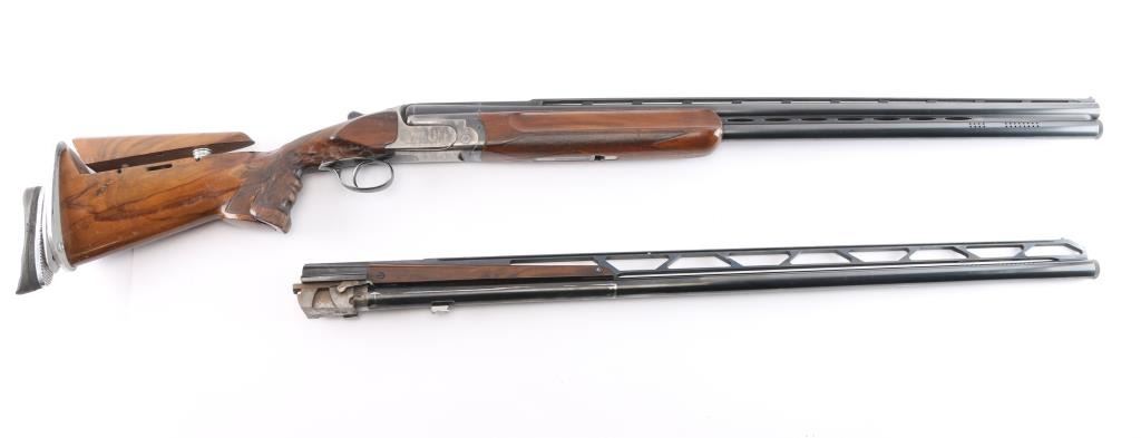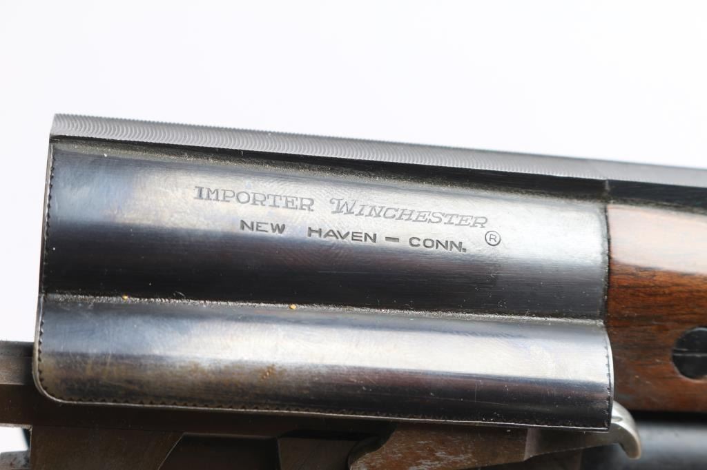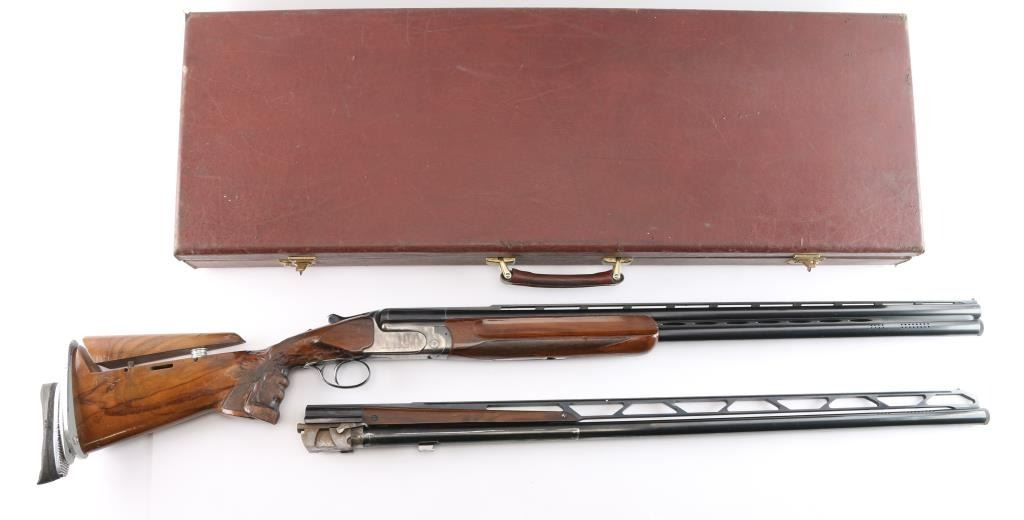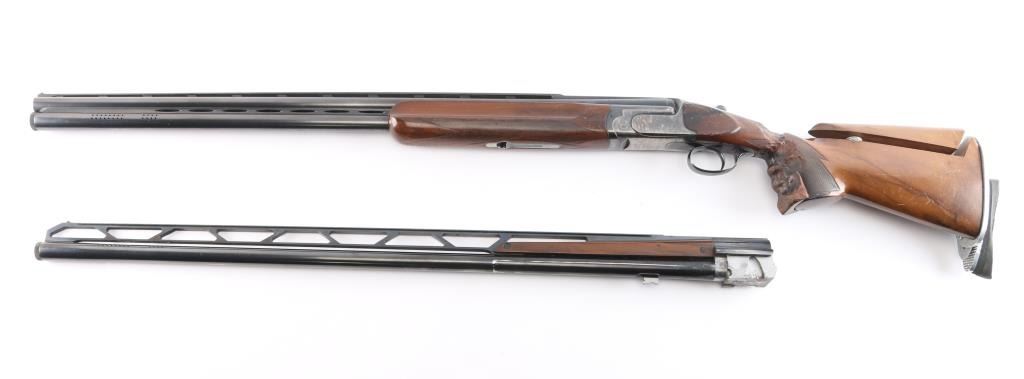 Italian made over and under box-lock shotgun chambered for 2 3/4" 12 gauge shells manufactured in Brescia, Italy circa 1980 (AF date code). Imported by Winchester out of New Haven, CT. It features blued 29 1/2" barrels with a vent rib, white bead front sight, white bead rear sight, single smooth curved trigger, dual ejectors, and ported bottom barrel with choke tube. The stock is hardwood with an adjustable comb, adjustable recoil pad, checkered and modified semi-pistol grip, and a checkered beavertail forend. The top bore measures 'F' with a drop-in gauge, and the bottom bore is wide open even with the choke installed. The adjustable recoil pad looks to be aftermarket and the attachment plate is oversized. The stock above the trigger guard is cracked and seems to have been repaired. The length-of-pull measures approximately 13 3/4". The bores look good. The blued finish is approximately 92% with scattered scratches and some edge wear. The color-case-hardened receiver looks very good except for a tiny spot of rust on the left side. This shotgun comes with a case, an extra barrel, tools, a box of three choke tubes (marked 4,7, and 8), and an extra trigger group. The extra barrel is a single barrel with porting, a vent rib, white bead front sight, rear bead broken off, smooth hardwood panels above the barrel, and threaded for choke tubes (choke measures 'IC' with a drop-in gauge). The extra barrel shows rust on the front of the vent rib, and by the hinge pin/barrel lug area.