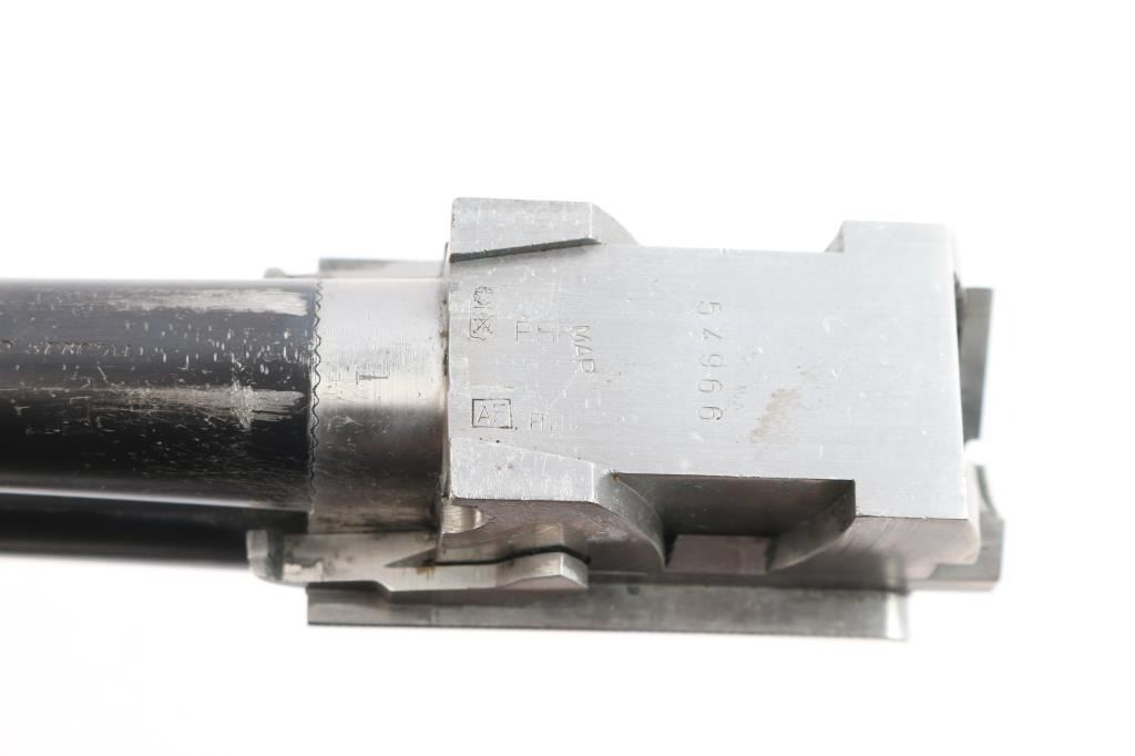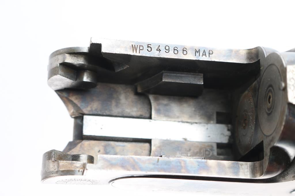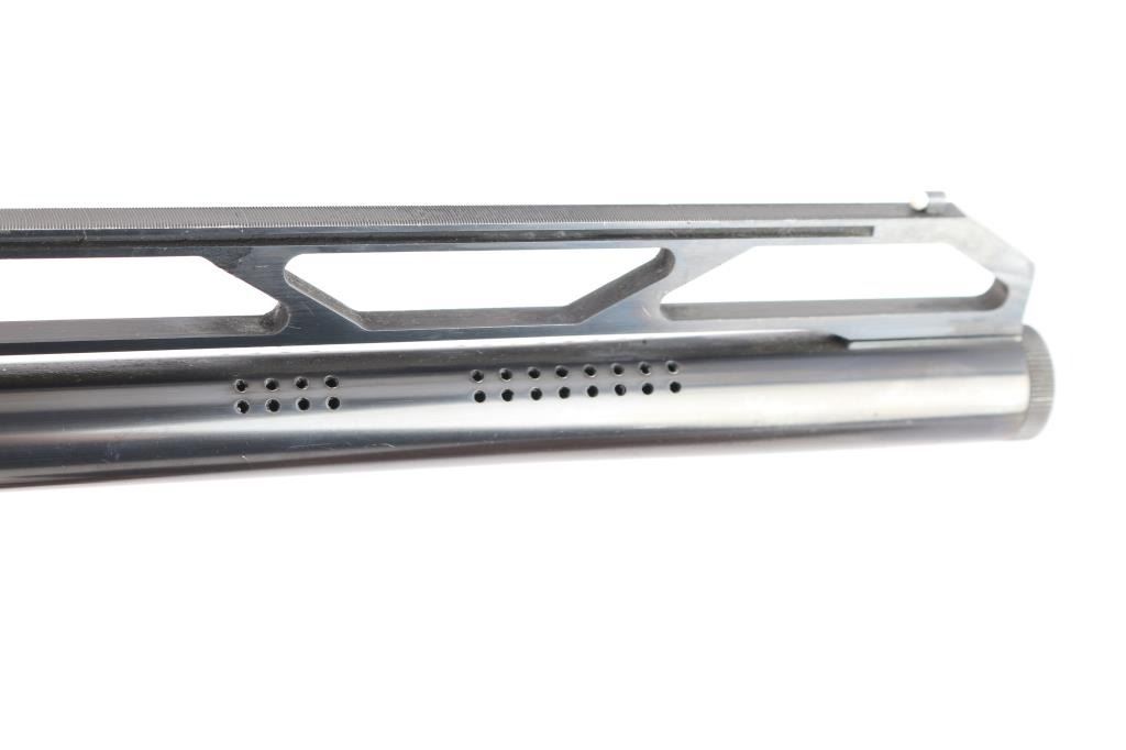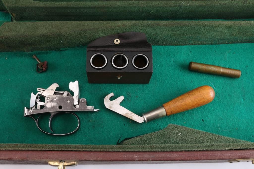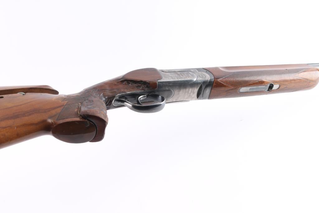 Italian made over and under box-lock shotgun chambered for 2 3/4" 12 gauge shells manufactured in Brescia, Italy circa 1980 (AF date code). Imported by Winchester out of New Haven, CT. It features blued 29 1/2" barrels with a vent rib, white bead front sight, white bead rear sight, single smooth curved trigger, dual ejectors, and ported bottom barrel with choke tube. The stock is hardwood with an adjustable comb, adjustable recoil pad, checkered and modified semi-pistol grip, and a checkered beavertail forend. The top bore measures 'F' with a drop-in gauge, and the bottom bore is wide open even with the choke installed. The adjustable recoil pad looks to be aftermarket and the attachment plate is oversized. The stock above the trigger guard is cracked and seems to have been repaired. The length-of-pull measures approximately 13 3/4". The bores look good. The blued finish is approximately 92% with scattered scratches and some edge wear. The color-case-hardened receiver looks very good except for a tiny spot of rust on the left side. This shotgun comes with a case, an extra barrel, tools, a box of three choke tubes (marked 4,7, and 8), and an extra trigger group. The extra barrel is a single barrel with porting, a vent rib, white bead front sight, rear bead broken off, smooth hardwood panels above the barrel, and threaded for choke tubes (choke measures 'IC' with a drop-in gauge). The extra barrel shows rust on the front of the vent rib, and by the hinge pin/barrel lug area.