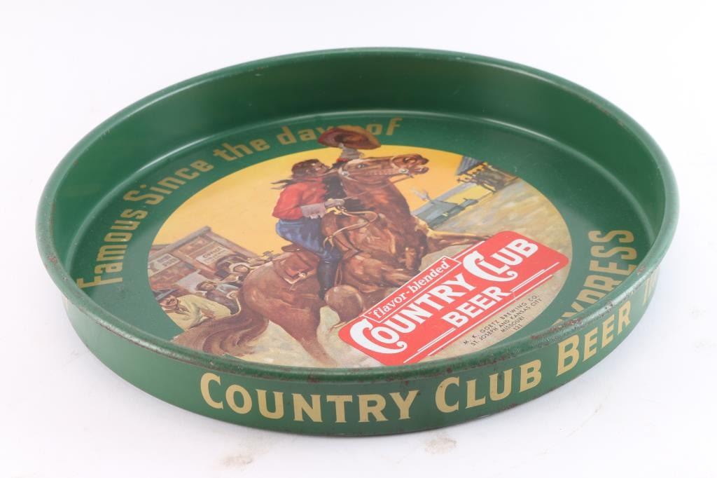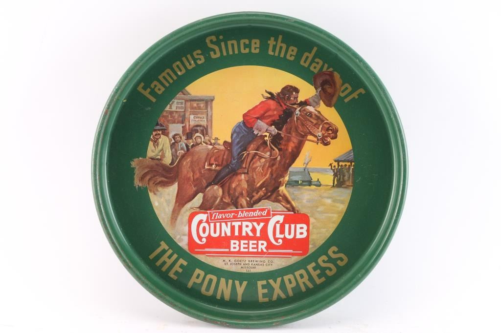 For "Country Club Beer", M. K. Goetz Brewing Co., St. Joseph and Kansas City, Missouri. Features pony express rider. Very desirable, condition rated at 7.5-8.5 on 1-10 scale. Minor dents, scratches, edge wear but far better than average.
