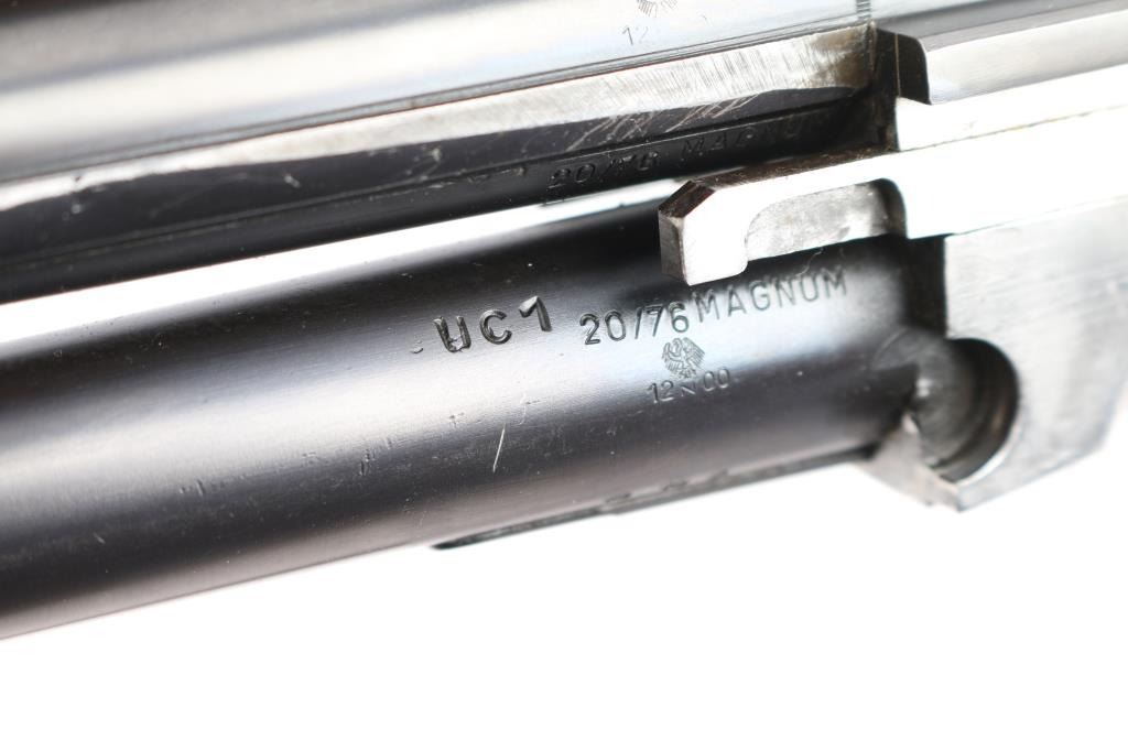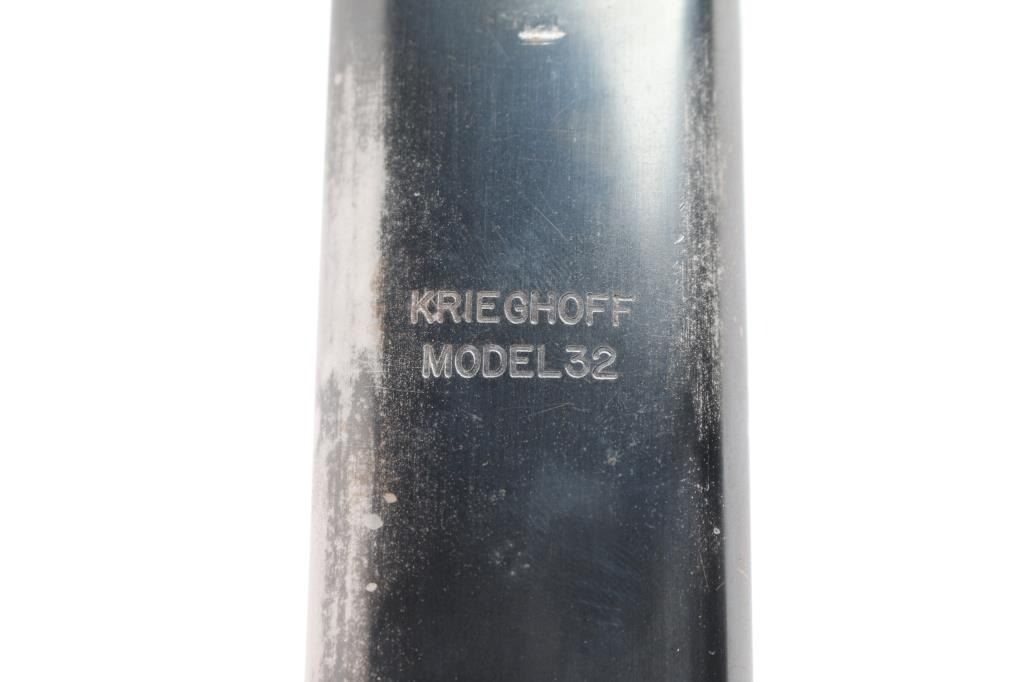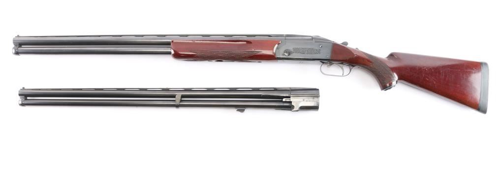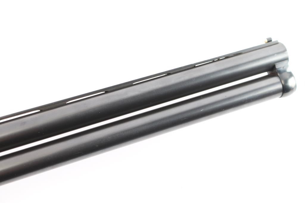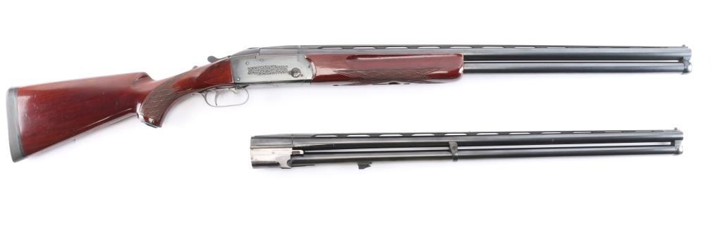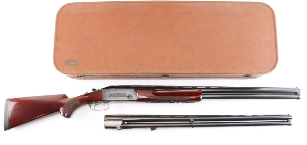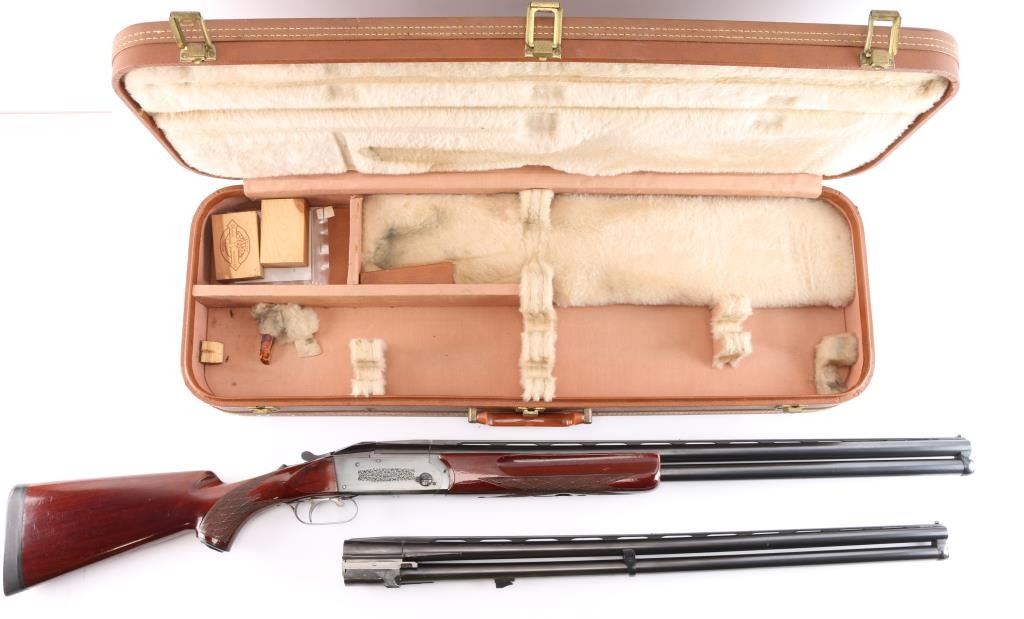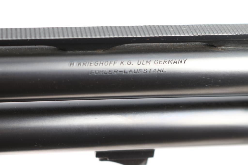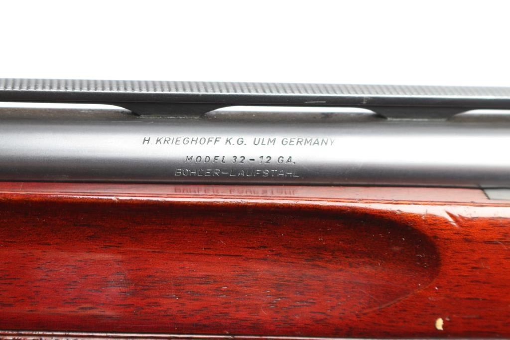 'Factory 12/20 Combo 2 Barrel Set' German made over and under box-lock shotgun chambered for 3" 12 Gauge shells and also includes a serial number matched set of 20 gauge barrels. Manufactured circa 1967, in Ulm, Germany. Imported by Europa Corporation out of Miami, FL. Shotgun features a blued finish, 28" vent rib barrels, fixed chokes measure Negative / Negative w/ drop in gauge, ejectors, Bradley style front sight with white insert, small brass mid-bead, single smooth curved selective trigger (in-the-white), barrel selector in front of the trigger, checkered sliding tang safety with a button to put the shotgun back into 'fire,' and a checkered top lever. The frame is decorated with an un-bordered panel of deep relief floral scroll engraving on the right & left sides. The barrels are marked "H. KRIEGHOFF OHG. ULM GERMANY MODEL 32 - 12 GA. BOHLER-LAUFSTAHL." The gloss finished hardwood furniture consists of a semi-pistol grip shoulder stock with checkering at the wrist, grooved and checkered semi-beaver tail forearm with serrated deeley latch release, contrasting black plastic grip cap, 14" length-of-pull, 1-3/8" drop at comb, 2-1/4" drop at heel, and solid black rubber Decelerator recoil pad. Bores appear bright and shiny, and the action is smooth and crisp. The furniture wood is Fair to Good with a good amount of scattered scratches, small dents and dings, some edge wear along the forend and a small repair to the right of the upper tang. The original blued finish is approximately 90% intact with scattered scratches and wear from use. Metal condition shows no observed rust or deformation. Comes with a luggage style brown Browning faux leather hard case with an extra 20 gauge barrel set. The 28" vent rib 20 gauge barrels feature ejectors, Bradley style front sight with missing insert, brass mid-bead, and fixed Negative / Negative chokes. Blued finish remaining is approximately 95% with scattered scratches, and some heavier scratches under the forend. The metal shows some small spots that look like a substance dripped on the barrels and stained the finish (about mid-barrel).