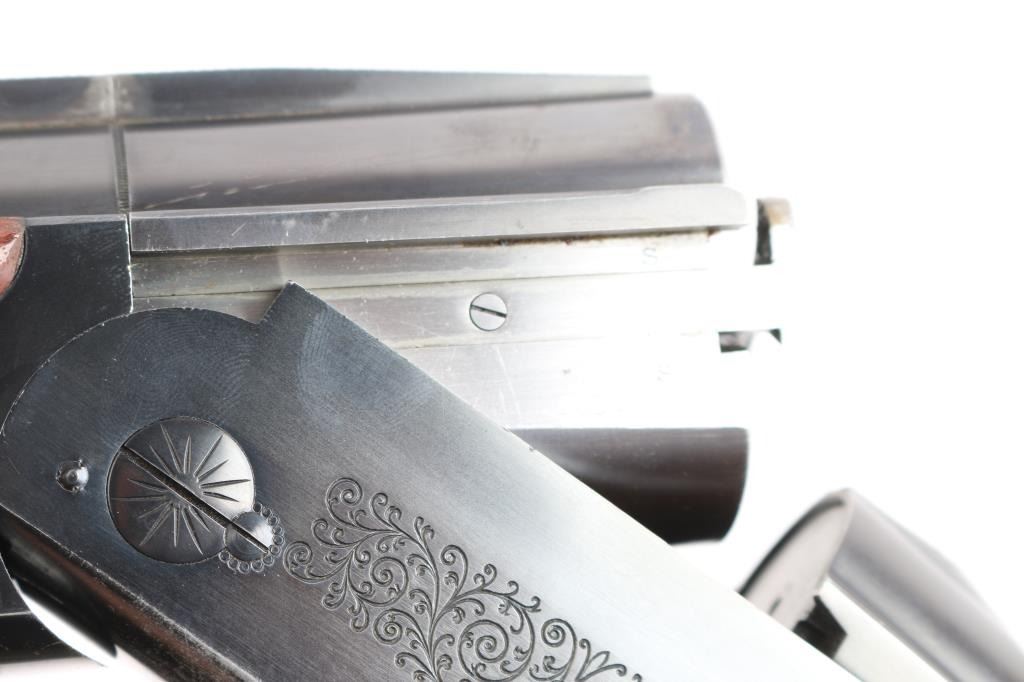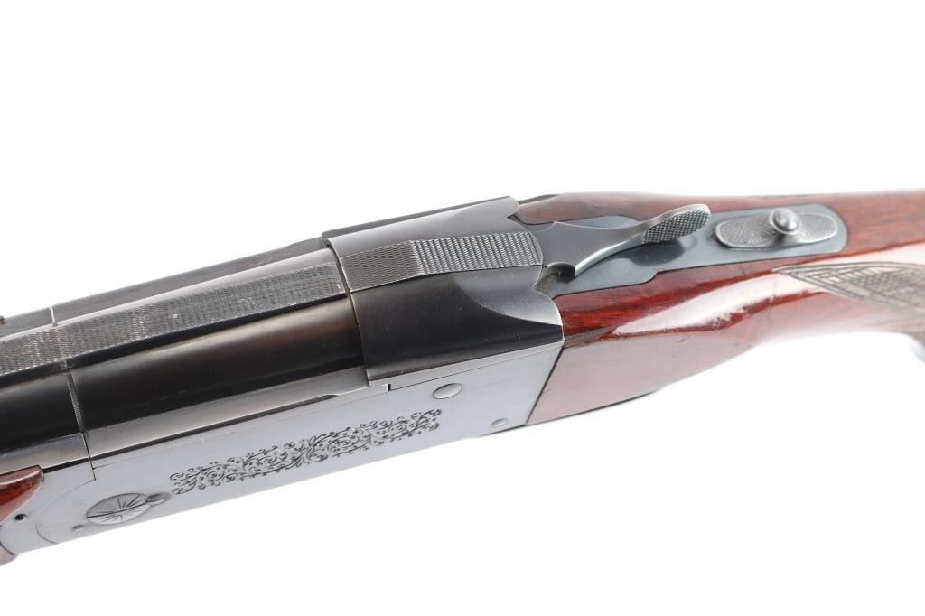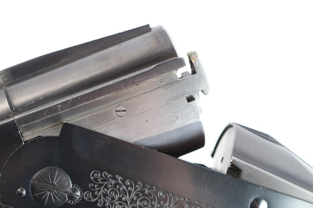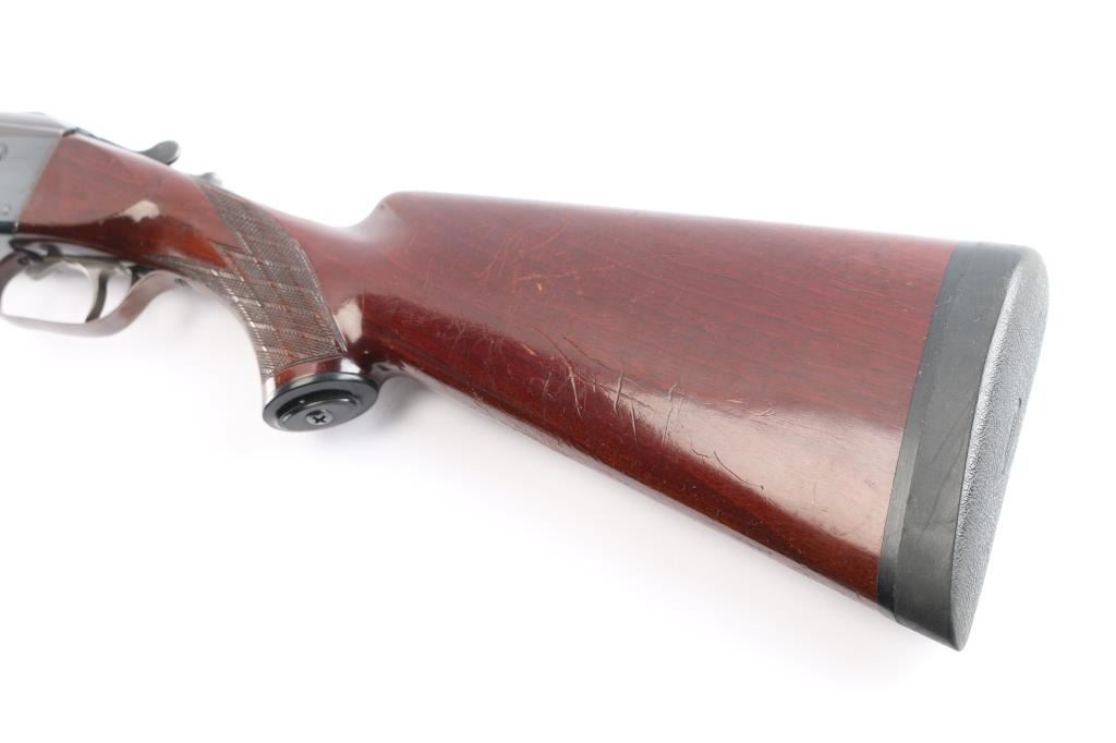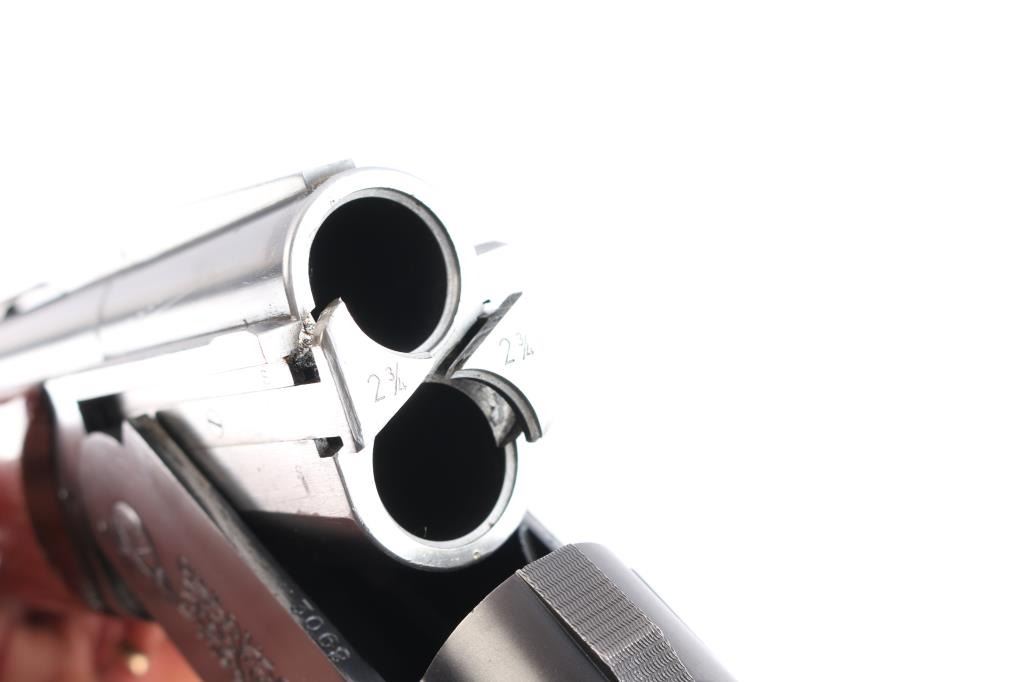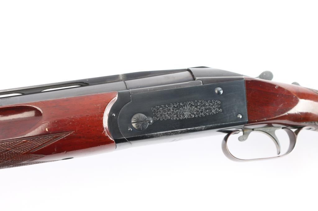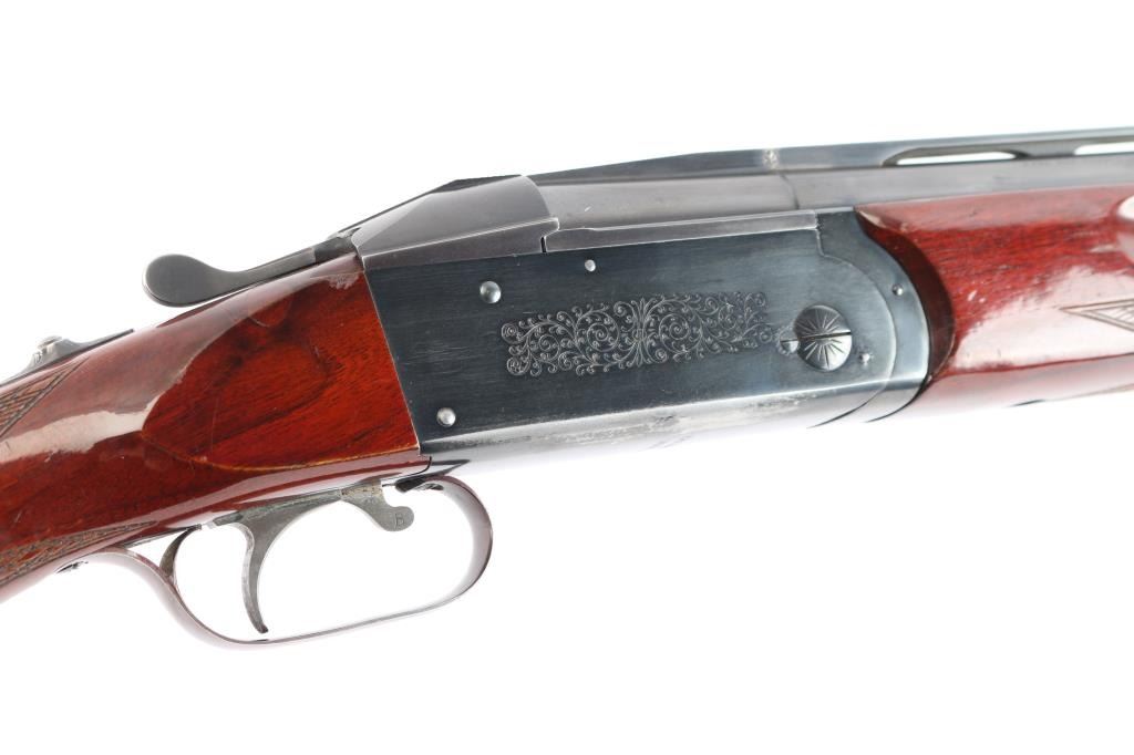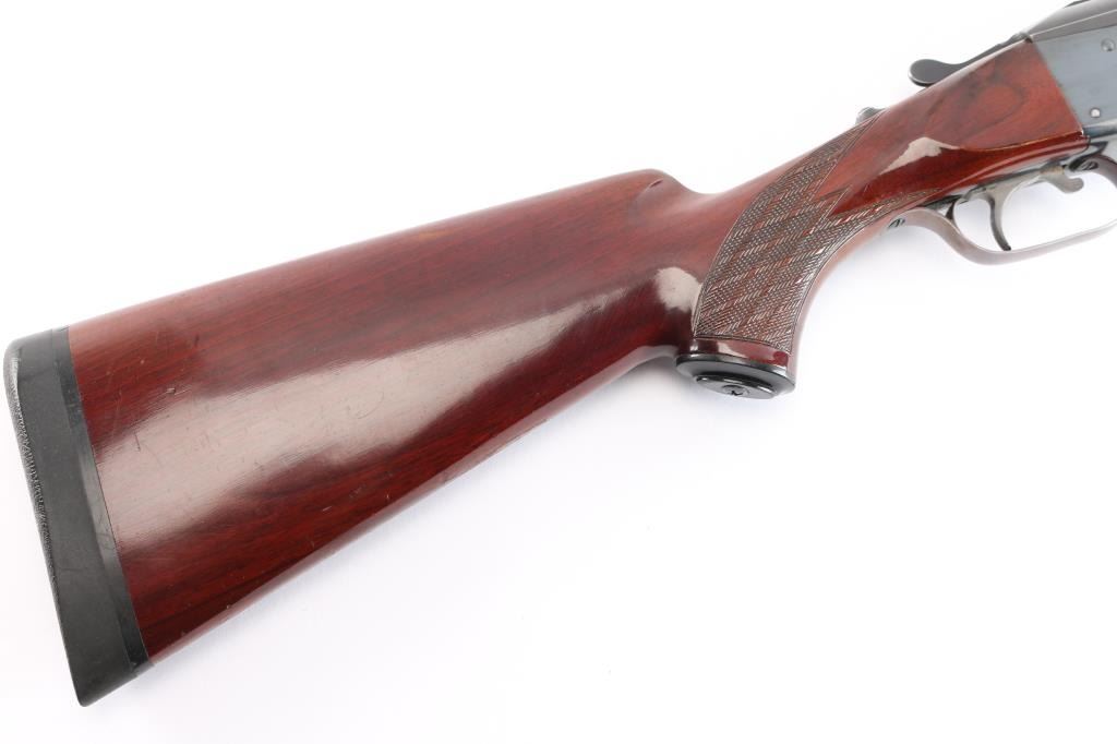 'Factory 12/20 Combo 2 Barrel Set' German made over and under box-lock shotgun chambered for 3" 12 Gauge shells and also includes a serial number matched set of 20 gauge barrels. Manufactured circa 1967, in Ulm, Germany. Imported by Europa Corporation out of Miami, FL. Shotgun features a blued finish, 28" vent rib barrels, fixed chokes measure Negative / Negative w/ drop in gauge, ejectors, Bradley style front sight with white insert, small brass mid-bead, single smooth curved selective trigger (in-the-white), barrel selector in front of the trigger, checkered sliding tang safety with a button to put the shotgun back into 'fire,' and a checkered top lever. The frame is decorated with an un-bordered panel of deep relief floral scroll engraving on the right & left sides. The barrels are marked "H. KRIEGHOFF OHG. ULM GERMANY MODEL 32 - 12 GA. BOHLER-LAUFSTAHL." The gloss finished hardwood furniture consists of a semi-pistol grip shoulder stock with checkering at the wrist, grooved and checkered semi-beaver tail forearm with serrated deeley latch release, contrasting black plastic grip cap, 14" length-of-pull, 1-3/8" drop at comb, 2-1/4" drop at heel, and solid black rubber Decelerator recoil pad. Bores appear bright and shiny, and the action is smooth and crisp. The furniture wood is Fair to Good with a good amount of scattered scratches, small dents and dings, some edge wear along the forend and a small repair to the right of the upper tang. The original blued finish is approximately 90% intact with scattered scratches and wear from use. Metal condition shows no observed rust or deformation. Comes with a luggage style brown Browning faux leather hard case with an extra 20 gauge barrel set. The 28" vent rib 20 gauge barrels feature ejectors, Bradley style front sight with missing insert, brass mid-bead, and fixed Negative / Negative chokes. Blued finish remaining is approximately 95% with scattered scratches, and some heavier scratches under the forend. The metal shows some small spots that look like a substance dripped on the barrels and stained the finish (about mid-barrel).