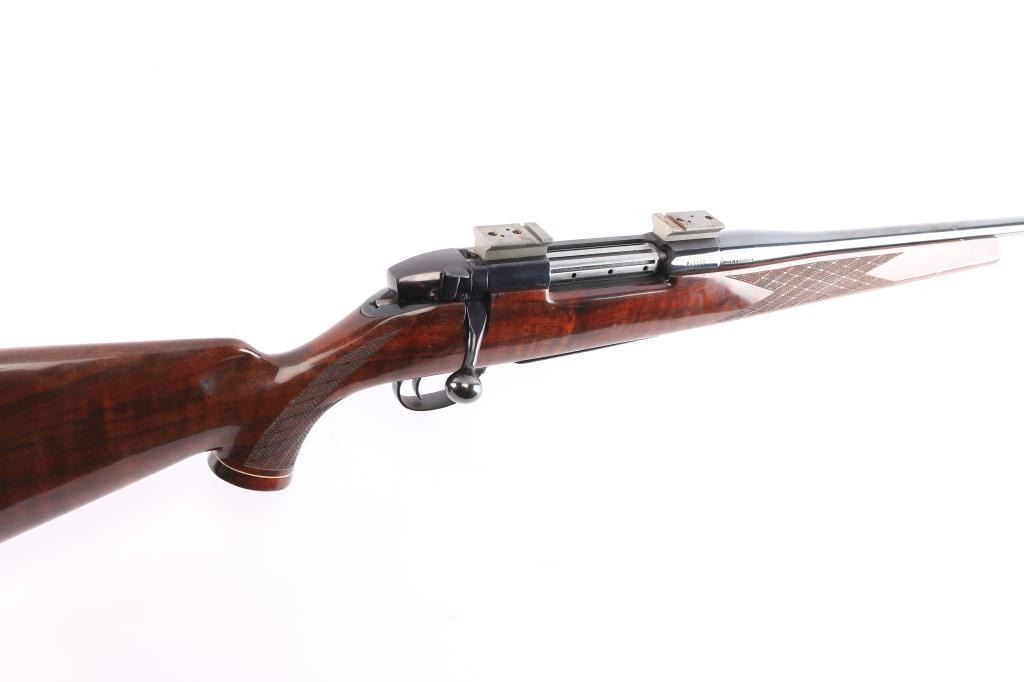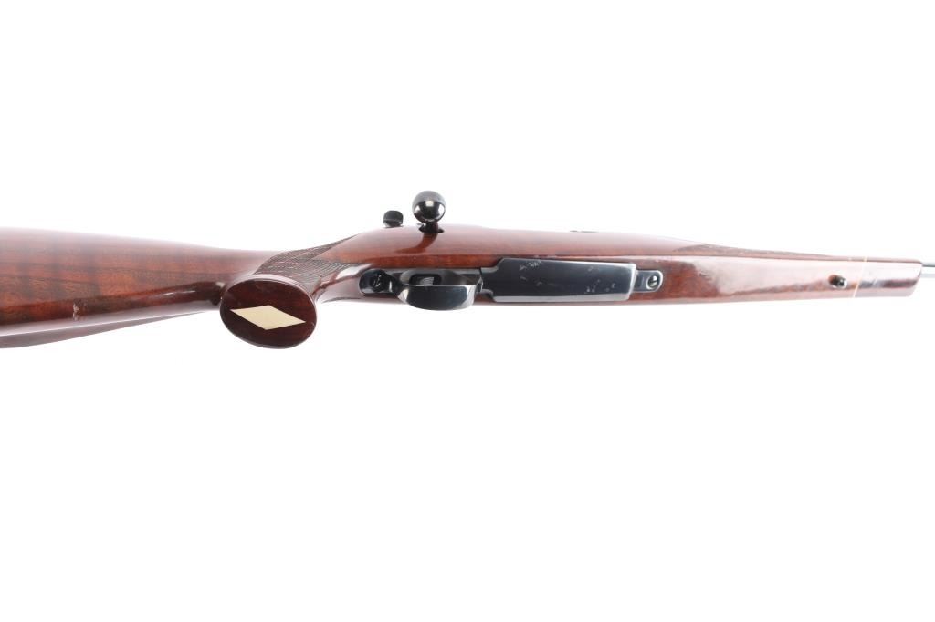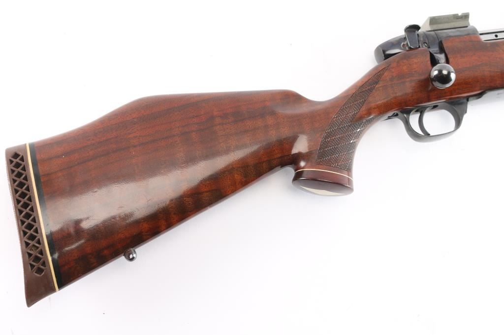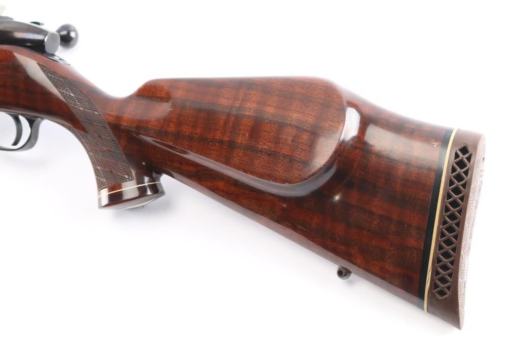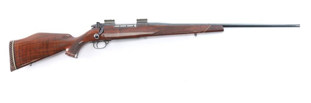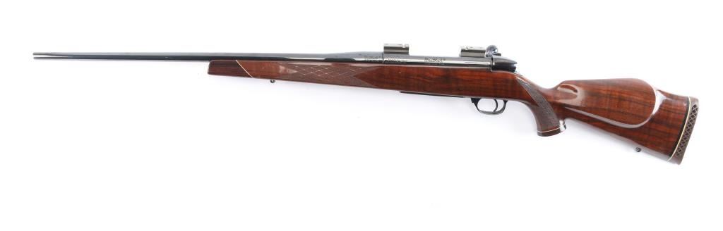 High quality bolt action rifle manufactured by J.P Sauer out of West Germany in 1971. Imported by Weatherby from South Gate, CA. Rifle features a gloss blued finish, 24" tapered barrel, scope rail sections mounted to receiver, no provisions for iron sights, serrated curved trigger, hinged floorplate, 3 lug fluted bolt, serrated bolt mounted manual safety, plum colored bolt shroud, and turned down bolt handle. The fancy figured walnut furniture consists of a Monte Carlo style stock with checkering at the wrist, right handed shadow line cheek piece with tall comb, wood grip cap with white diamond and white spacer, checkered forend, contrasting wood forend tip with white spacer, sling studs on shoulder stock and forend, and a brown ventilated rubber recoil pad with white and black spacers. The original gloss blue metal finish retained is approximately 98% with light blemishes and scratches. The metal displays small spots of rust on the sling studs, left receiver rail, and on the barrel. There was no observed metal deformation. Bore is bright with strong rifling, and the hardwood furniture is in good condition with small dings, and light scratches. The action is smooth and crisp.