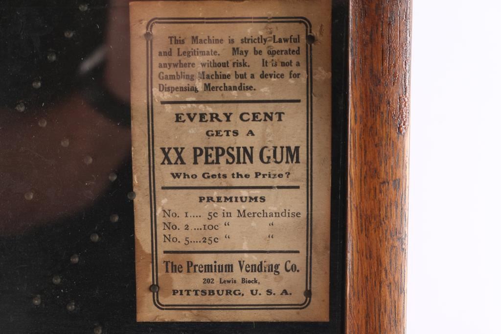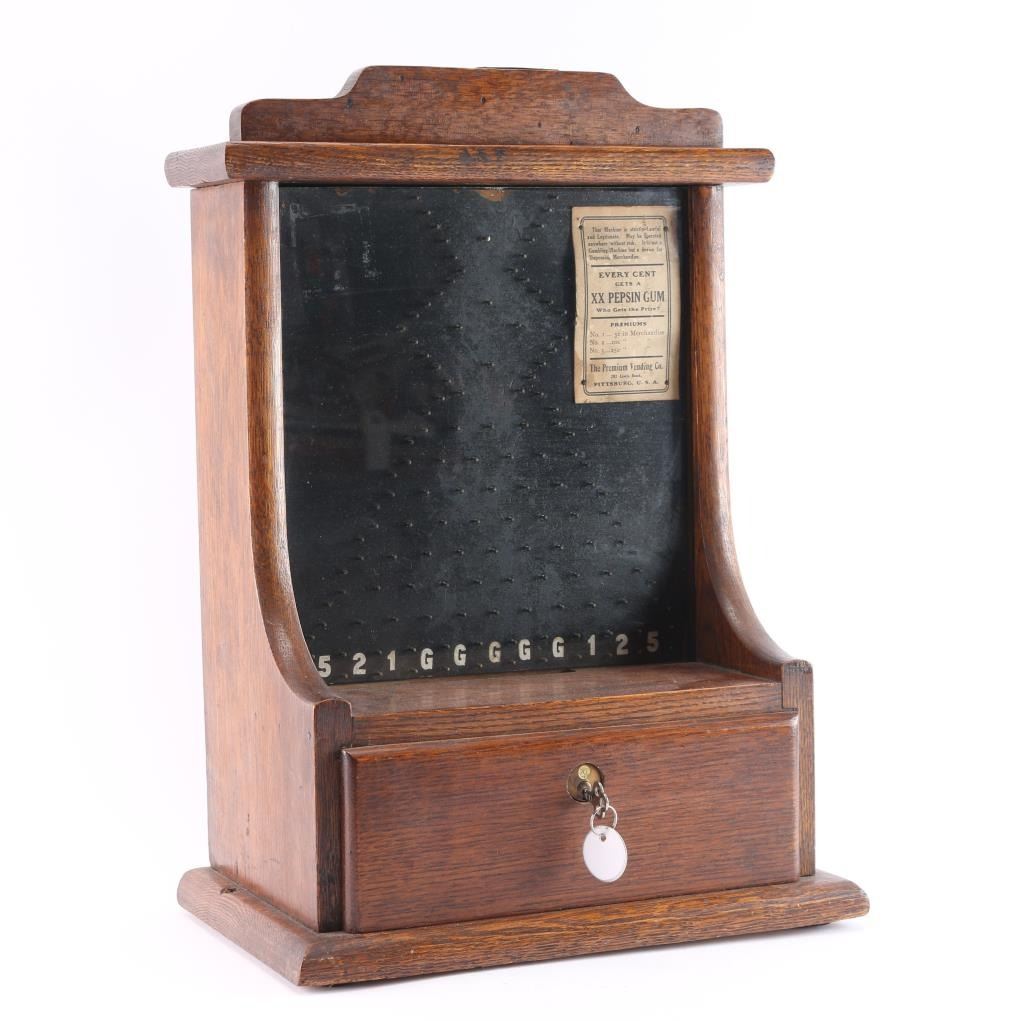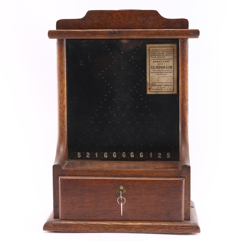 With glass front, oak body and paper label. Approximately 19 1/2" tall by 14 1/2" across by 8 1/2" deep. Penny drops from top into numbered spaces at bottom. Often used for illegal gambling at bars and speak easies by having prize payouts by bartender when "coast was clear". Very good condition.