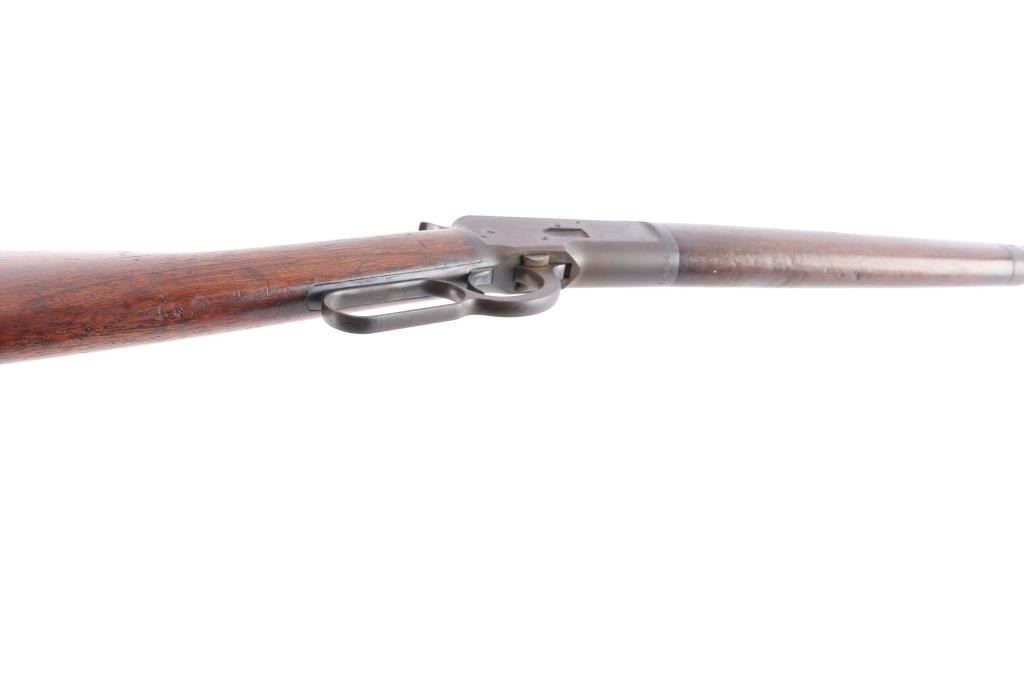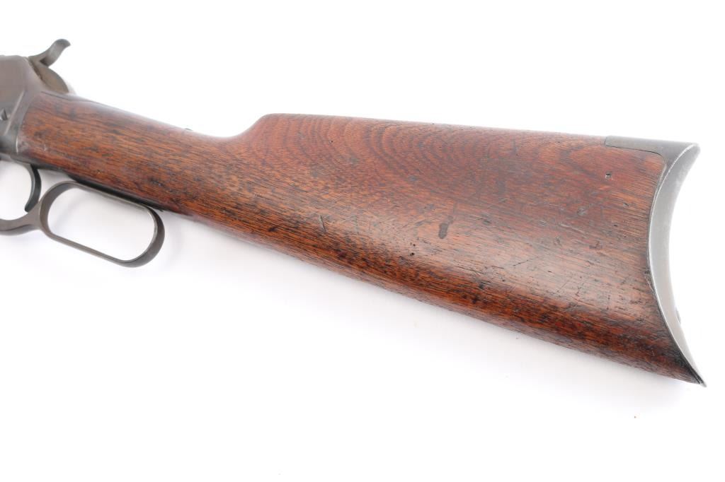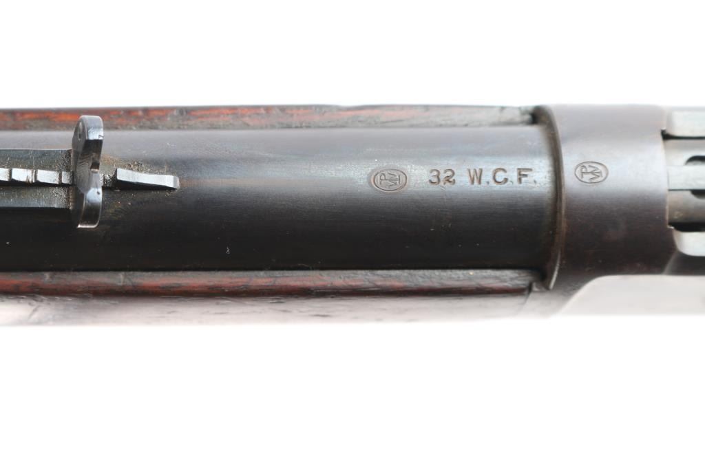 American made vintage lever action rifle chambered in .32-20 Winchester manufactured circa 1906 in New Haven, CT. It features a 24-1/4" round barrel, full length magazine tube, dovetailed blade front sight highlighted with a yellow painted dot, adjustable buckhorn rear sight, smooth walnut forend, smooth straight wristed buttstock, metal end cap, smooth steel crescent buttplate, smooth curved trigger, and exposed hammer with a checkered spur. Bore is bright with strong rifling. The original blued finish has turned a brown patina with approximately 20% remaining. There are traces of blue on the receiver, and rear of the barrel. The metal condition shows some scattered rust on the receiver, the magazine tube, and light pitting along the barrel. Winchester brand and address markings are a little shallow but legible. The caliber, proof, and serial numbers are very sharp. Wood furniture is good with scattered small dents, and scratches. The action is smooth and crisp.