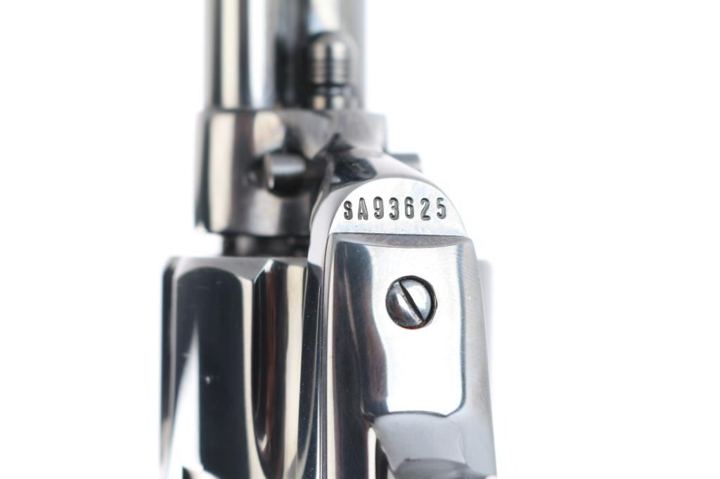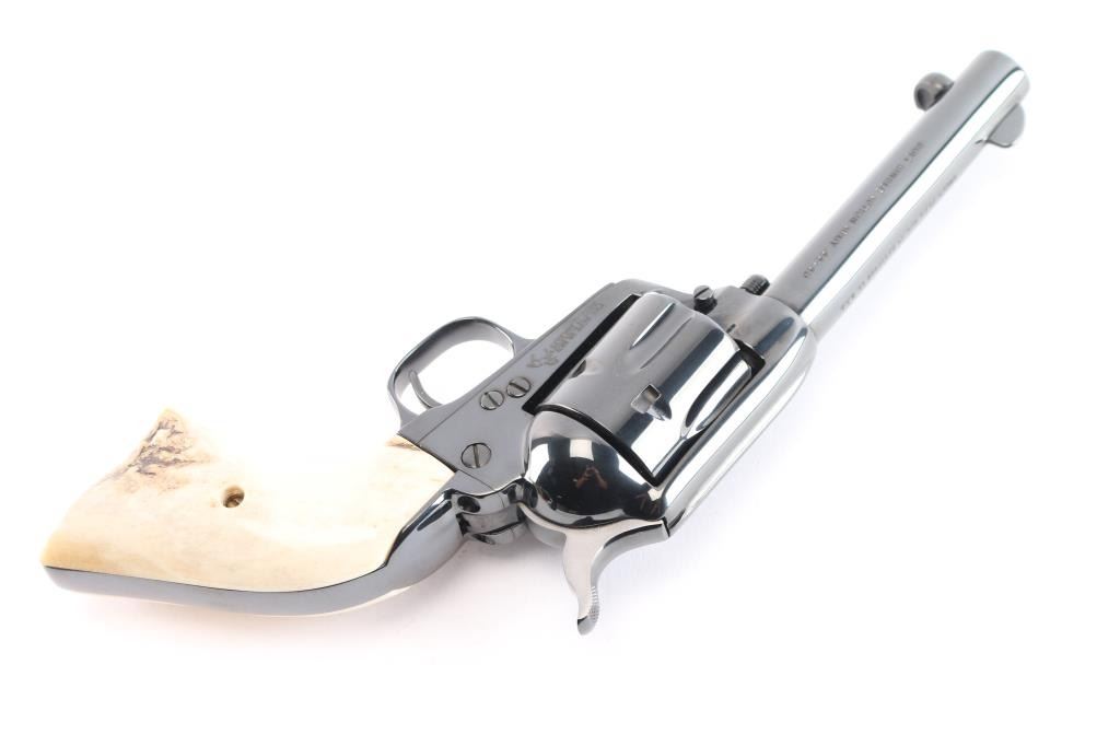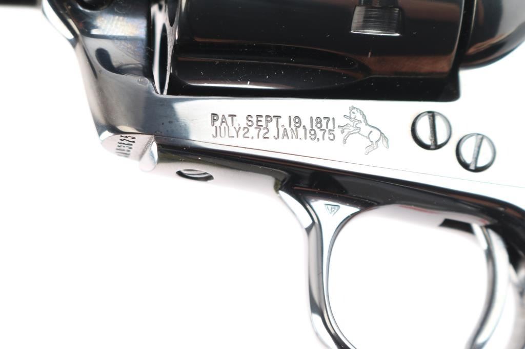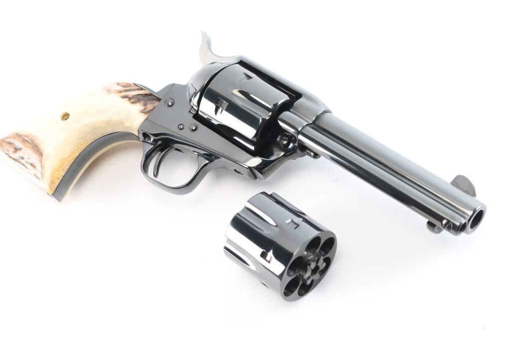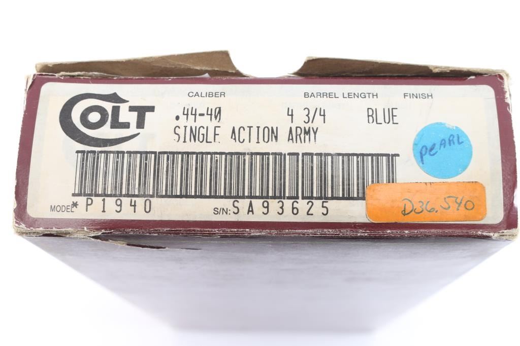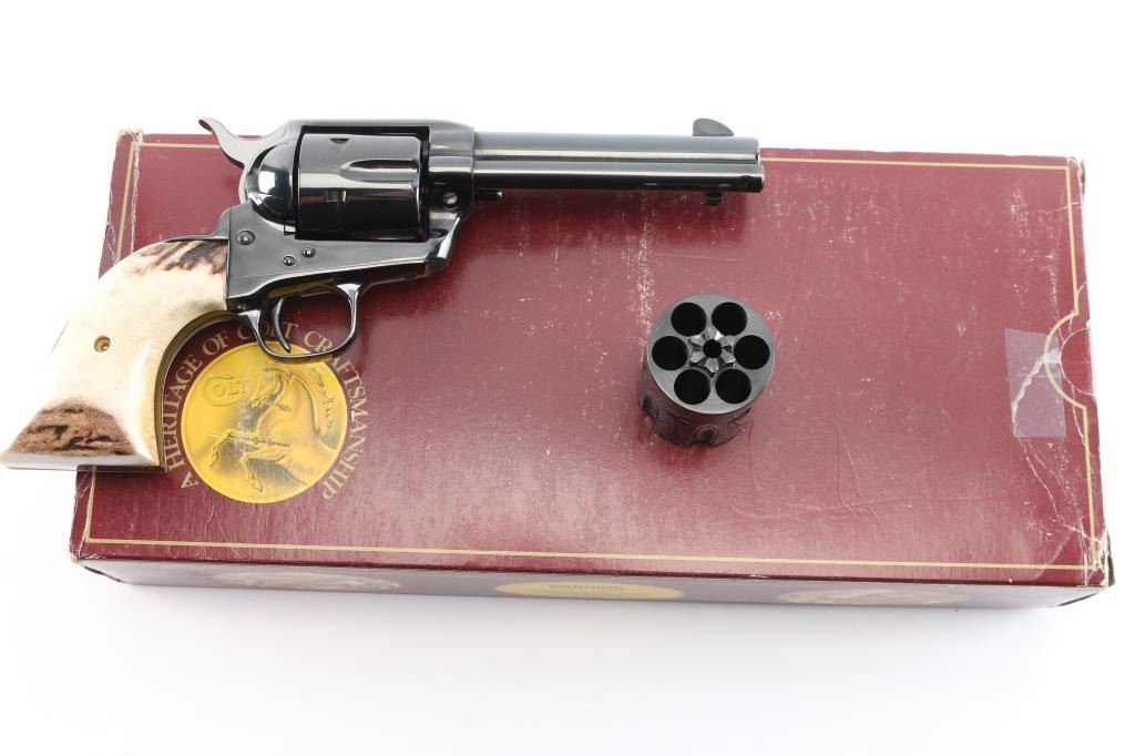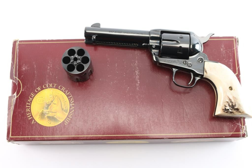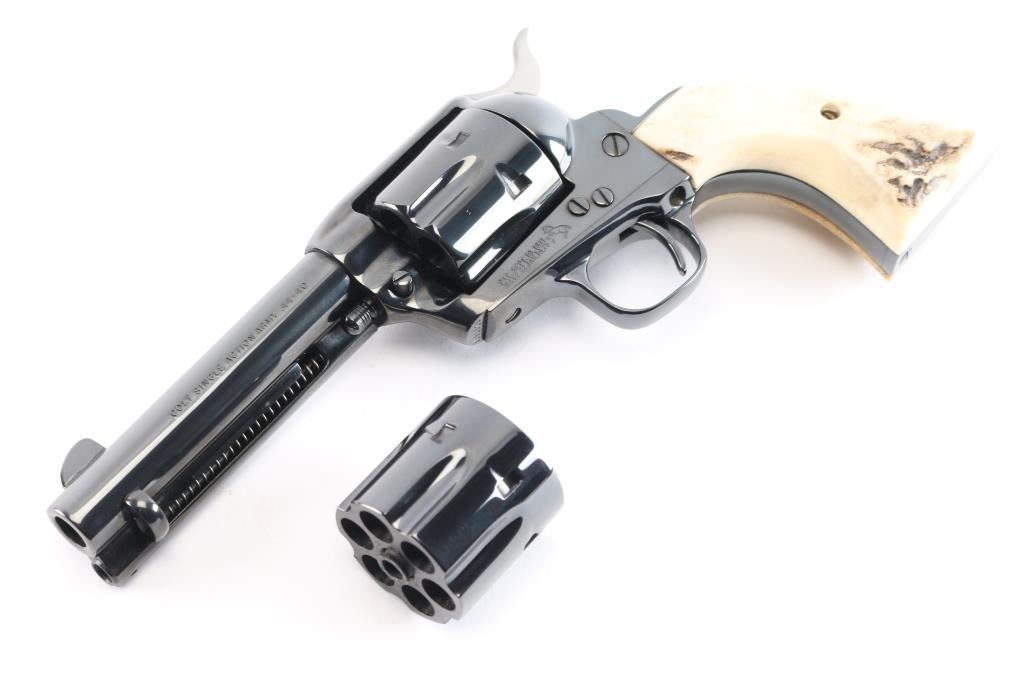 American made, Colt 3rd Generation Single-Action Army revolver chambered for .44-40 Winchester, manufactured circa 1990 in Hartford, CT. The .44 Special cylinder is installed with the .44-40 Win. cylinder in the box. Revolver features a high gloss blued finish, a 4-3/4" round barrel, blade front sight, notched frame rear sight, fluted six-round cylinder, collard cylinder pin head, thin smooth curved trigger, bird's head style ejector rod button, two-toned hammer with polished sides, firing pin on hammer nose, checkered hammer spur, smooth grip straps, and replacement two-piece stag grips. Barrel stamped "COLT'S PT.F.A. MFG. CO HARTFORD CT. U.S.A." in one line on the top of the barrel, and the left side is stamped "Colt Single Action Army 44-40". Two-line black powder patent dates are marked on the left side of the frame. The frame markings and serial numbers are sharp and legible. The original high gloss blued finish retained is approximately 99% with nothing remarkable. Metal displays no rust or deformation. Bore is bright with strong rifling, and the cylinder chambers are also excellent. Action is smooth and crisp with a tight lock-up. The stag grips are excellent. Revolver includes original factory cardboard box, paperwork, and extra .44-40 Win. cylinder.