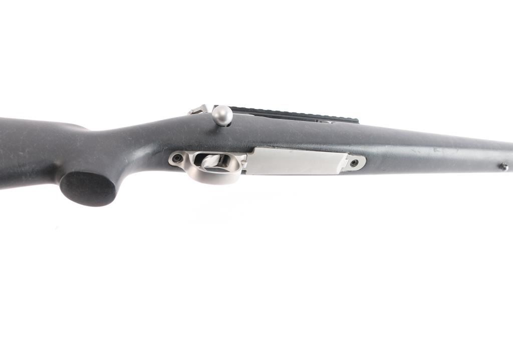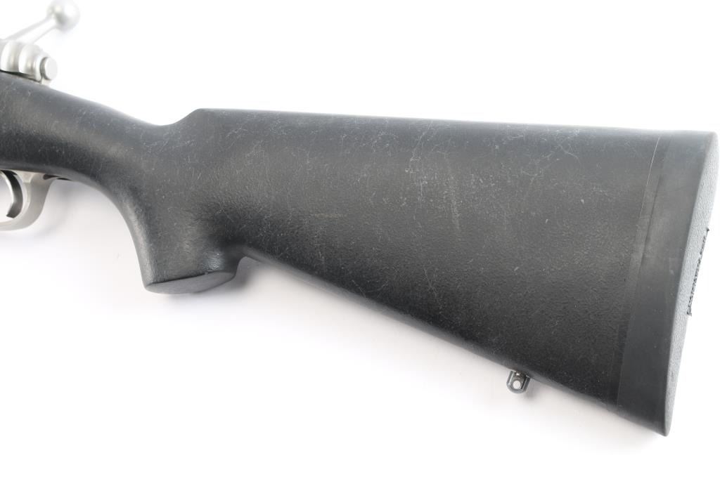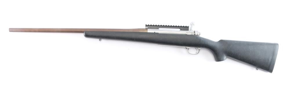 American made bolt action center fire rifle chambered for .300 Remington Ultra Magnum. Based on a pre-64 Model 70 action, this is an innovative controlled feed design that allows the shooter to push-feed, or single-load a round if desired. Rifle features a 23" bronze tapered barrel with a recessed crown, no provisions for iron sights, receiver mounted picatinney rail, smooth curved trigger, left receiver mounted serrated bolt release, turned down bolt handle, serrated swing type bolt mounted three position manual safety, and fixed magazine with a hinged floorplate. The black composite furniture consists of a smooth semi-pistol gripped shoulder stock, smooth forend, sling studs in the shoulder stock and forend, and a H-S Precision black solid rubber recoil pad with a black spacer. The receiver is a billet satin finished 416 stainless steel unit, and the rifle may have been built by Gre'-Tan. The original bronze metal finish retained is approximately 98% with light blemishes and scratches. The stainless receiver finish is also excellent with 98% of the finish remaining and only light scratches. The metal displays no rust, or metal deformation. Bore is bright with strong rifling, and the composite furniture is in excellent condition with minimal edge wear on the grip, residue on the forend, and a couple small scratches. The action is smooth and crisp.