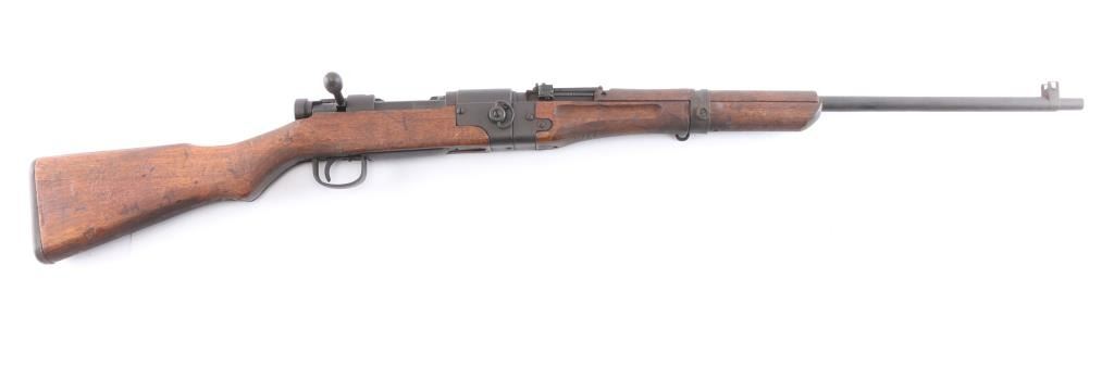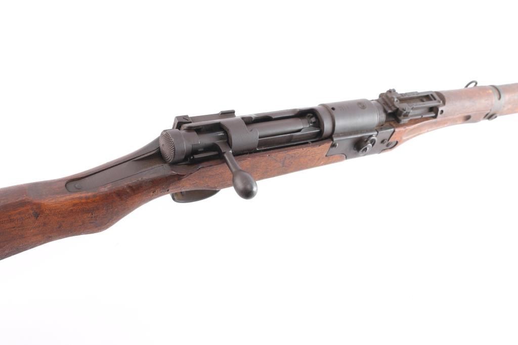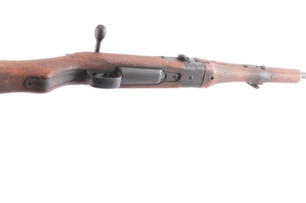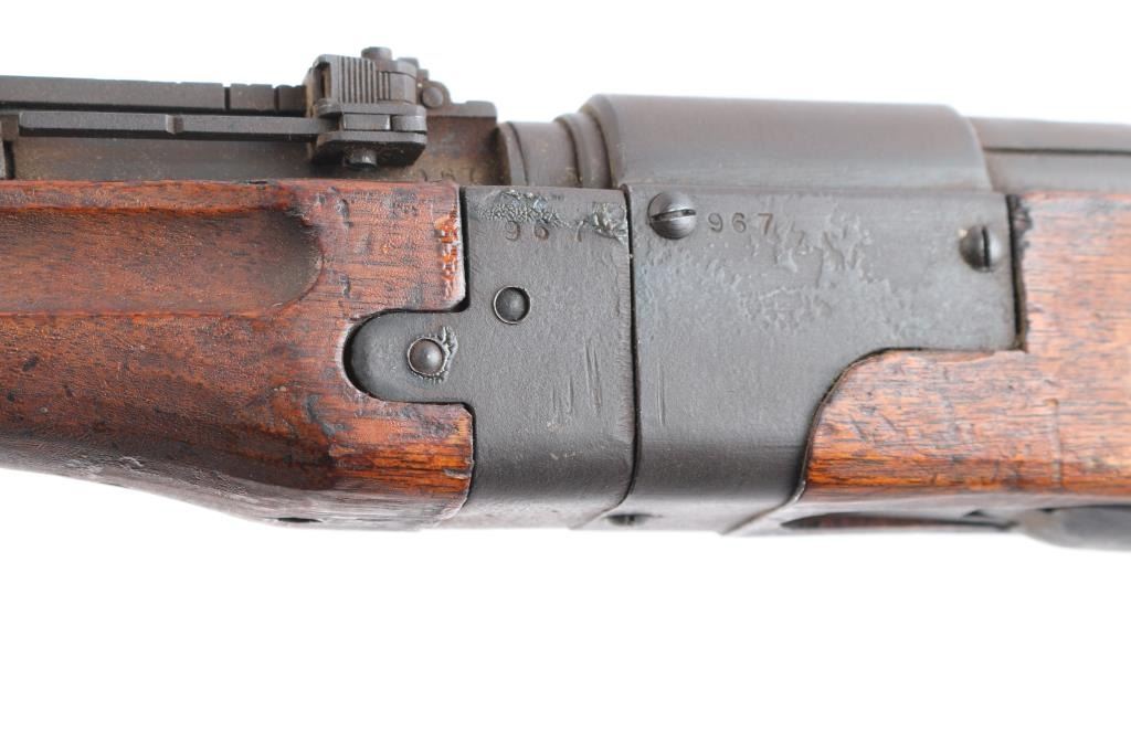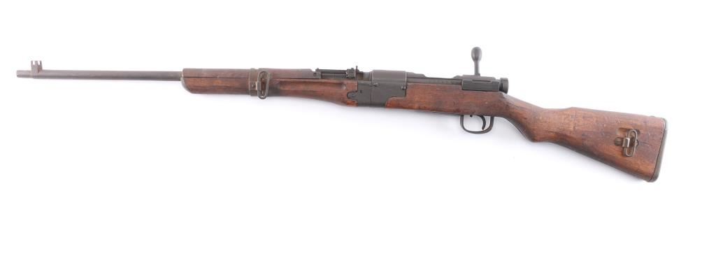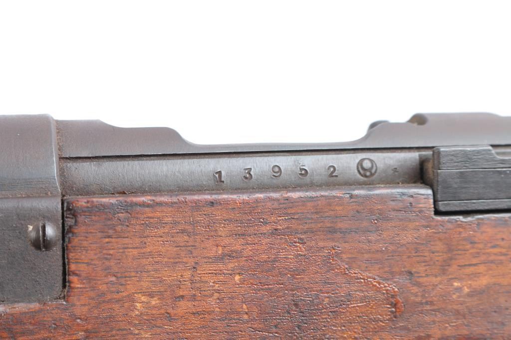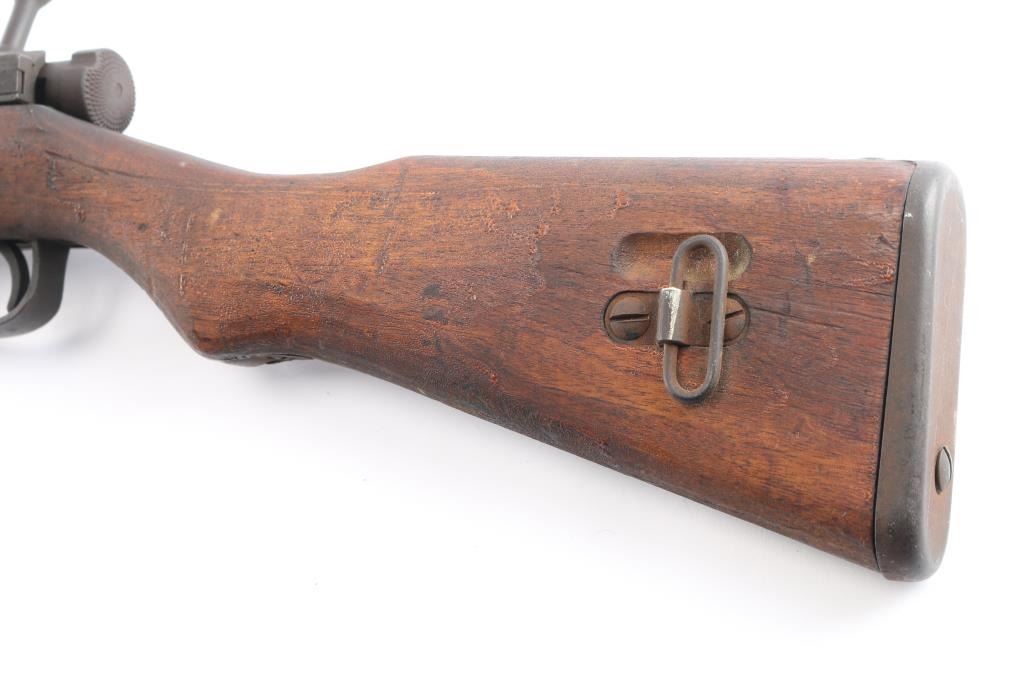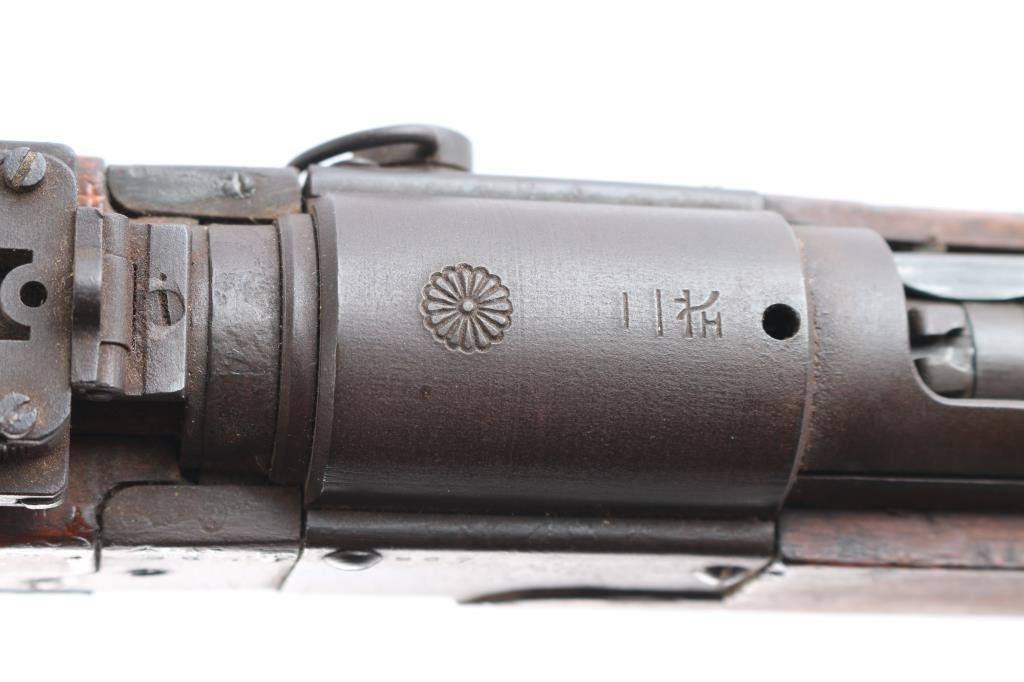 Rare Japanese military take-down rifle, estimated production of about 19,000. It features a 25.5" barrel, inverted 'V' front sight with protector ears, aperture rear sight with flip-up elevator ladder & anti-aircraft wings, no cleaning rod, side mounted sling swivels, smooth curved trigger, straight bolt handle, manual safety, hinged floorplate, and takedown screw on right side of action. Bore is dark with strong rifling. The original blued finish has turned brown. The metal condition is good other than the brown patina, the edges are sharp, no heavy wear areas, screw slots are good, and the receiver ring still maintains the chrysanthemum. Wood is in good condition with original finish, cut down forend, normal handling wear, but there is a residue on the buttstock. Butt join is excellent with barely visible line. Markings are crisp & deep. Assembly number "967" is visible on several parts. Matching bolt numbered "952" on the bolt handle, firing pin, safety knob, and extractor.