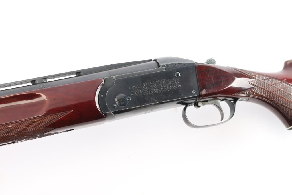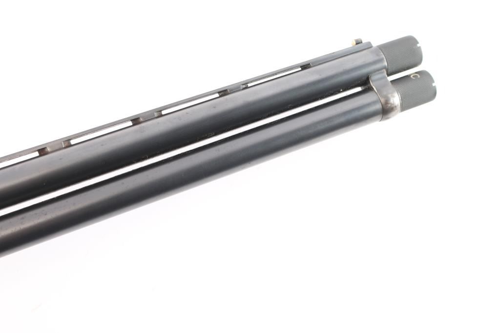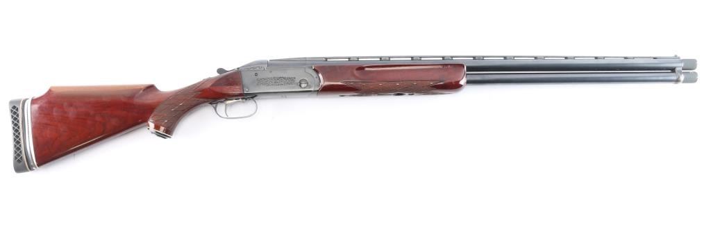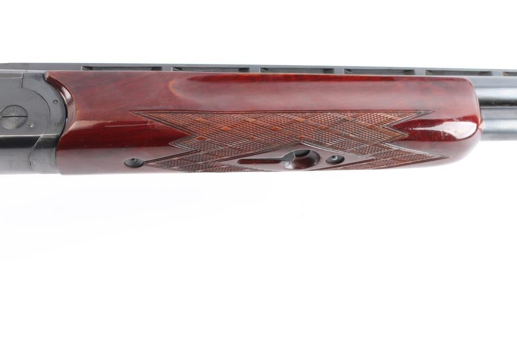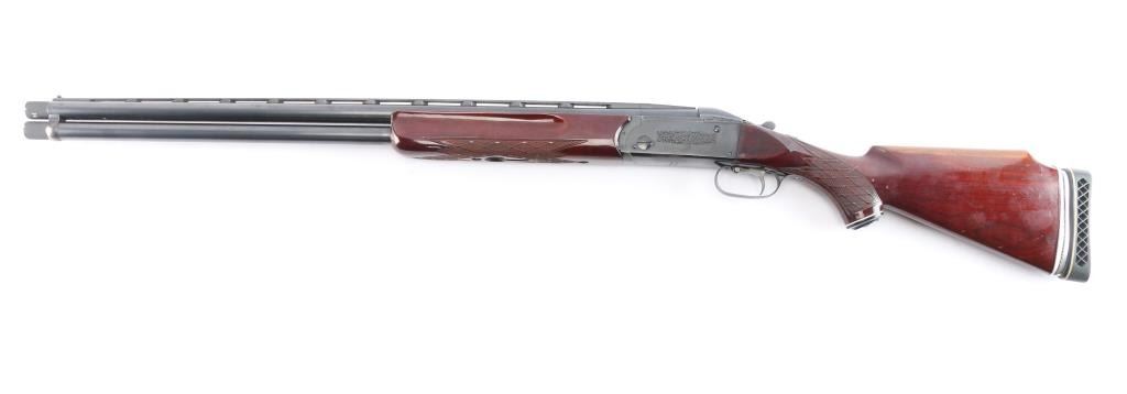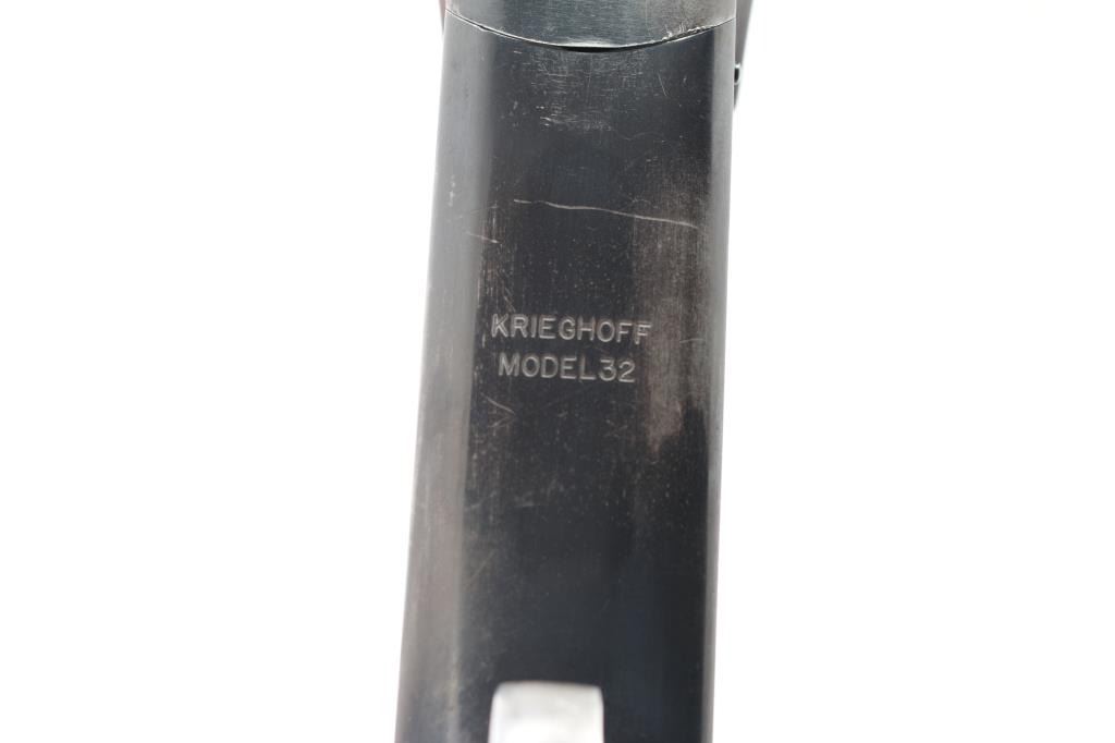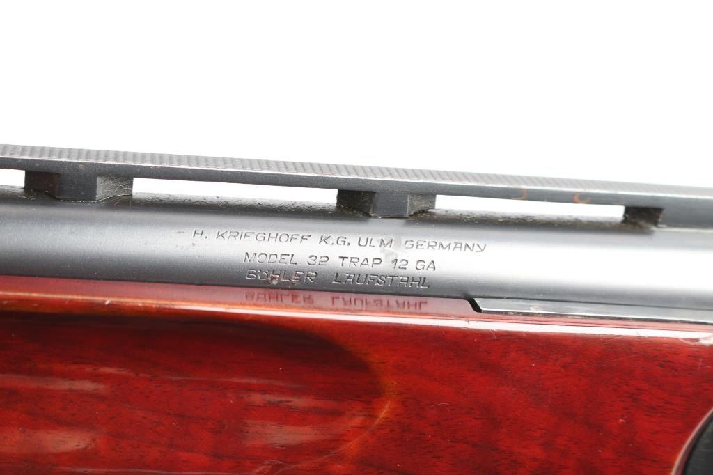 Quality German made O/U trap shotgun, manufactured September, 1959 dated on barrel lug, all matching serial numbers. The barrels are marked "H. KRIEGHOFF OHG. ULM GERMANY MODEL 32 TRAP 12 GA. BOHLER-LAUFSTAHL". The frame is decorated with an un-bordered panel of deep relief floral scroll engraving on the right & left sides. 28" vent rib barrels with white sighting bead, and small steel mid bead, single selective trigger, high polish blue finish, high gloss semi-beaver tail, checkered forearm, pistol grip butt stock with checkered panels on wrist, high comb black grip cap and adjustable vented black Pachmayr recoil pad. The sliding tang safety is frozen, we could not engage it. Bores are excellent/bright, the wood is overall excellent with some very minor scratches, blue is about 90%, dulled somewhat with minor scratches, edge/handling wear. Installed barrel chokes are 'M' over 'IC', LOP is 14 1/2".