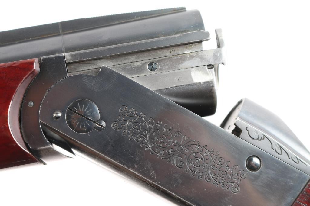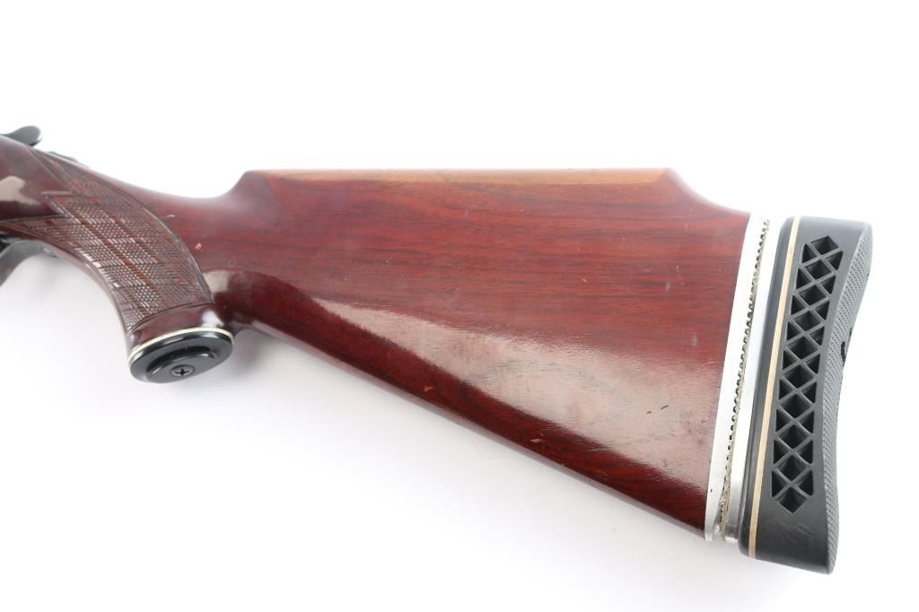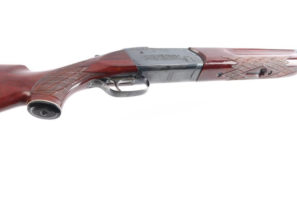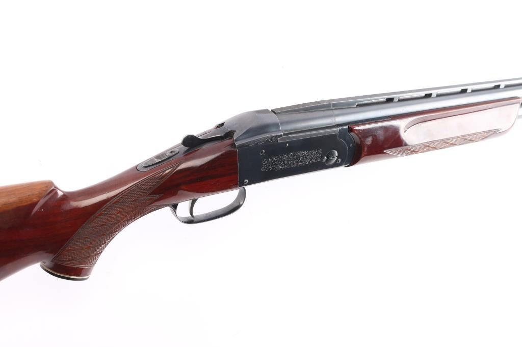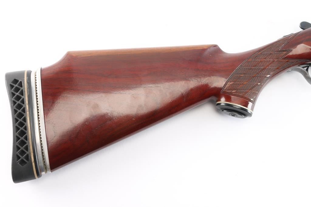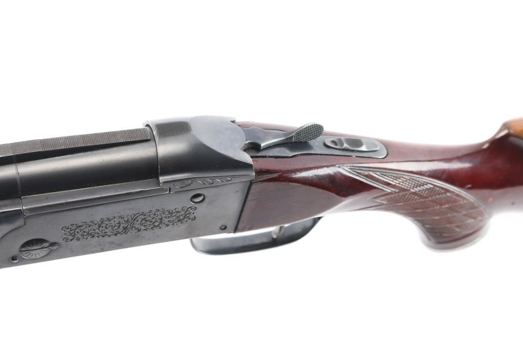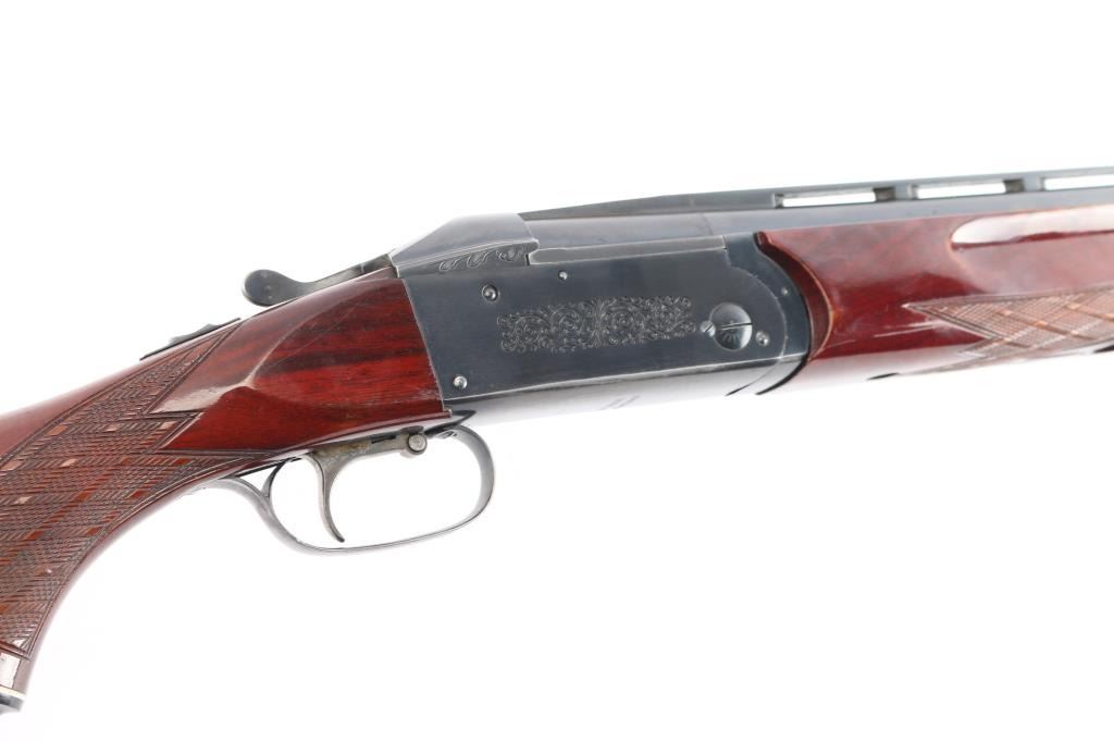 Quality German made O/U trap shotgun, manufactured September, 1959 dated on barrel lug, all matching serial numbers. The barrels are marked "H. KRIEGHOFF OHG. ULM GERMANY MODEL 32 TRAP 12 GA. BOHLER-LAUFSTAHL". The frame is decorated with an un-bordered panel of deep relief floral scroll engraving on the right & left sides. 28" vent rib barrels with white sighting bead, and small steel mid bead, single selective trigger, high polish blue finish, high gloss semi-beaver tail, checkered forearm, pistol grip butt stock with checkered panels on wrist, high comb black grip cap and adjustable vented black Pachmayr recoil pad. The sliding tang safety is frozen, we could not engage it. Bores are excellent/bright, the wood is overall excellent with some very minor scratches, blue is about 90%, dulled somewhat with minor scratches, edge/handling wear. Installed barrel chokes are 'M' over 'IC', LOP is 14 1/2".