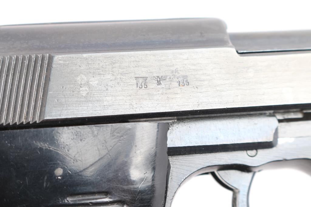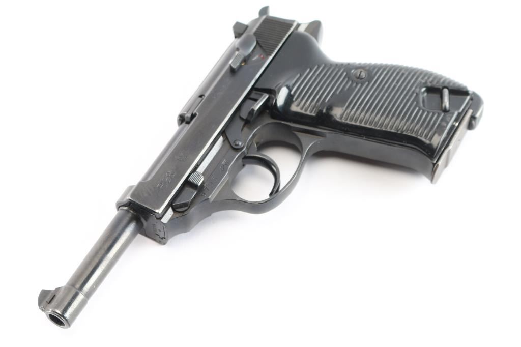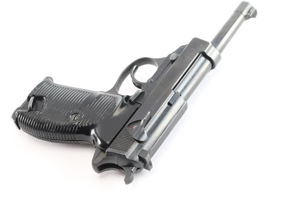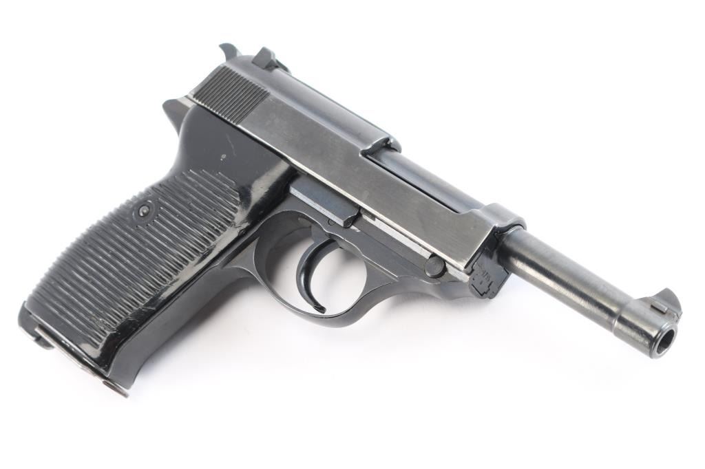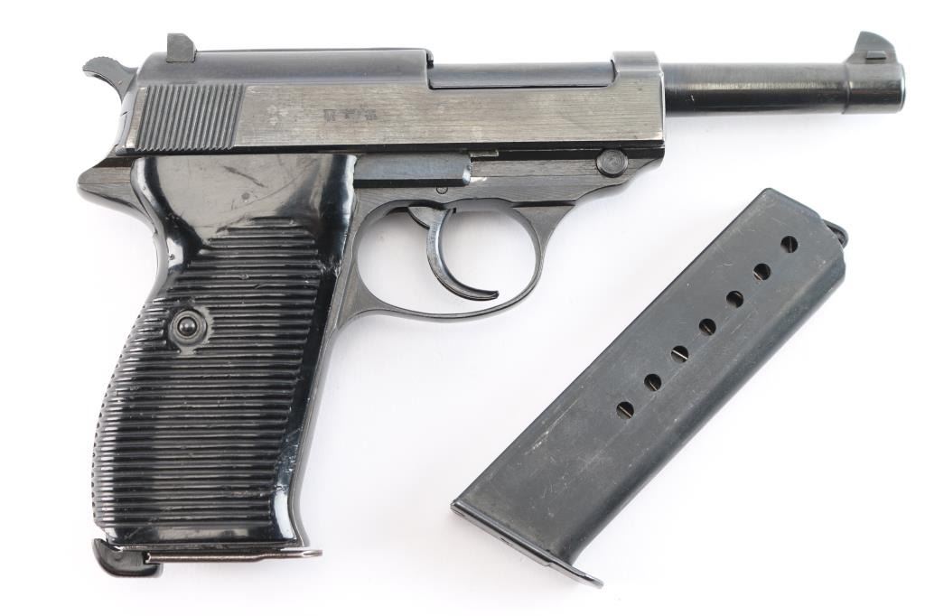German made DA/SA semi-automatic short recoil operated pistol chambered for 9x19mm ammunition, manufactured circa 1943. Third-Reich era military issued sidearm features a re-blued finish, a 4.9" tapered barrel, dovetailed fixed blade front sight, dovetailed notched rear sight, hinged locking piece assisted breechblock, smooth curved trigger, external hammer with a serrated spur, slide mounted serrated safety/decocker, smooth front strap, serrated heel magazine release, serrated take-down lever, serrated slide stop, dual recoil springs (separate), and two-piece serrated black plastic grips with a lanyard ring on the left grip panel. Matching serial numbers on the locking block, slide, barrel, and frame. Waffenamts Eagle/359 are marked on the frame and slide. Slide marked 'BYF 43' which is a German ordnance code assigned to Mauser-Werke, Oberndorf am Neckar, Germany, circa 1943. The re-blued finish retained is approximately 96% with some superficial scratches, and edge wear. Metal exterior displays no rust or deformation. Bore is pitted, but shiny with strong rifling. Plastic grips are very good with some light scattered scratches, and some rubbery residue in the grooves in the left grip panel. The action is smooth and crisp. All stampings are clear and sharp. Pistol includes includes two magazines total.