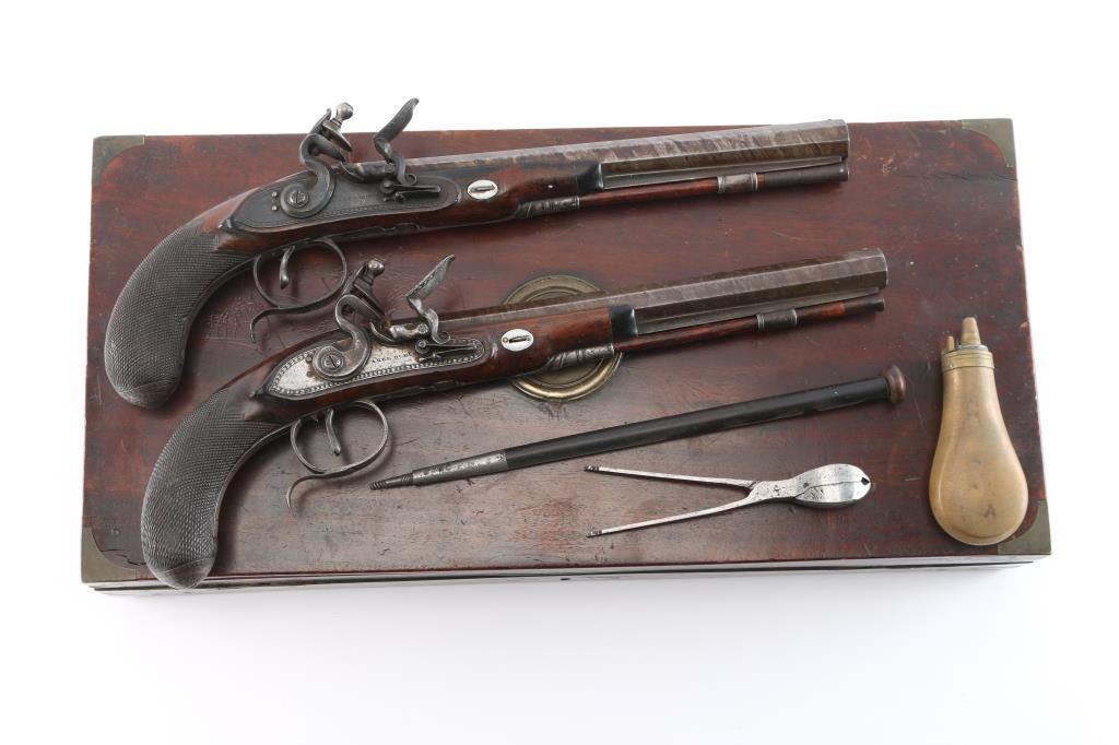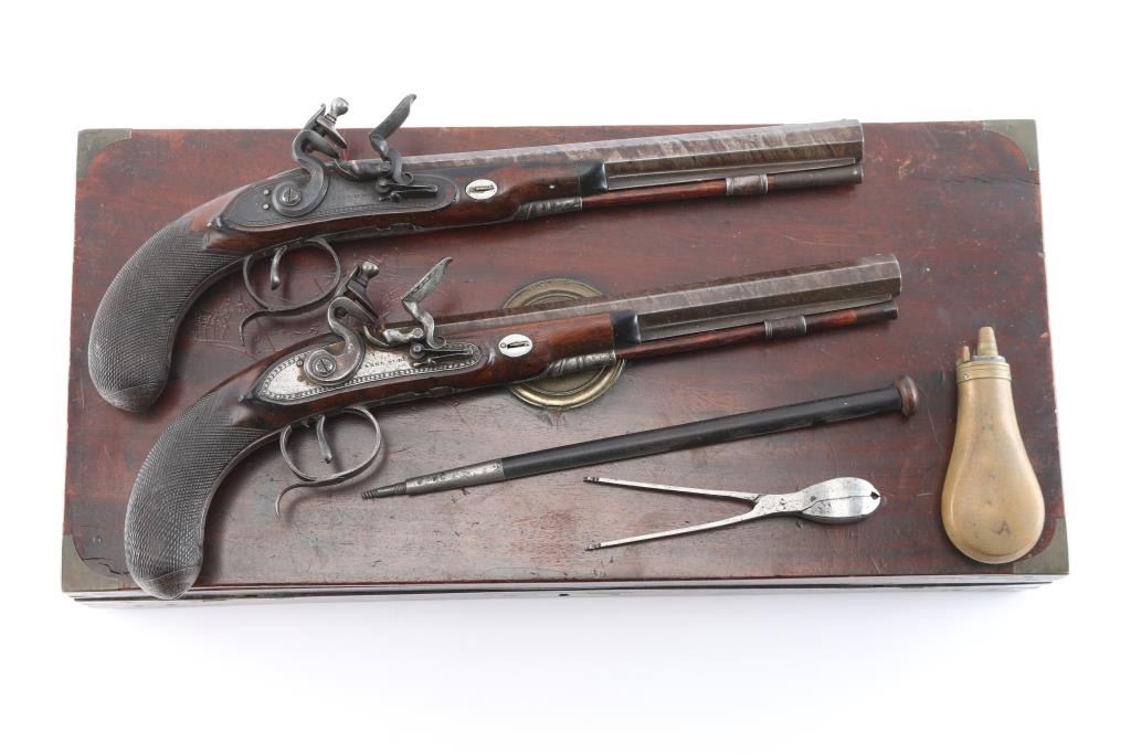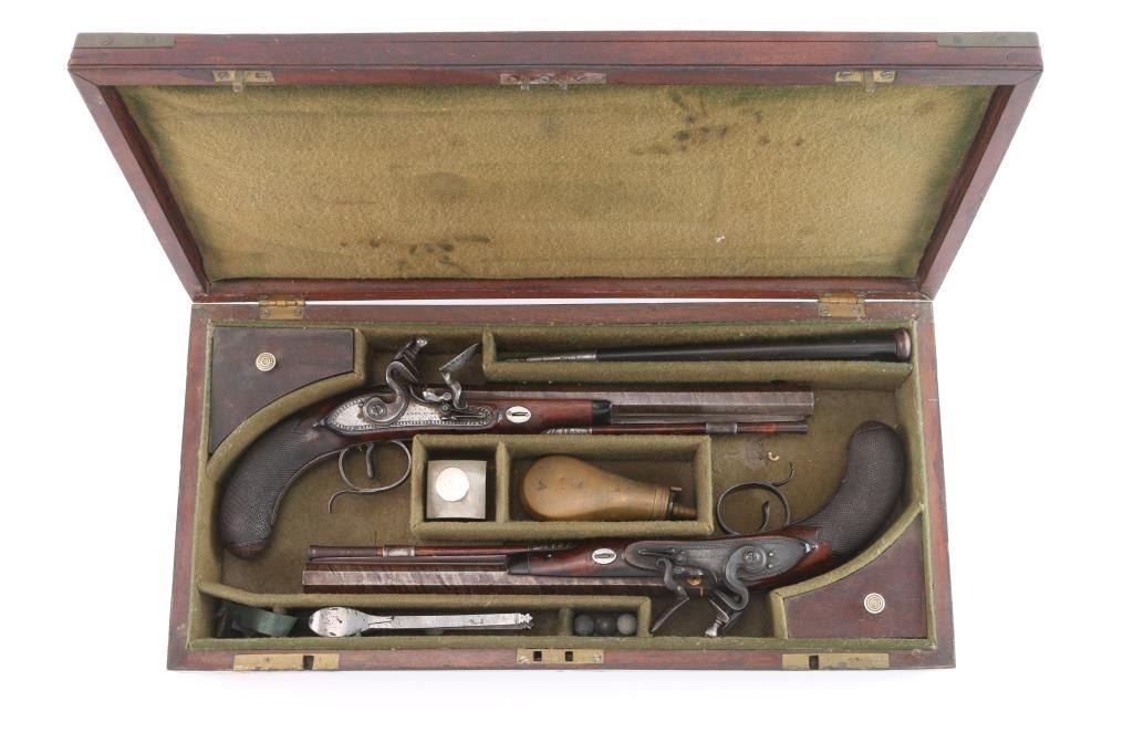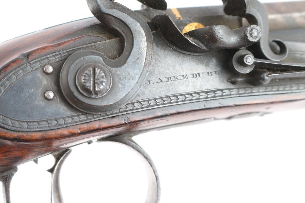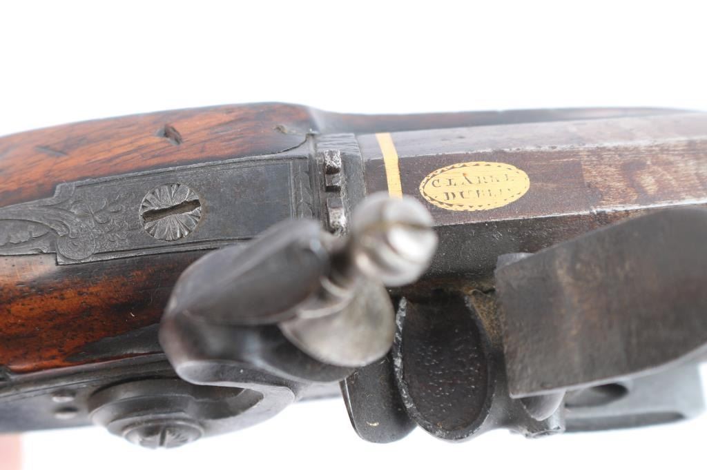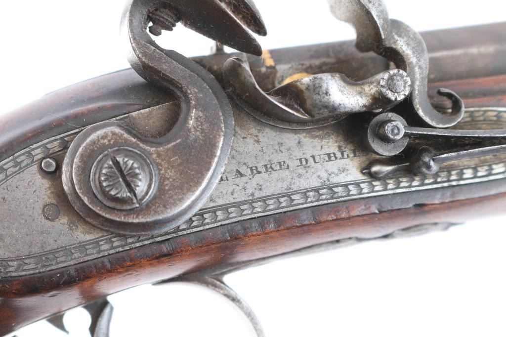 By Clarke of Dublin, Ireland. Circa about 1810-1830 with signed locks and gold inlaid makers cartouche on the bbl along with thick gold band at the breach. 15 1/2" overall with 10 1/2 medium weight octagon bbls of approximately 52-54 cal smooth bore. Nicely checkered walnut 1/2 stocks, engraved iron mounts. The bbl's show 50-60% original brown with false damascus stripping. The pair retain all correct parts and are original Flintlock configuration. The locks work well and actions are crisp. The pair remain in good to very good condition with sound stocks and patina on the metal. The original case shows brass mounts iwth carry ring and quality hardware. Stamp R. L. P. in block letters at top right edge. The exterior is good with normal age and imperfections of 200 yrs. The interior is green felt or baize in English partition style. A flask, mold, visor rod with worm included. The interior is good with loss and wear at resting points. A good pair of Flintlock dueling pistols by a scarce Irish maker that we would rate above average in condition. Very desirable.