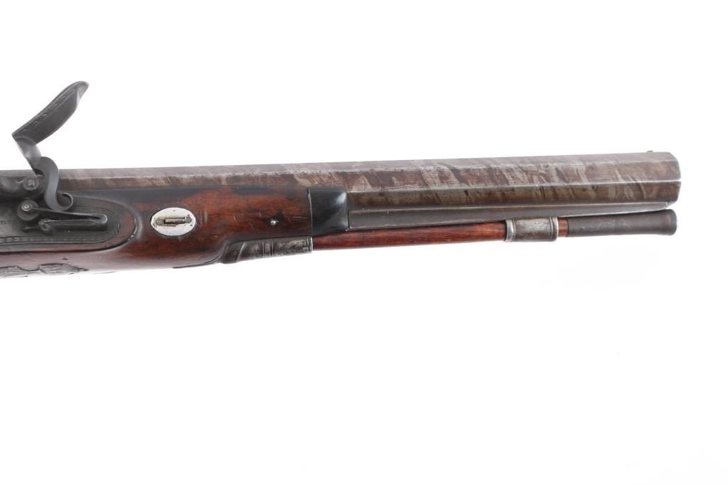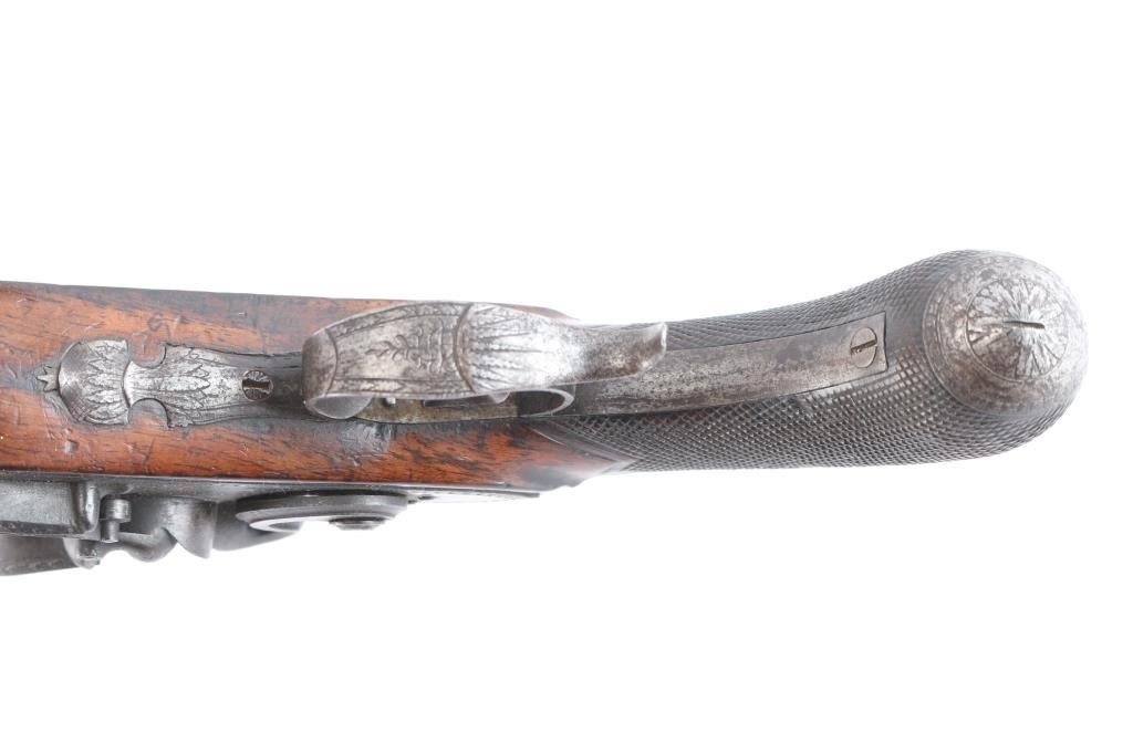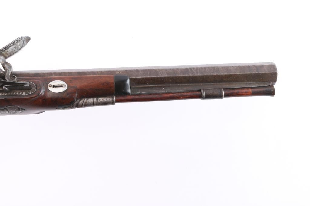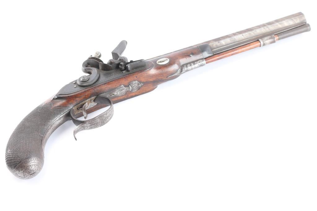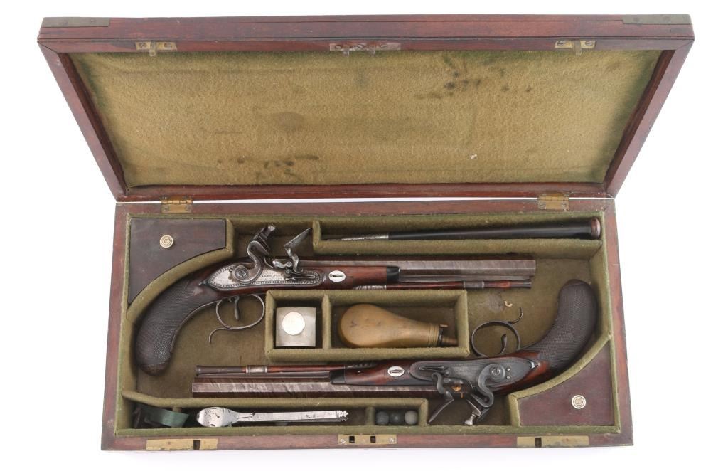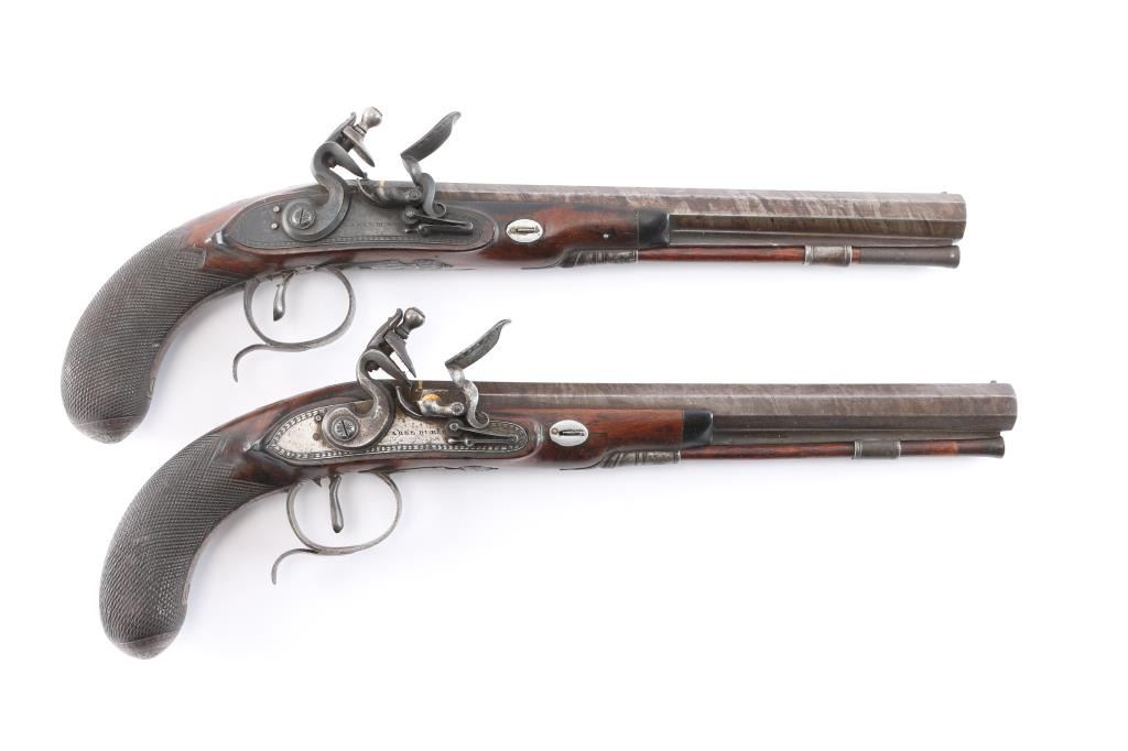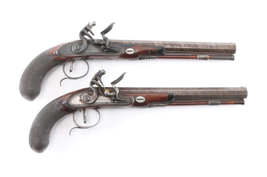 By Clarke of Dublin, Ireland. Circa about 1810-1830 with signed locks and gold inlaid makers cartouche on the bbl along with thick gold band at the breach. 15 1/2" overall with 10 1/2 medium weight octagon bbls of approximately 52-54 cal smooth bore. Nicely checkered walnut 1/2 stocks, engraved iron mounts. The bbl's show 50-60% original brown with false damascus stripping. The pair retain all correct parts and are original Flintlock configuration. The locks work well and actions are crisp. The pair remain in good to very good condition with sound stocks and patina on the metal. The original case shows brass mounts iwth carry ring and quality hardware. Stamp R. L. P. in block letters at top right edge. The exterior is good with normal age and imperfections of 200 yrs. The interior is green felt or baize in English partition style. A flask, mold, visor rod with worm included. The interior is good with loss and wear at resting points. A good pair of Flintlock dueling pistols by a scarce Irish maker that we would rate above average in condition. Very desirable.