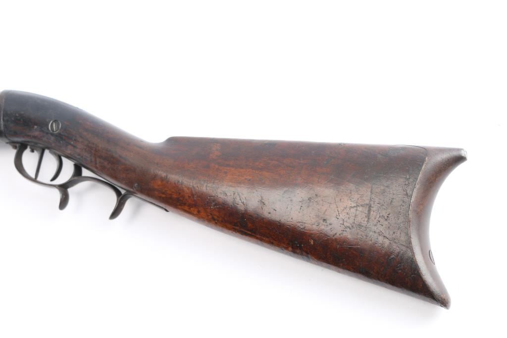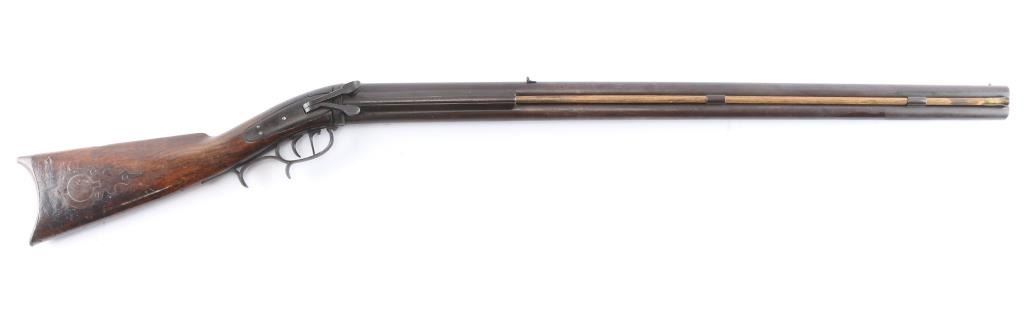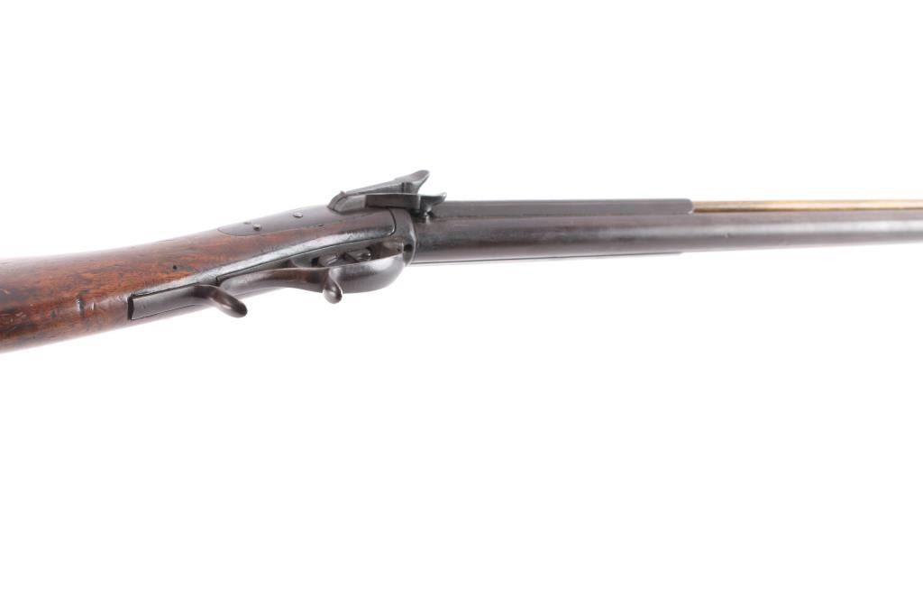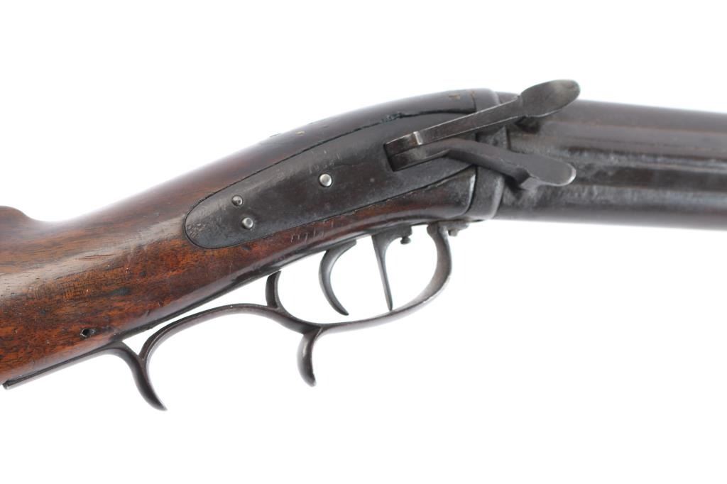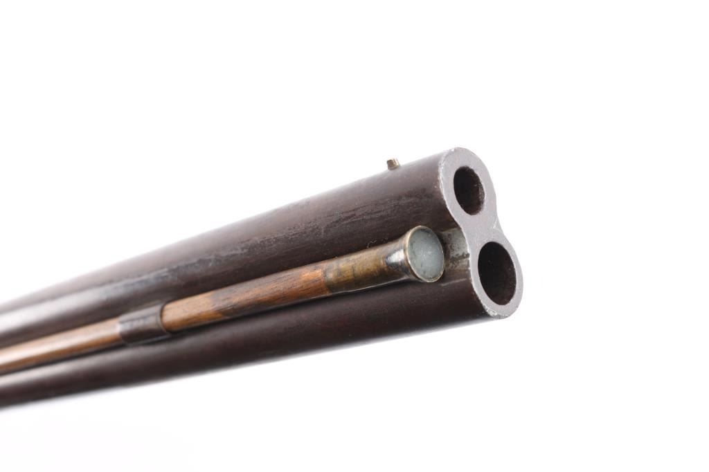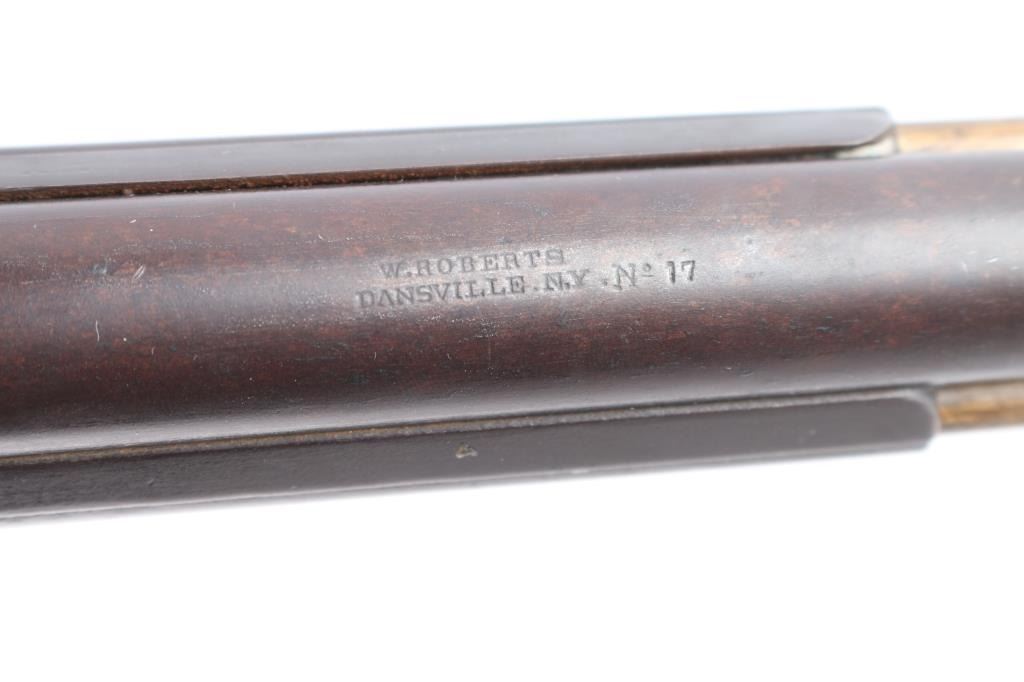 SN: 17. New York Percussion Mule Ear Over Under Buck and Ball Gun by W. Roberts. Antique percussion combination rifle/shotgun made circa 1856. This is a very interesting American design that originated in the 1820s and continued through the mid-1800s. This is a percussion rifle and shotgun combination that is fired by the two independent percussion hammers on the right side of the firearm with vertical, side-slap actions. These were very popular in the northeast and upper New York. Both the barrel & lock plate are marked "W. Roberts Dansville NY" with the serial number "17". ( The lock plate stamp is very feint). The lock plate is dated "1856". William Roberts manufactured distinctive "mule ear" side-hammer percussion firearms, typically as over/under rifles or rifle/shotgun combinations during the mid-19th century (approx. 1849–1866). 30" over/under barrel with .40 cal rifle barrel on top and .28 gauge shotgun barrel on the bottom, brass sighting bead and fixed U-notch rear sight, double set triggers,nice finger rest triggerguard, patch box inletted on right shoulder stock and crescent steel buttplate. There are two brass tipped wood ramrods for the different sized bores, the top bore is rifled and the shotgun barrel is smooth bore. The metal, including the patch box has turned a brown patina with age, the locks function well, the upper tang is missing the top screw. the wood stock is very good/sound with no chips or cracks. This firearm is pictured on pages 1396 and 1397 of The New York State Firearms Trade Vol. 3 by Swinney & Rowe. William Roberts was active from about 1849 to perhaps 1866. A very attractive and distinctive buck and ball gun.