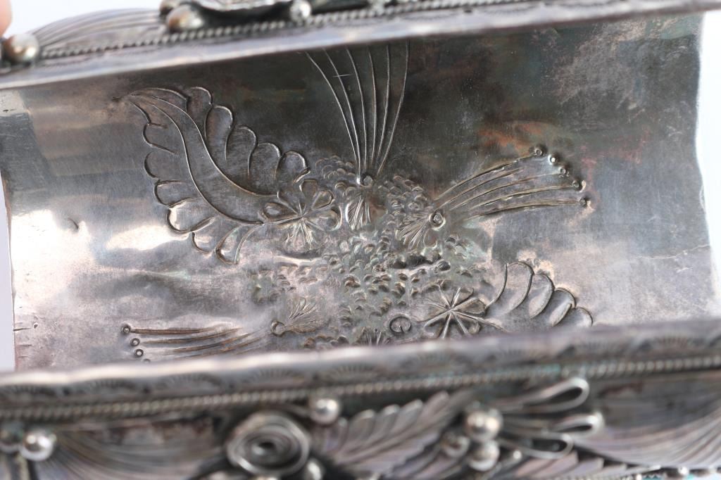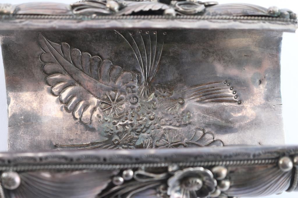 16 turquoise stones mounted in heavy sterling silver, maker marked GR with fancy stamp motif inside. Includes watch in need of battery. Measures 10.5" at widest to 9.5" at narrowest including gaps.