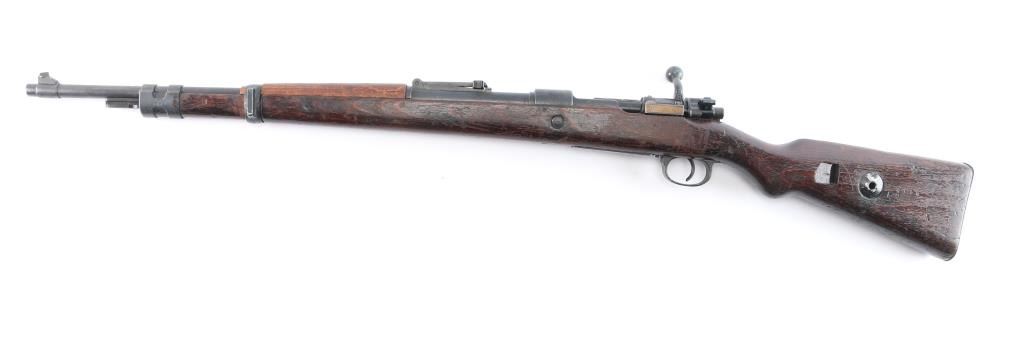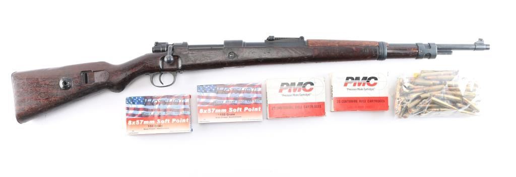 German WWII era military bolt action rifle, '237' coded, dated 1939, imported by TG, Knoxsville, TN. Features 24" barrel, blade front sight, tangent rear sight, bayonet lug, bent bolt handle, manual safety, wood stock with steel buttplate & bolt disassembly lug in butt, sling slots. Bore is fair to good condition, a bit dark & lightly pitted with strong rifling. Metal is blue finished, some fading or discoloration on various parts. Stock is very good condition with dents & small gouges, has a heavy coat of varnish. The serial number is matched on the barrel, receiver and stock, the rest mismatched. Has the usual waffenamts and eagle/swastika proofs. Included with this rifle is a box containing two boxes of 20 Hotshot 8mm soft point 150 grain, boxer primed rounds, three boxes of 20 PMC 8mm 170 grain PSP rounds, one box of 15 Russian military 8mm rounds, 3 stripper clips of five each, one box of 15 Russian 8mm rounds, box of 5 Remington 8mm 170 gr. soft pt, core-lokt and one bag of 74 S&B 196 grain soft point rounds-Total 209 rounds. Weight 13 lbs.