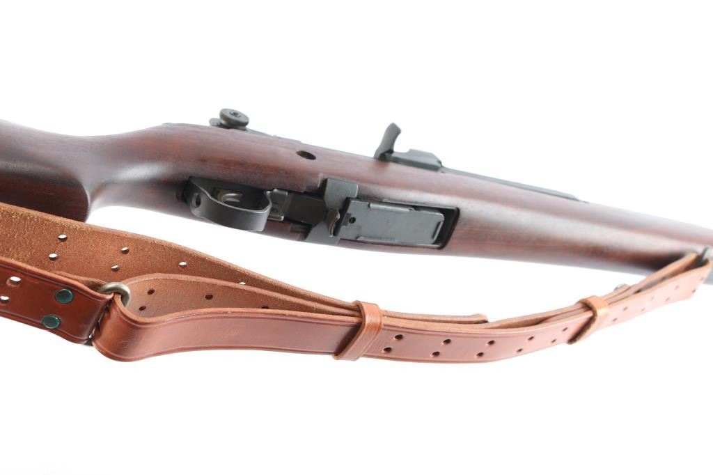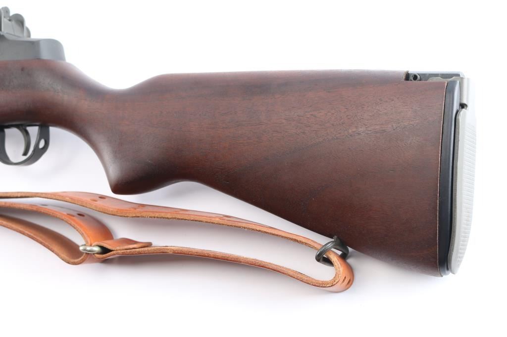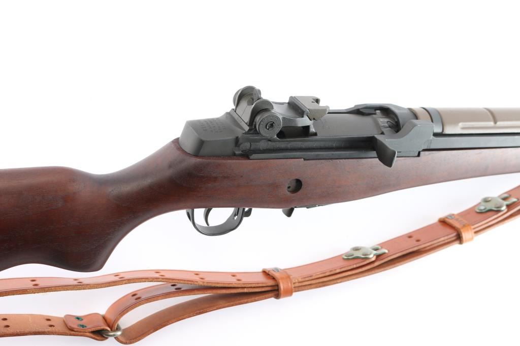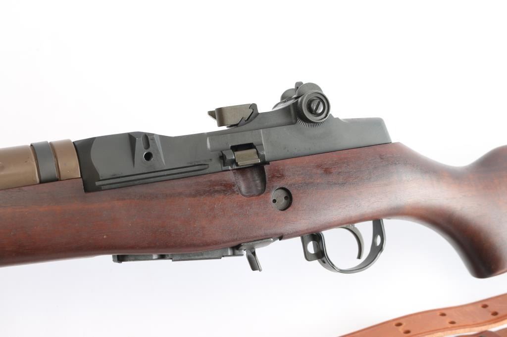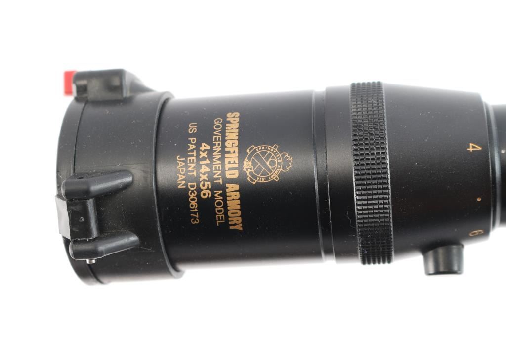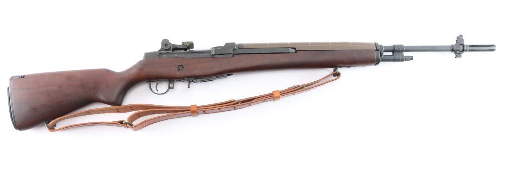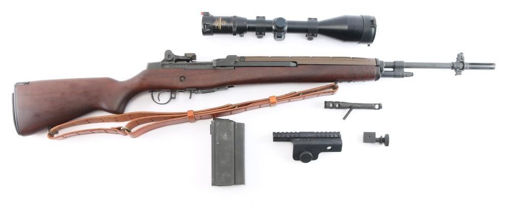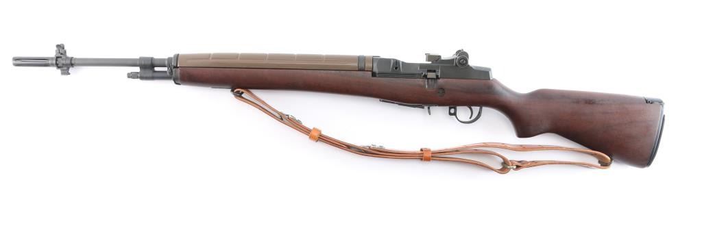 American made semiautomatic long stroke gas piston civilian version of the U.S. M-14 service rifle chambered in 7.62x51mm NATO. Manufactured by Springfield Armory out of Geneseo, IL. circa 1987. High quality rifle features a parkerized finish, 22" barrel, flash hider, protected blade front sight, adjustable rear aperture sight, stripper clip guide, manual safety in triggerguard, smooth curved trigger, SA bolt, accepts detachable magazines, paddle magazine release, bayonet lug, and receiver rail grooved, drilled and tapped for scope mounting. The walnut furniture consists of a smooth semi-pistol grip shoulder stock, brown fiberglass hand guard, smooth forend, sling swivels in forend and bottom of the buttstock, and hinged covered buttplate with trap door. The rifle retains approximately 98% of its parkerized finish with superficial scratches, some dark marks on the top of the barrel, and some edge wear. Furniture wood is excellent with little remarkable to speak of. The metal displays no rust or deformation. Action is smooth and crisp, and the bore is bright with strong rifling. Comes with a 10 round magazine, a twenty round magazine, M1A combo tool (fits inside buttstock), scope mount, brown leather 1907 sling, scope rings, and a Springfield Armory 'Government Model' 4-14x56mm scope with bullet drop and windage compensation. The sight picture is bright and clear.