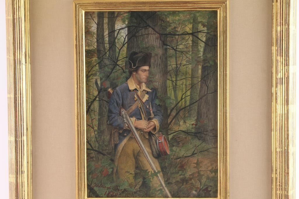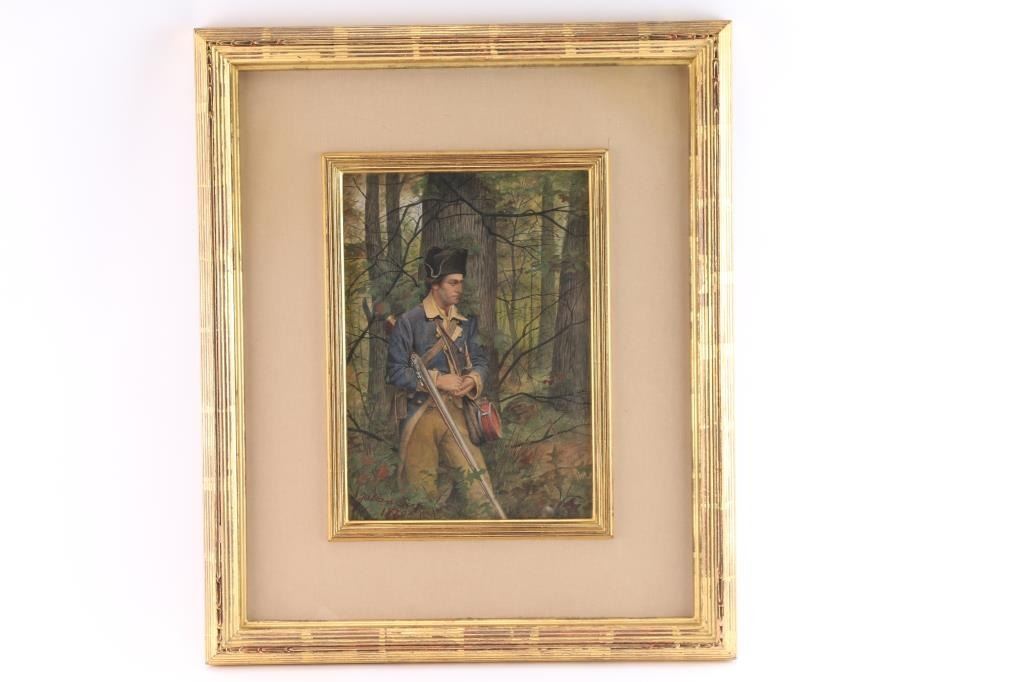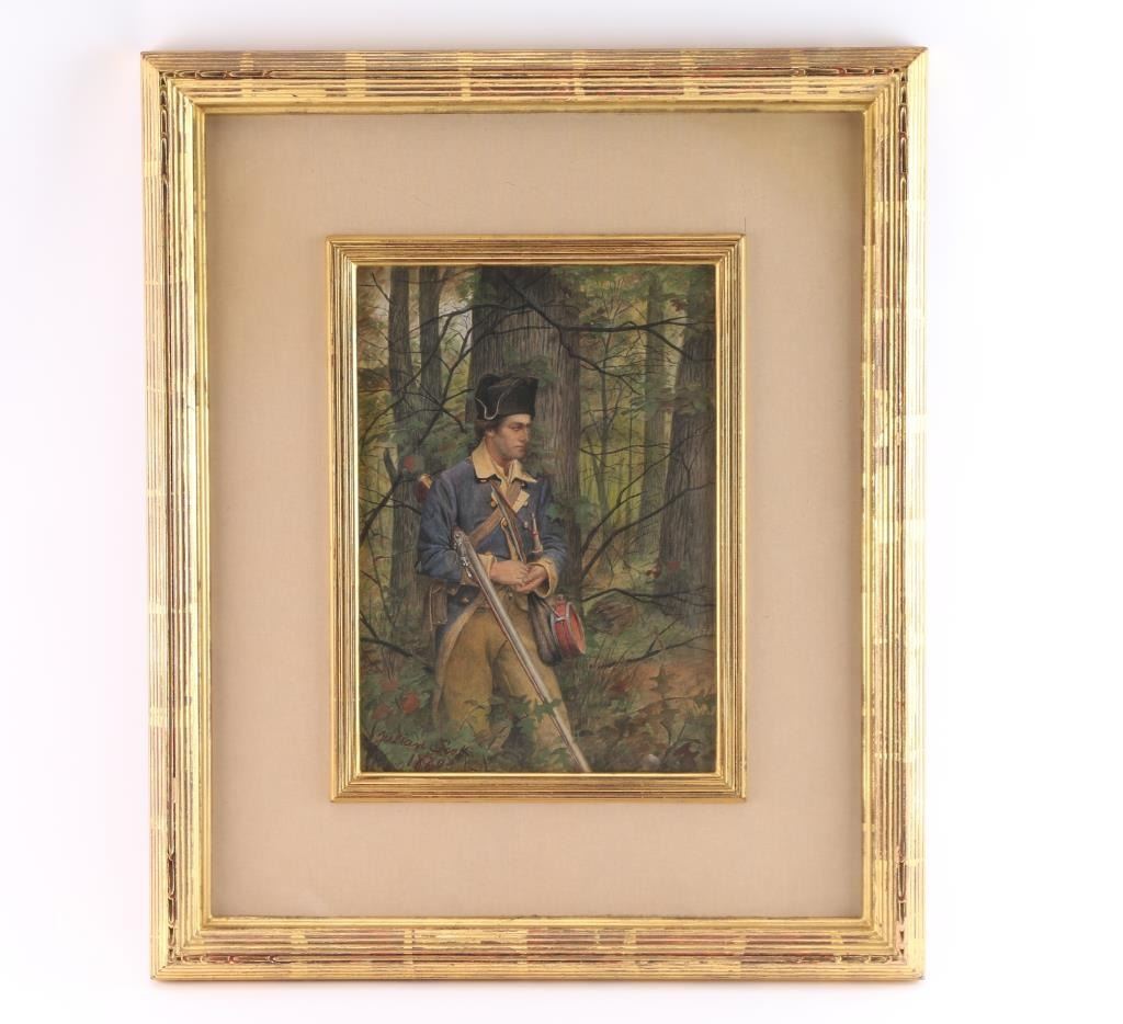Of American revolutionary war soldier, signed lower left Julian Scott. Julian Scott is a well-known American 19th Century illustrator and artist who is recognized for his military subjects and has very good auction records. Measures approximately 13 1/2" tall by 9 1/2" wide. Finely framed and matted. No significant condition issues. Provenance: Butterfield's San Francisco 1990's.