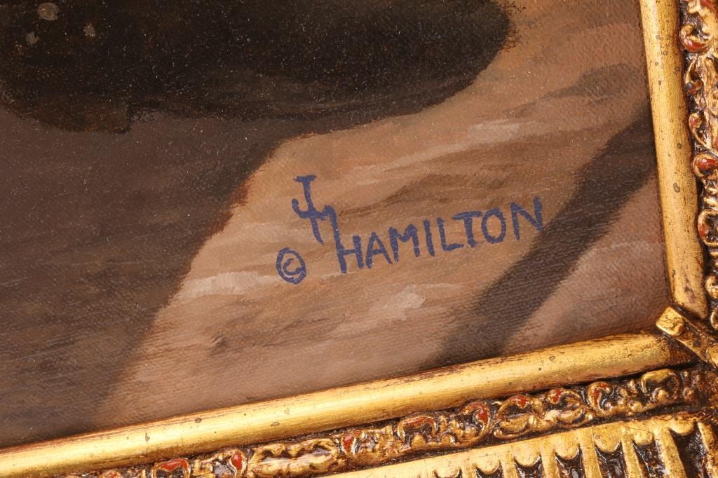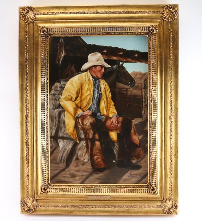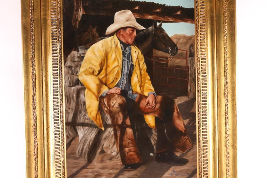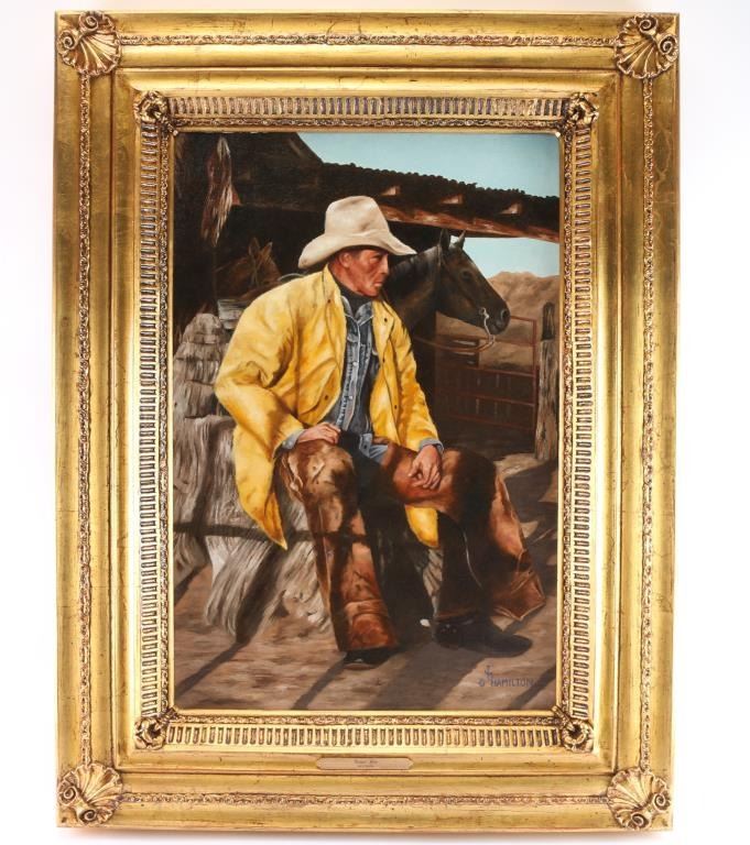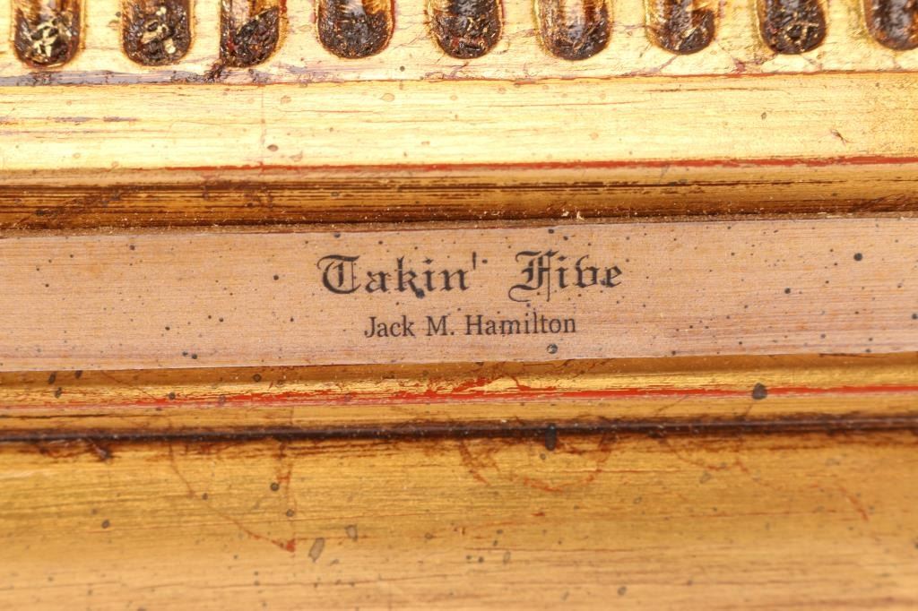 By Colorado artist, Jack M. Hamilton, titled "Takin' Five". Beautifully framed in ornate gold 6" frame. Measures 31 1/4" wide by 41" tall. Hamilton loved the outdoors, nature's wildlife and American history. He spent years watching, studying and photographing his favorite subjects, often from his working cattle ranch in southern Colorado. Painting on both canvas and panel, Hamilton worked entirely in the medium of oil. Self-taught, the artist painted in the manner of the old masters. Hamilton was exhibited at many of the country's finest galleries and at many fine art shows. His work has been featured on the cover of, as well as in, national magazines.