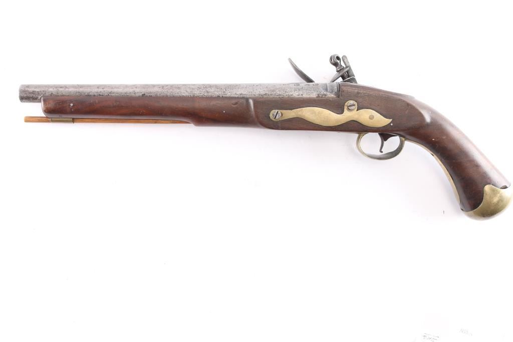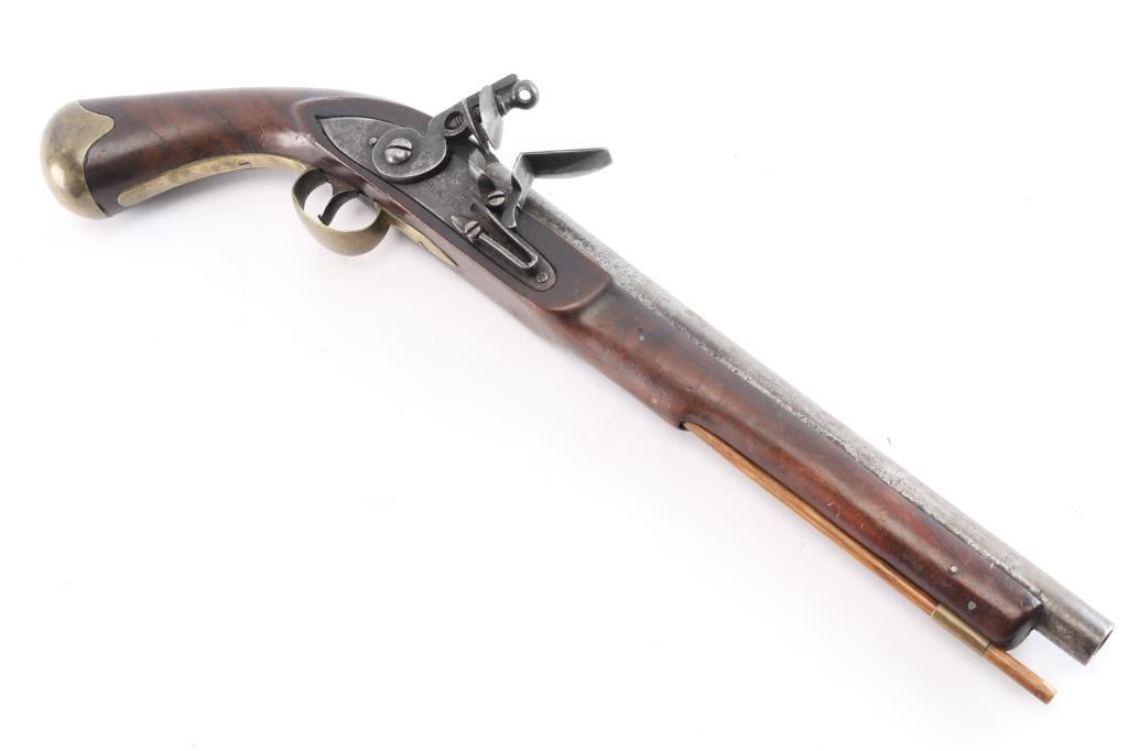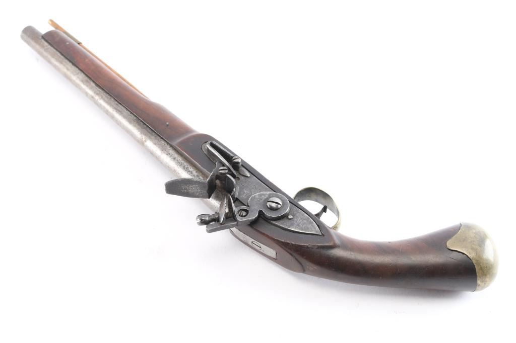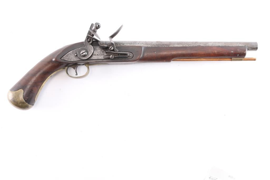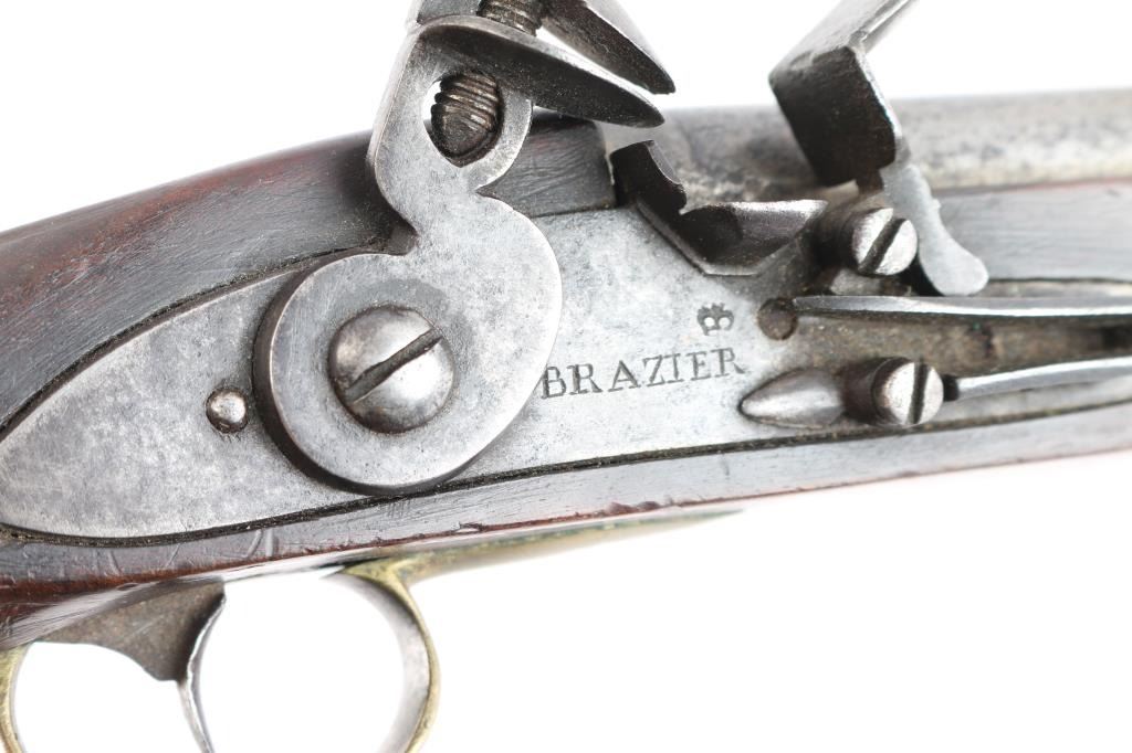 Contracted by Brazier of London with Crown proofs on luck and barrel. 12" bbl in approximately 60 cal smooth bore showing what appears to be a 19th Century American re-stocking. Simple military style plain brass mountings in very good overall condition with crisp markings and good action. Circa 1760-1780.