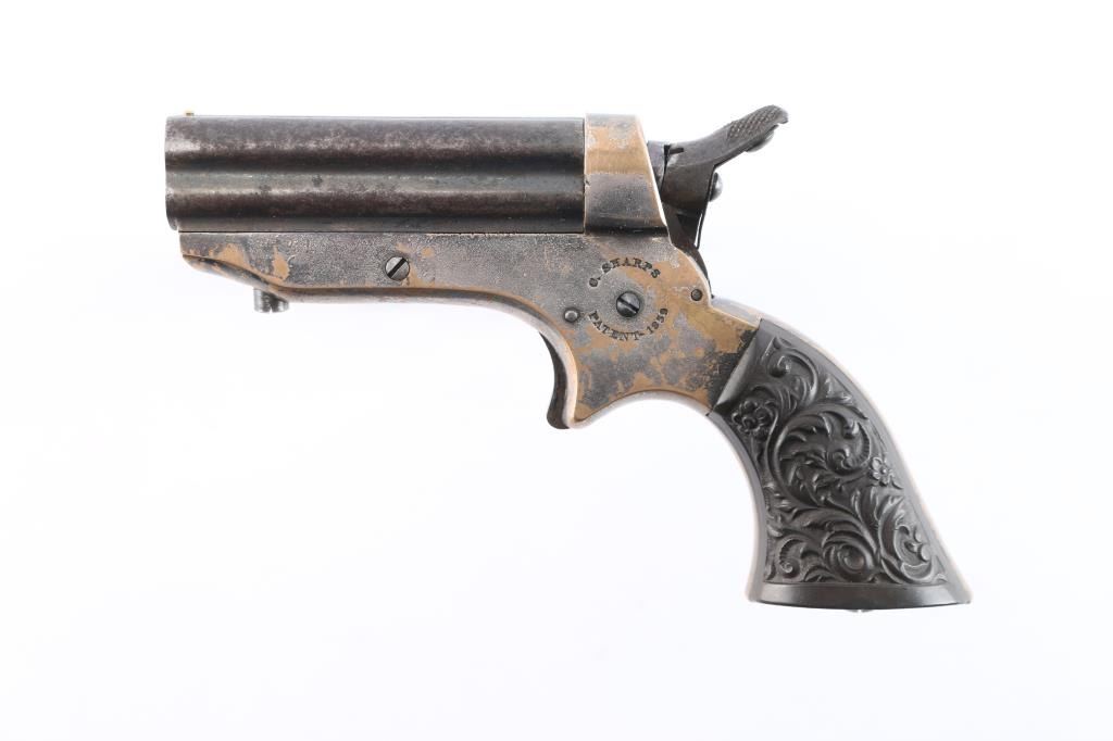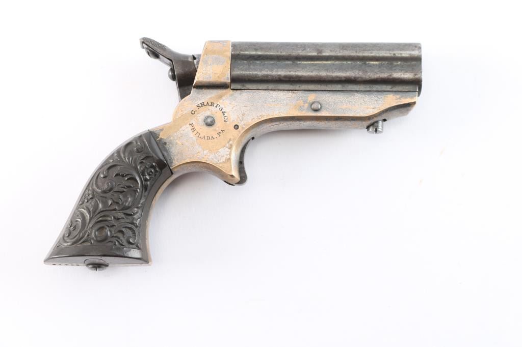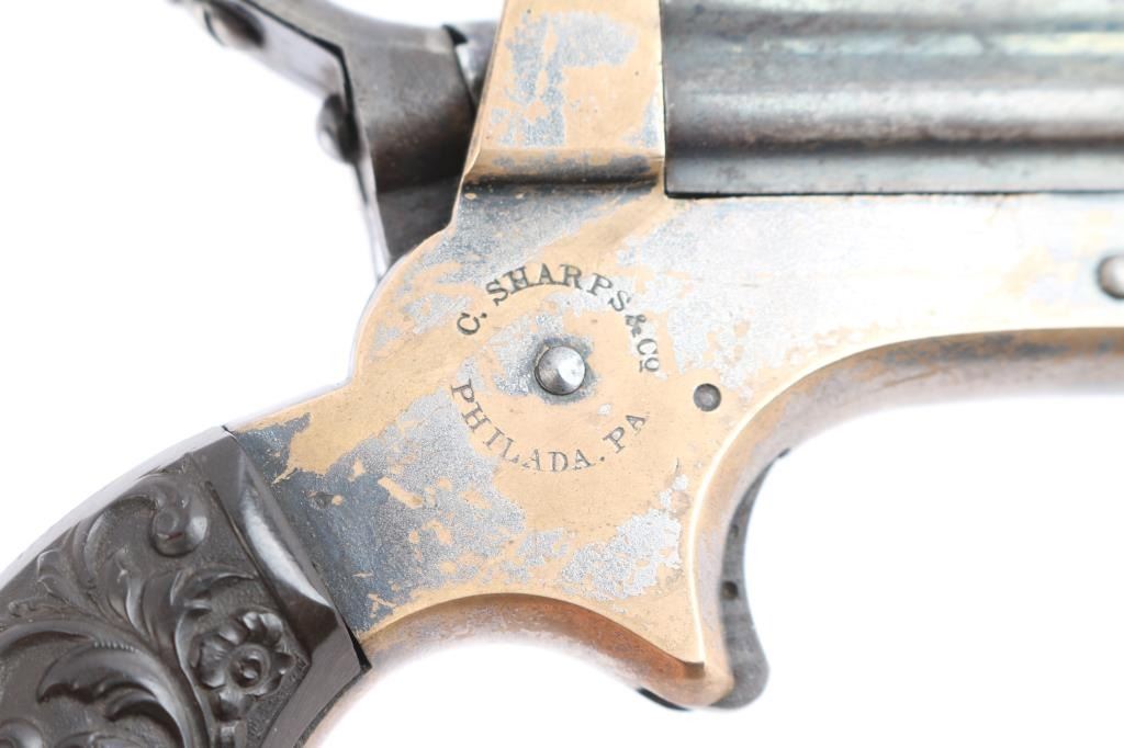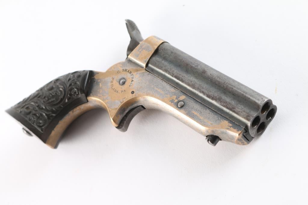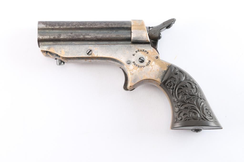 Model 1A "Pepperbox". Civil War era. Manufactured circa 1859 to 1874. Features 2 1/2" barrel assembly that slides forward to load/unload, single action spur trigger, brass bead front sight, groove rear sight, rotating firing pin. Gutta-Percha grips with floral motifs. Bores have rifling present with patches of pitting. Barrel assembly is mostly a dull blue turning a gray patina. Brass frame is about half bare gray patina. The grips are excellent, action is crisp/tight, rotating striker rotates properly. Frame marked on left side "C. SHARPS / PATENT 1859", and "C. Sharps & Co, Philada. P.A." on right. Serial number matched on heel and underside of barrels.