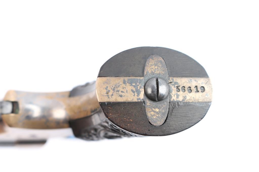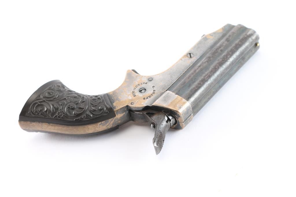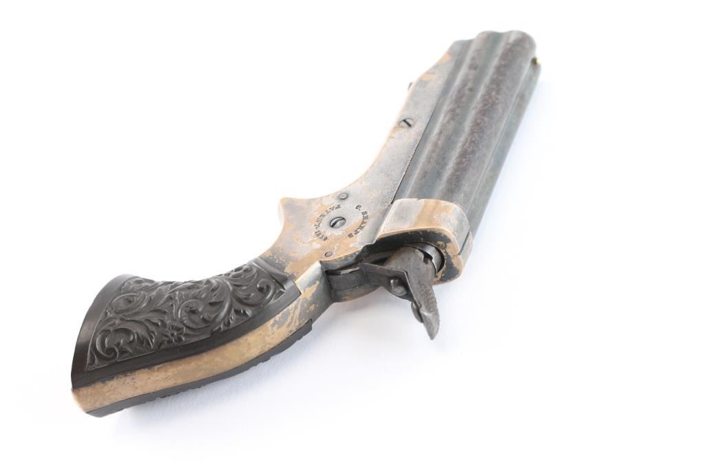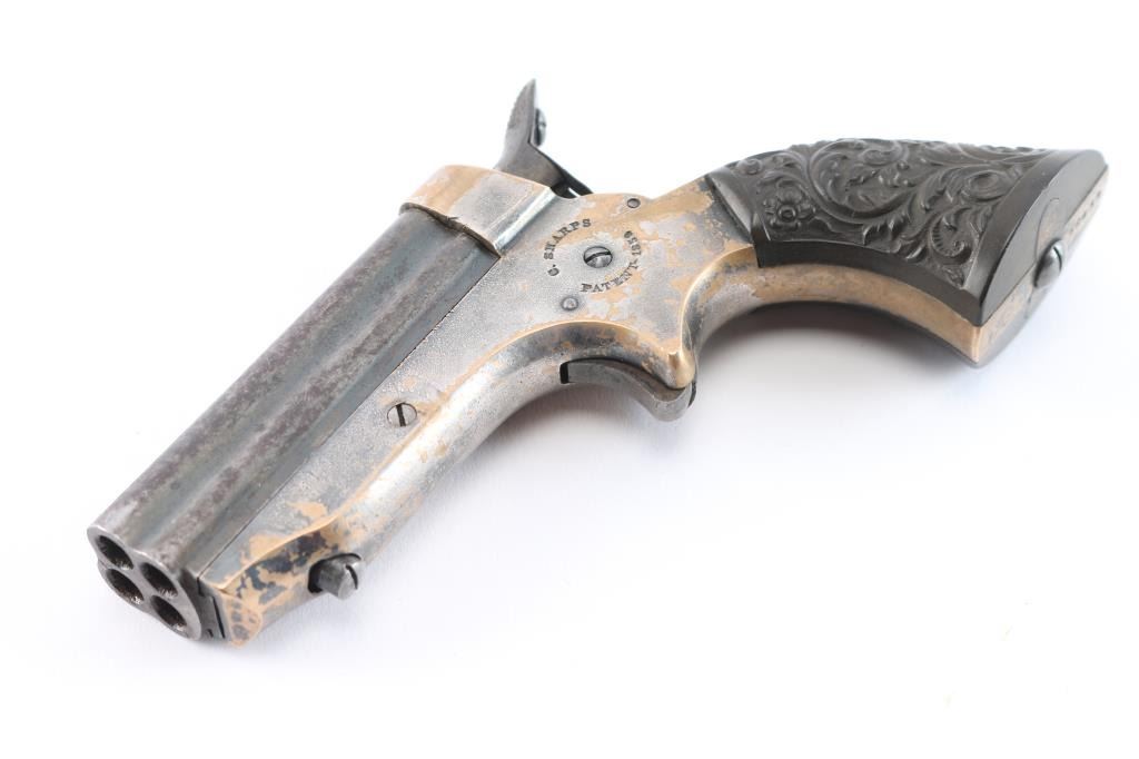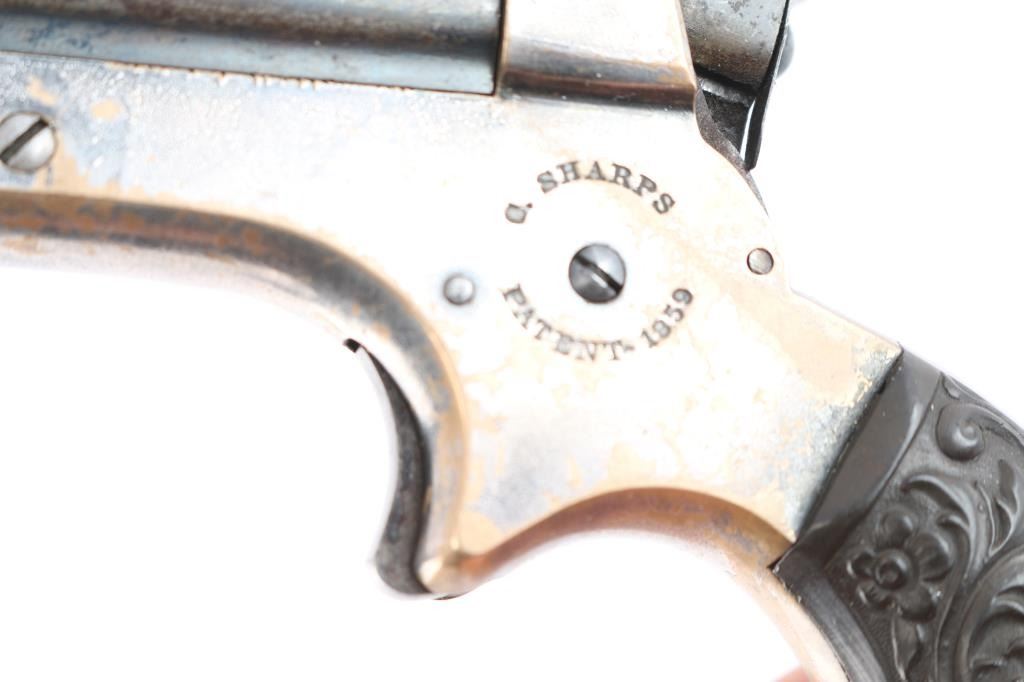 Model 1A "Pepperbox". Civil War era. Manufactured circa 1859 to 1874. Features 2 1/2" barrel assembly that slides forward to load/unload, single action spur trigger, brass bead front sight, groove rear sight, rotating firing pin. Gutta-Percha grips with floral motifs. Bores have rifling present with patches of pitting. Barrel assembly is mostly a dull blue turning a gray patina. Brass frame is about half bare gray patina. The grips are excellent, action is crisp/tight, rotating striker rotates properly. Frame marked on left side "C. SHARPS / PATENT 1859", and "C. Sharps & Co, Philada. P.A." on right. Serial number matched on heel and underside of barrels.