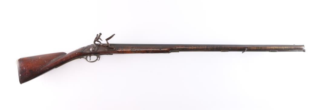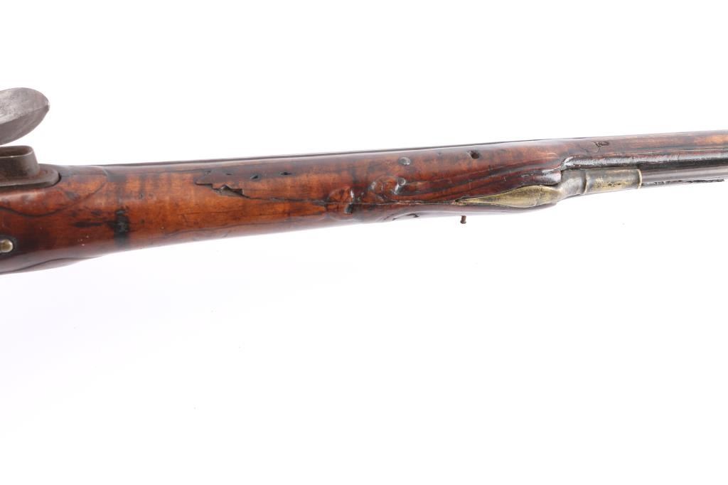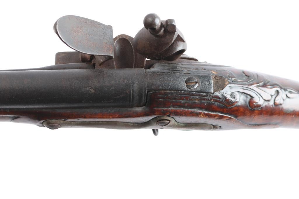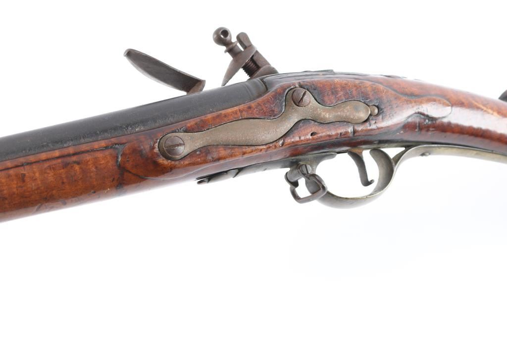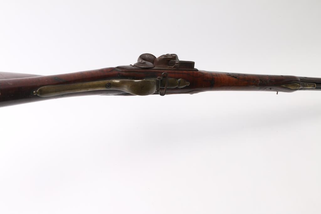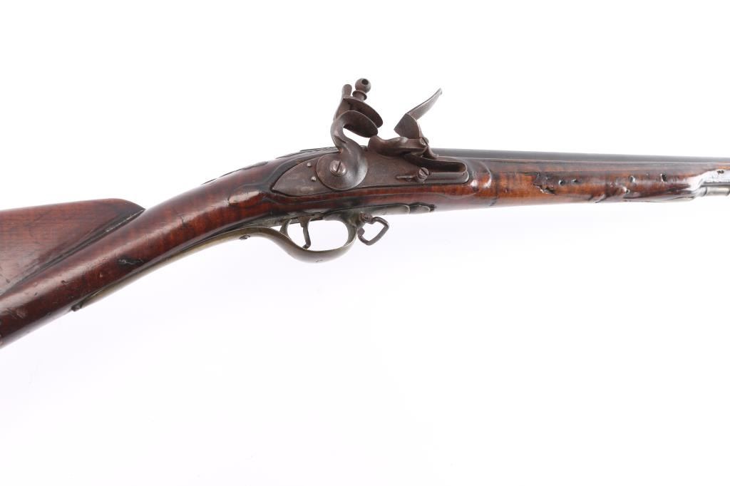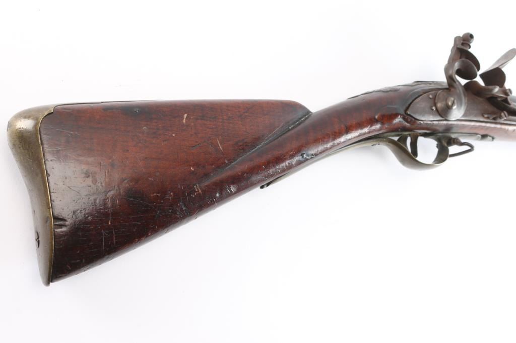 American stocked and raised, with lock, signed Bingham in script. Possibly Henry Bingham who worked in Philadelphia area and assembled committee of safety, Flintlocks circa 1775. The musket measures nearly 53" overall with 37" buttisa proofed bbl of approximately 69 cal smooth bore. A somewhat crude forged ramrod that matches gun's patina included. The bbl shows GR with crown and broad head proofs with initial "G" (1st letter illegible and light) at the left side of the breach. Brass military style mounts with revolutionary war era "S" side plate. Raised carved around the tang in a scroll motiff with good quality molding around the sideplate and around the lock and forend. The wood is distinctly American with "fiddleback" striping. The stock has had the forward 24 1/2" of the forend professionally restored from a joint at the rear thimble just ahead of the carving (good work). The rear portion of the stock is good with minor cracks, losses and aging. Sling swivels retained. The lock shows a dark brown patina matching to the barrel and original Flintlock condition with correct small parts (re-hammer, top-jaw, frizzen, spring and screws). A very attractive revolutionary war era long arm with rare raised carving.