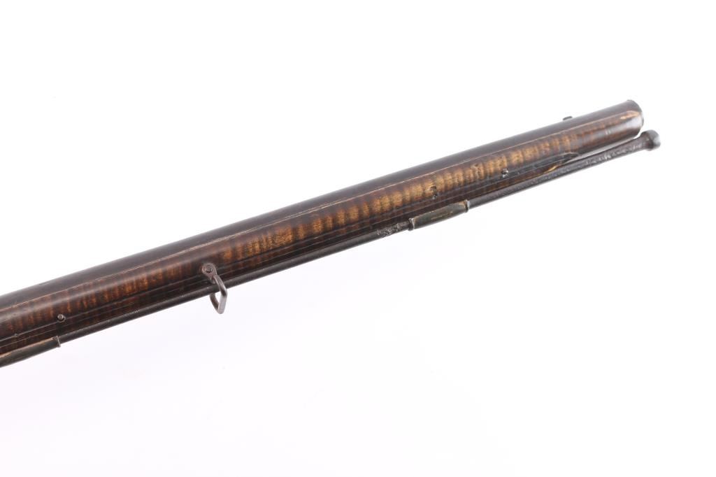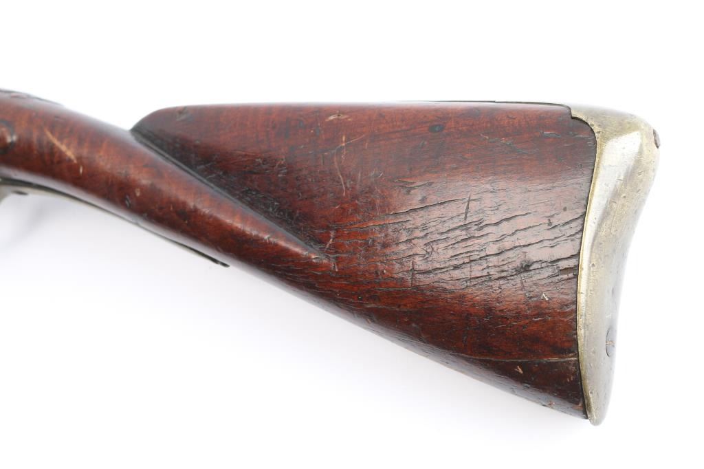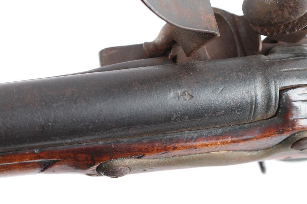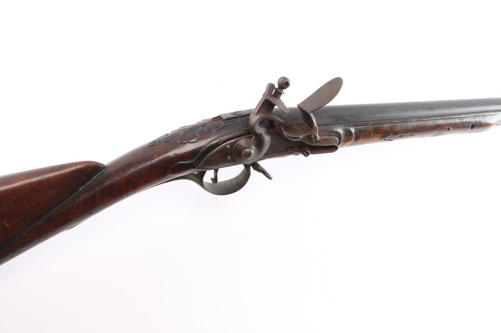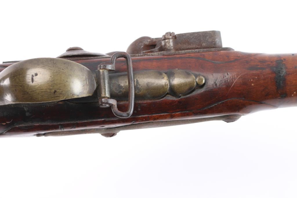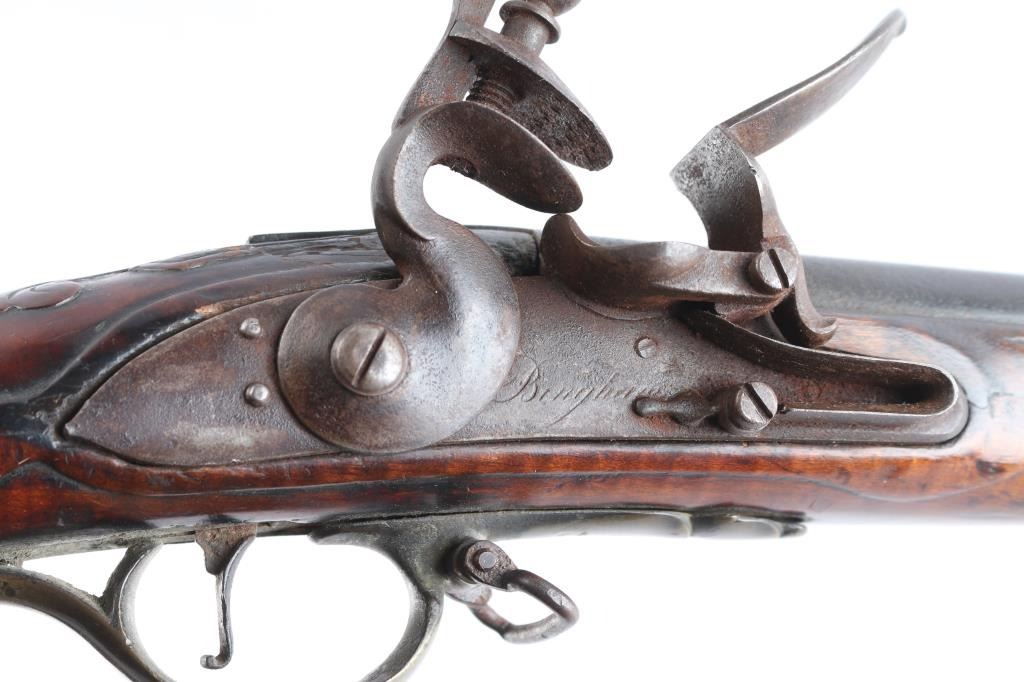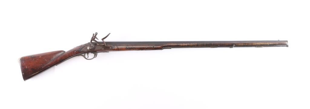 American stocked and raised, with lock, signed Bingham in script. Possibly Henry Bingham who worked in Philadelphia area and assembled committee of safety, Flintlocks circa 1775. The musket measures nearly 53" overall with 37" buttisa proofed bbl of approximately 69 cal smooth bore. A somewhat crude forged ramrod that matches gun's patina included. The bbl shows GR with crown and broad head proofs with initial "G" (1st letter illegible and light) at the left side of the breach. Brass military style mounts with revolutionary war era "S" side plate. Raised carved around the tang in a scroll motiff with good quality molding around the sideplate and around the lock and forend. The wood is distinctly American with "fiddleback" striping. The stock has had the forward 24 1/2" of the forend professionally restored from a joint at the rear thimble just ahead of the carving (good work). The rear portion of the stock is good with minor cracks, losses and aging. Sling swivels retained. The lock shows a dark brown patina matching to the barrel and original Flintlock condition with correct small parts (re-hammer, top-jaw, frizzen, spring and screws). A very attractive revolutionary war era long arm with rare raised carving.